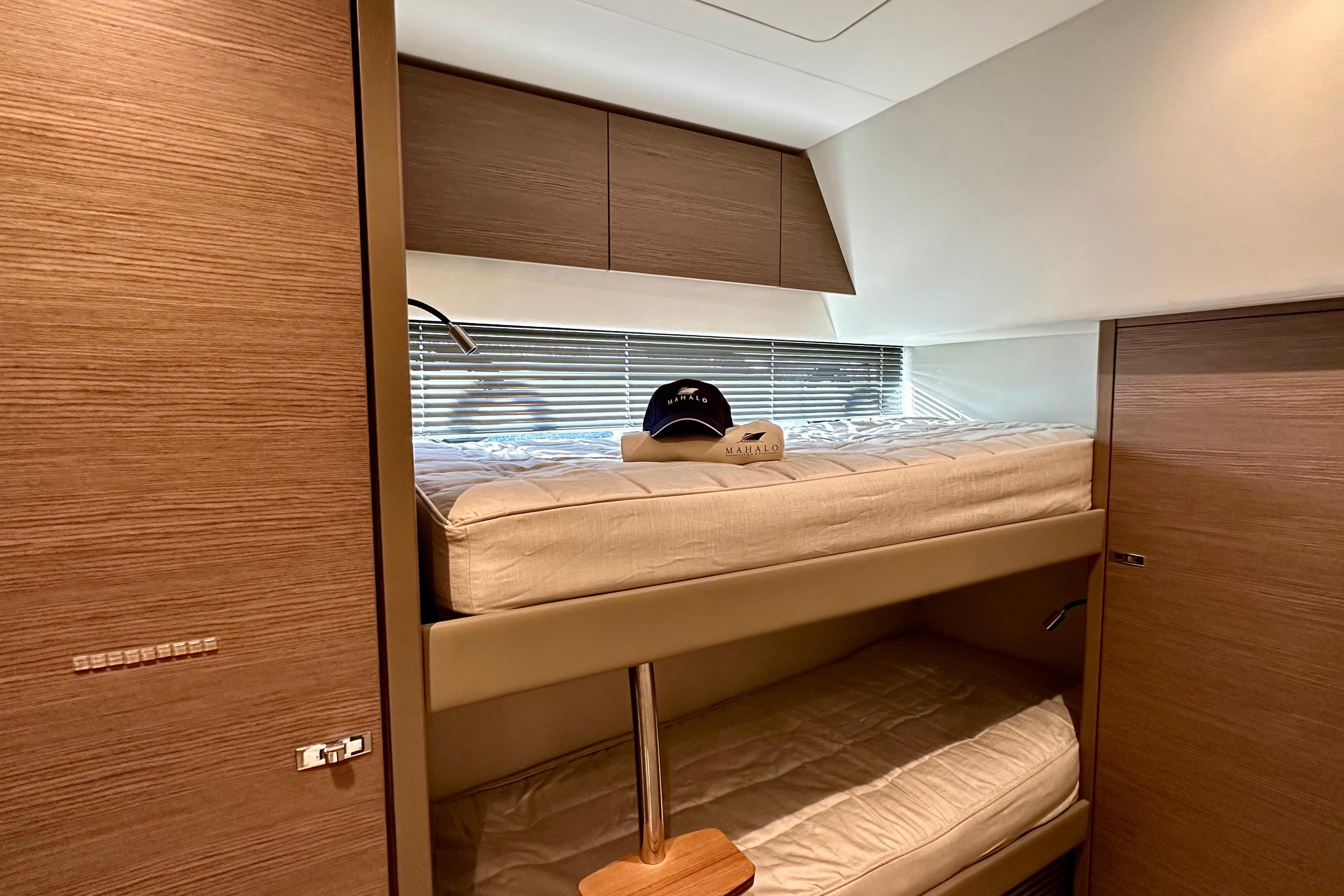 Below deck, there is spacious accommodation for up to six guests across three beautifully appointed cabins, including an impressive full-beam master stateroom with a large double bed – thanks to the space created within the resin-infused deep-V hull of this craft.