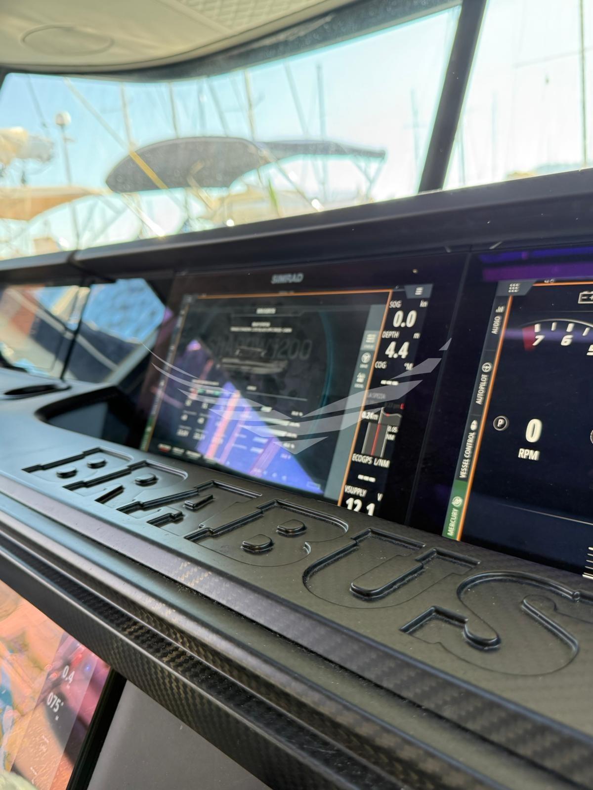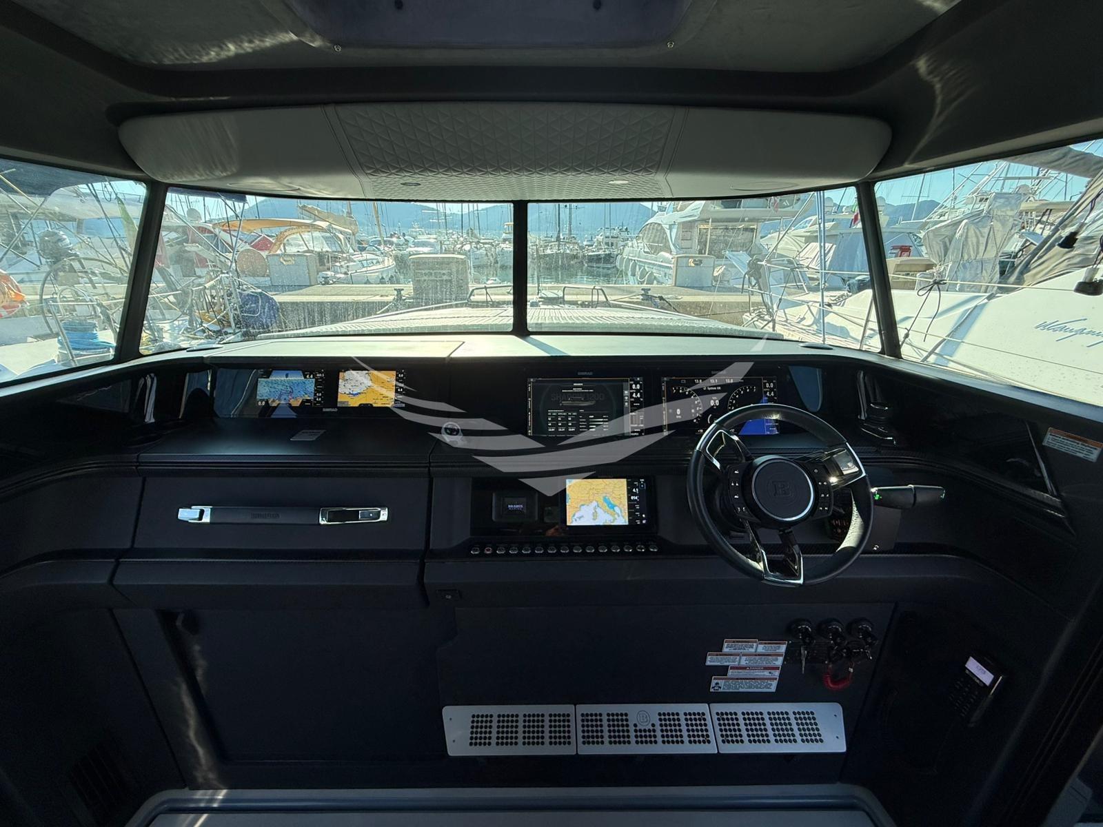 AIS, Angolo barra, Antenna radar, Comando motori elettronico, Contametri catena, Display (information con due schermi addizionali da 7''), Joystick (Mercury), Luci di navigazione, Monitor dei consumi, 5 Plotter, Plotter con antenna GPS, Sedile Copilota, Sistema di posizionamento dinamico, Yacht controller.