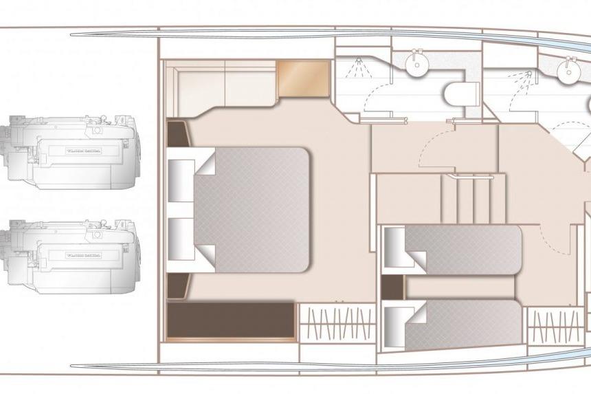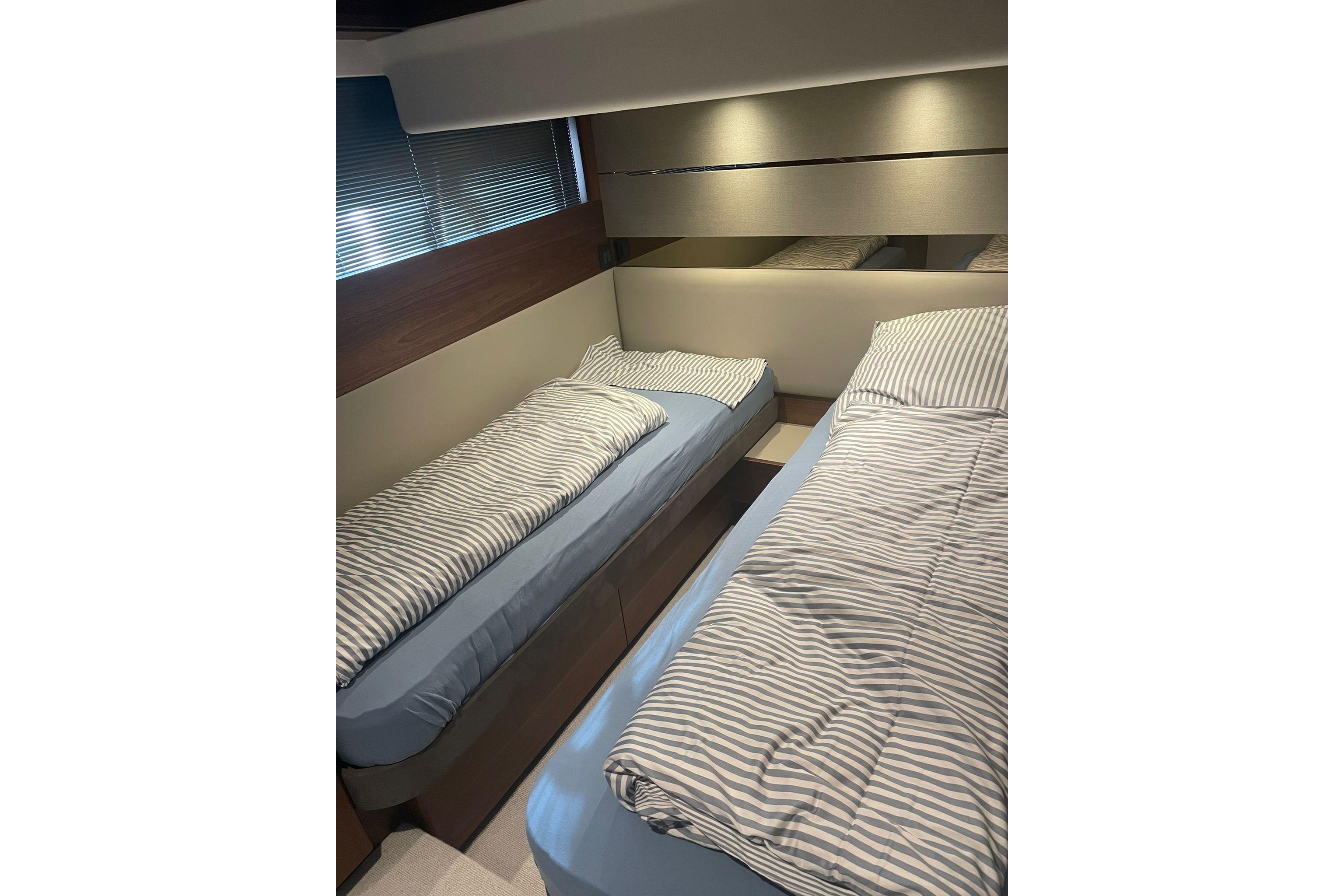 Unter Deck finden bis zu sechs Gäste komfortable Kojen. Die Eignerkabine über die volle Schiffsbreite verfügt über ein eigenes Bad und hochwertige Ausstattung. Zwei weitere Gästekabinen – eine mit umwandelbaren Twin-Betten – sorgen für Flexibilität. Eine separate Crewkabine mit Bad ist ebenfalls vorhanden.
