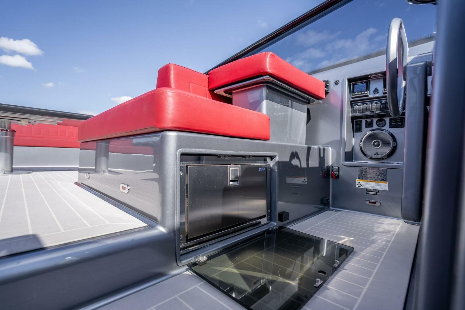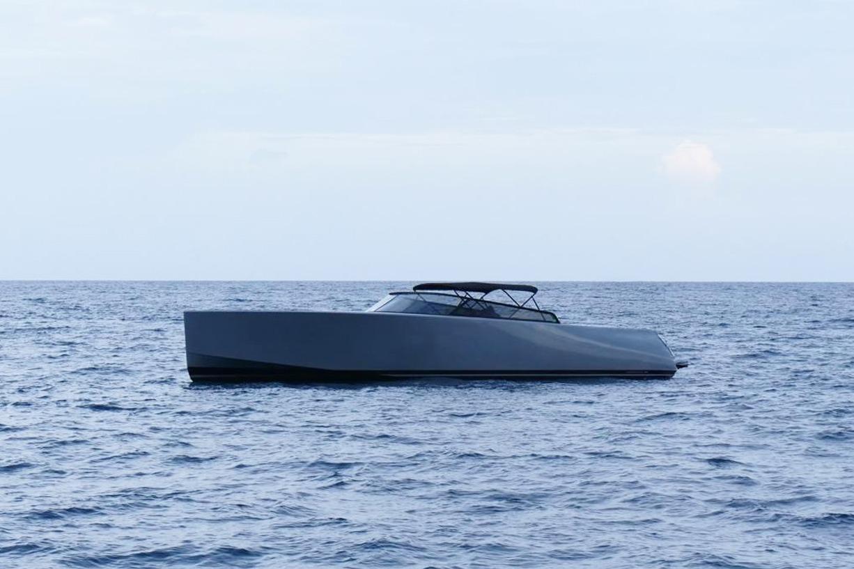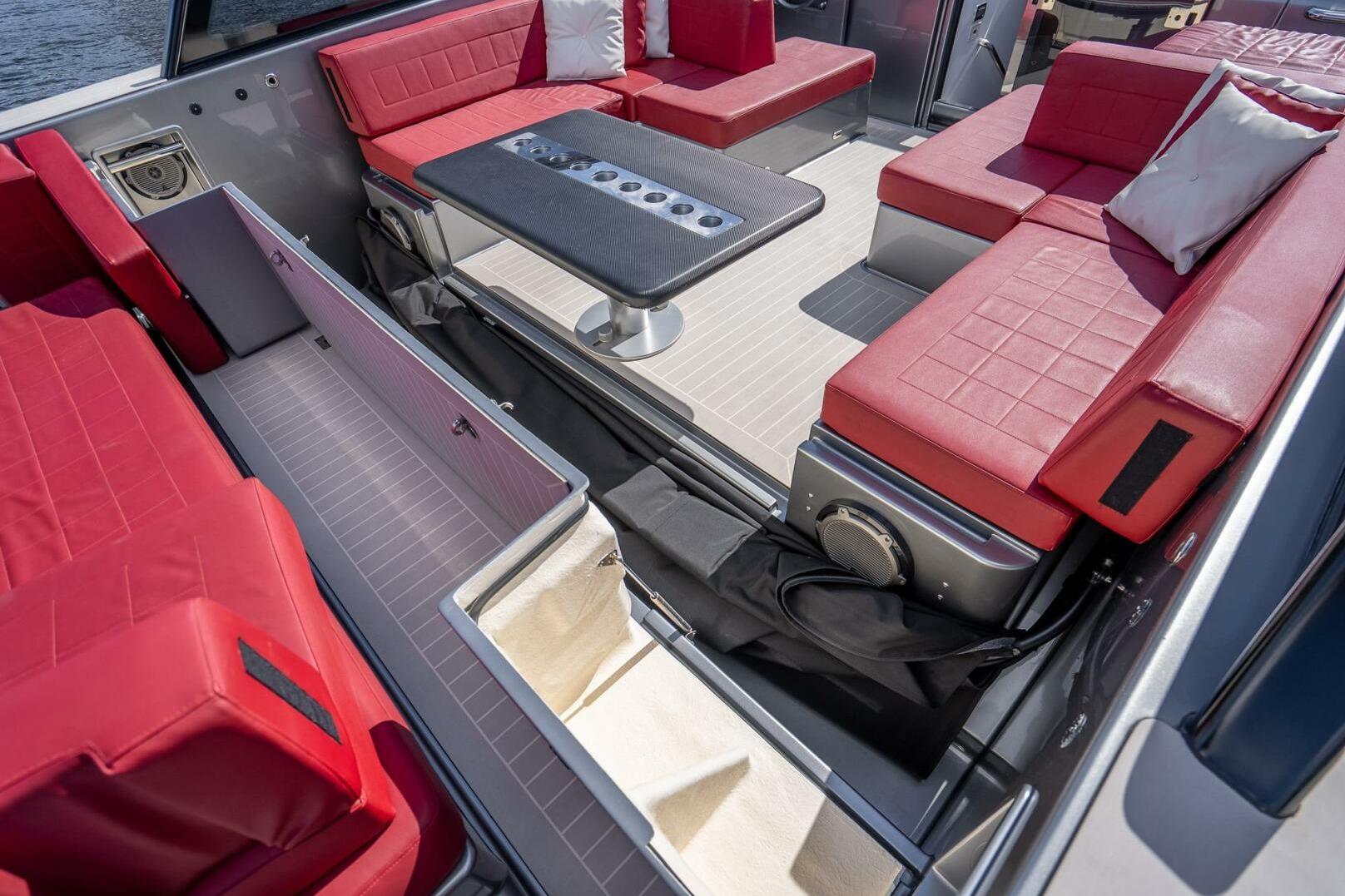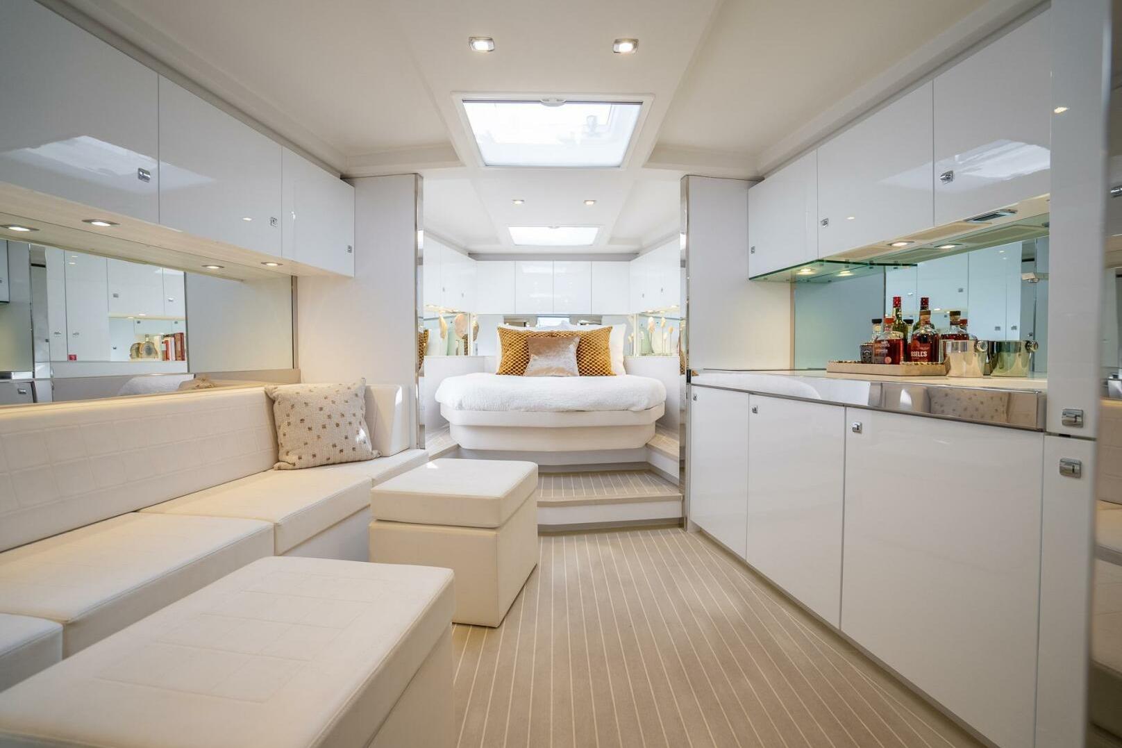 Below deck, the interior showcases VanDutch’s signature modern aesthetic, with clean lines, premium materials, and meticulous craftsmanship. The cabin includes a spacious lounge area, full galley, and comfortable sleeping accommodations for overnight stays. Climate control, premium sound, and high-end finishes complete the luxurious onboard experience.