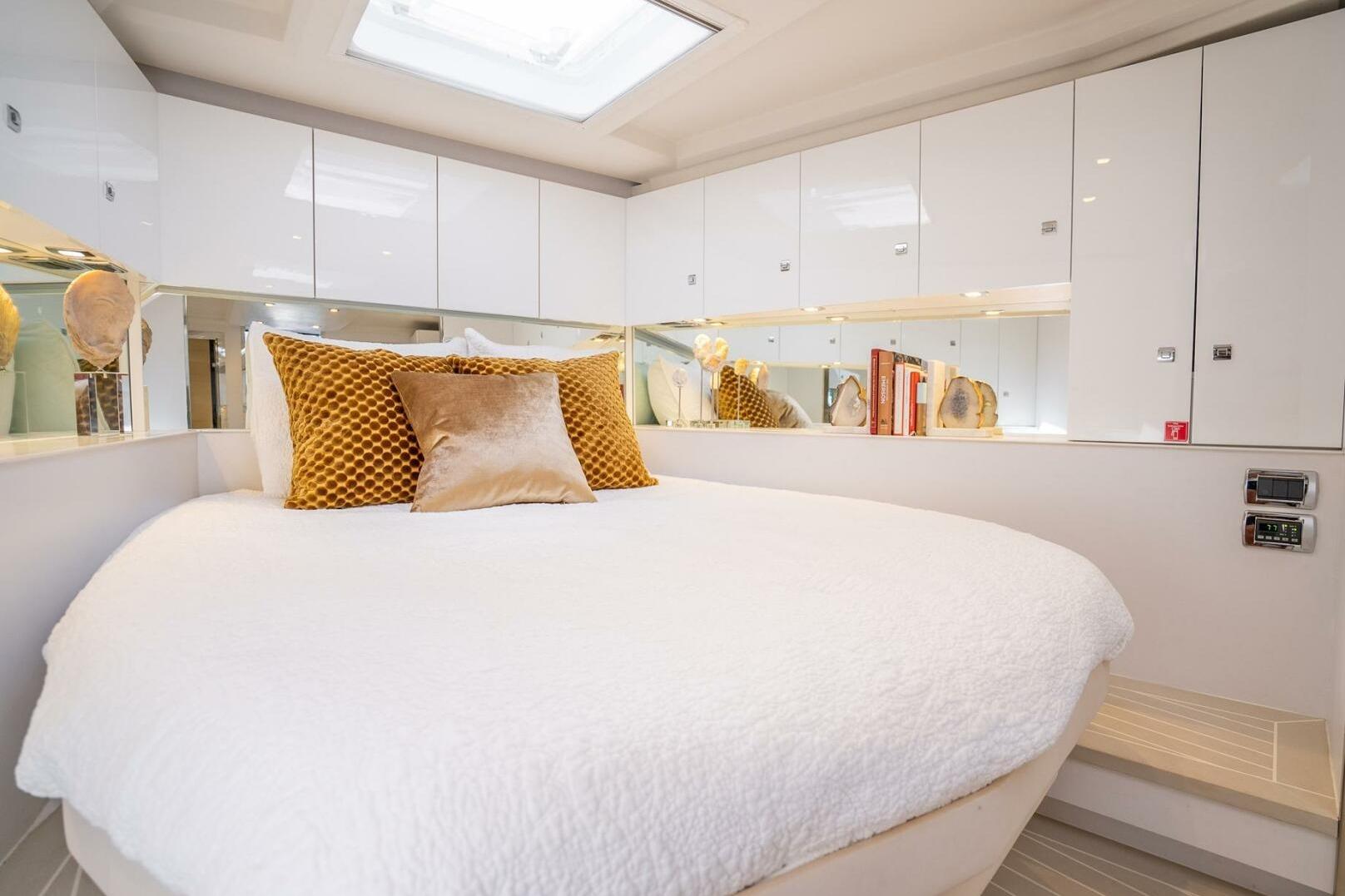 The expansive open deck layout offers both versatility and sophistication, ideal for entertaining guests, sunbathing, or enjoying quiet evenings on the water. Aft sunpads, a stylish cockpit with wrap-around seating, and a retractable Bimini top create a social, resort-style atmosphere.