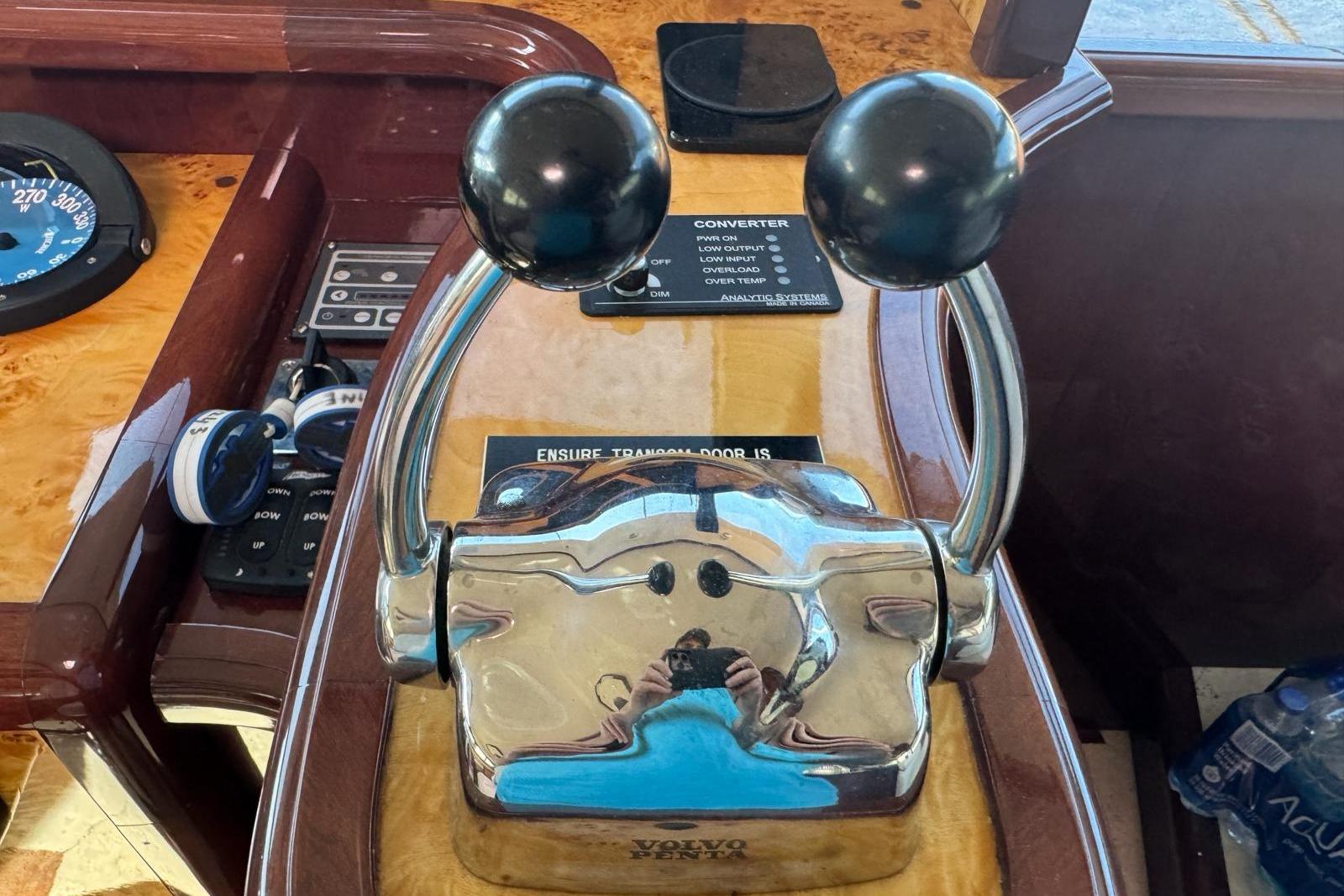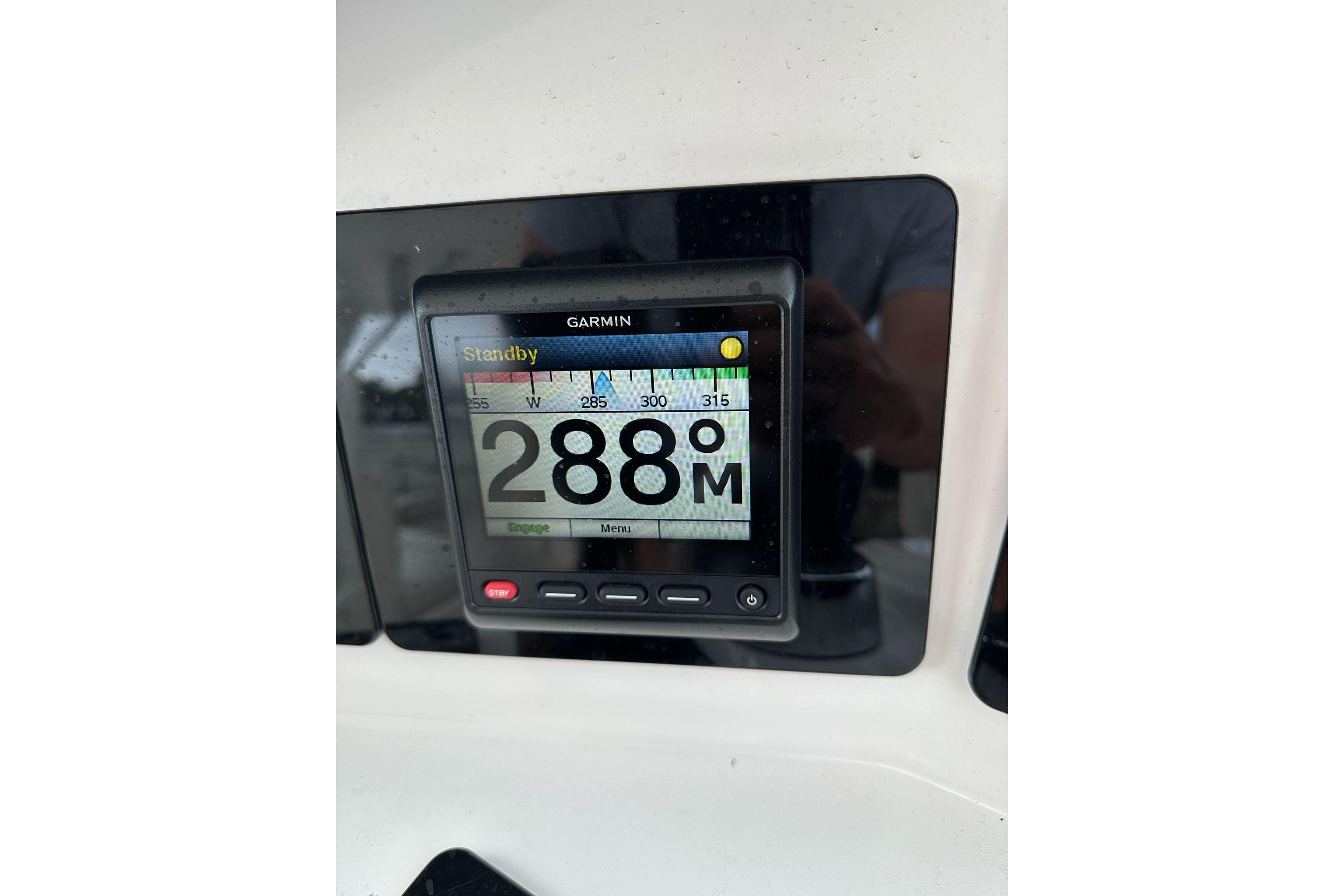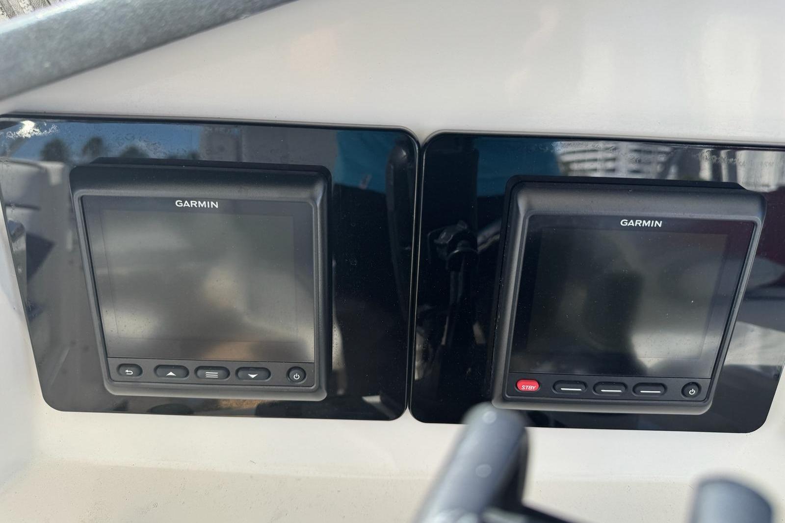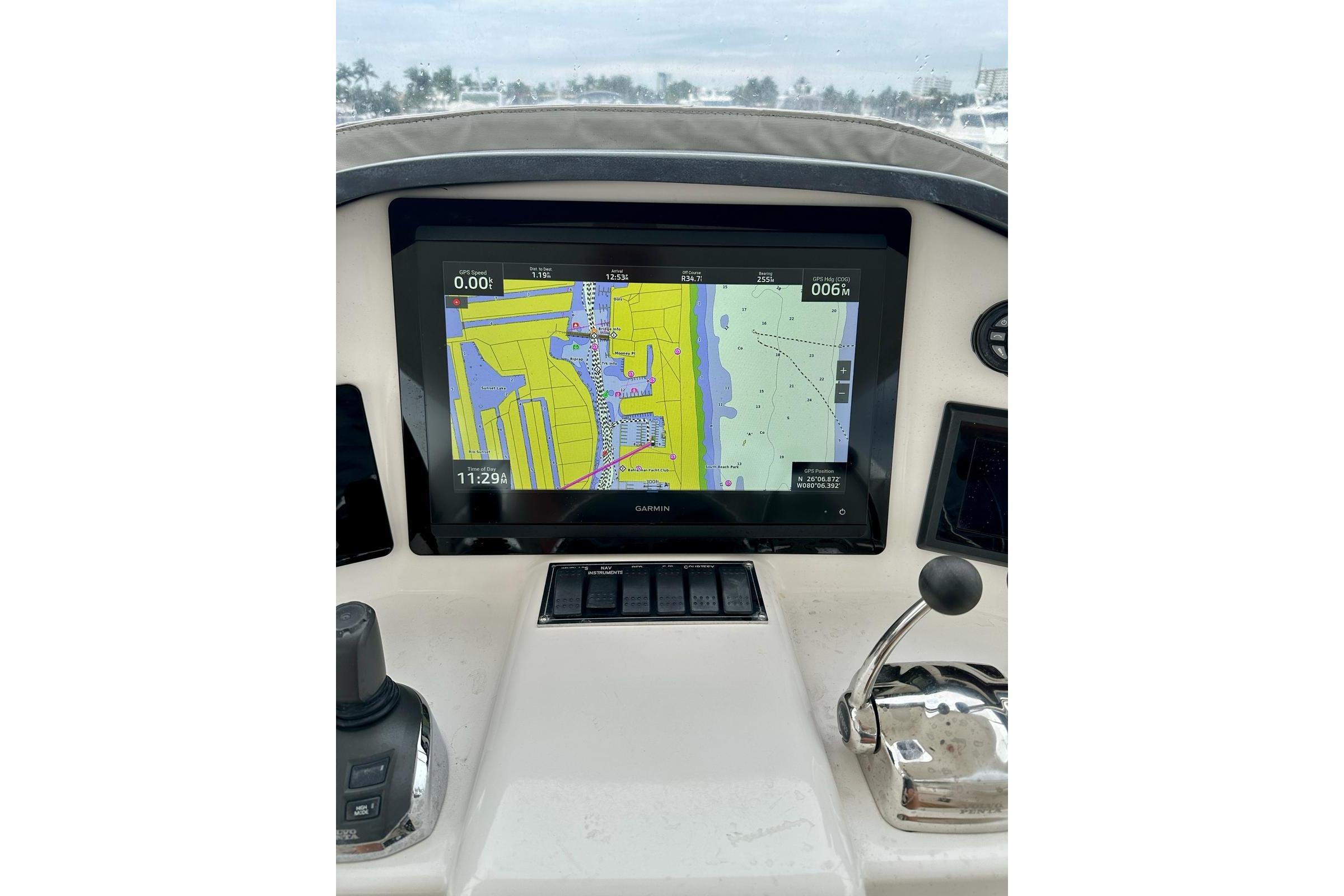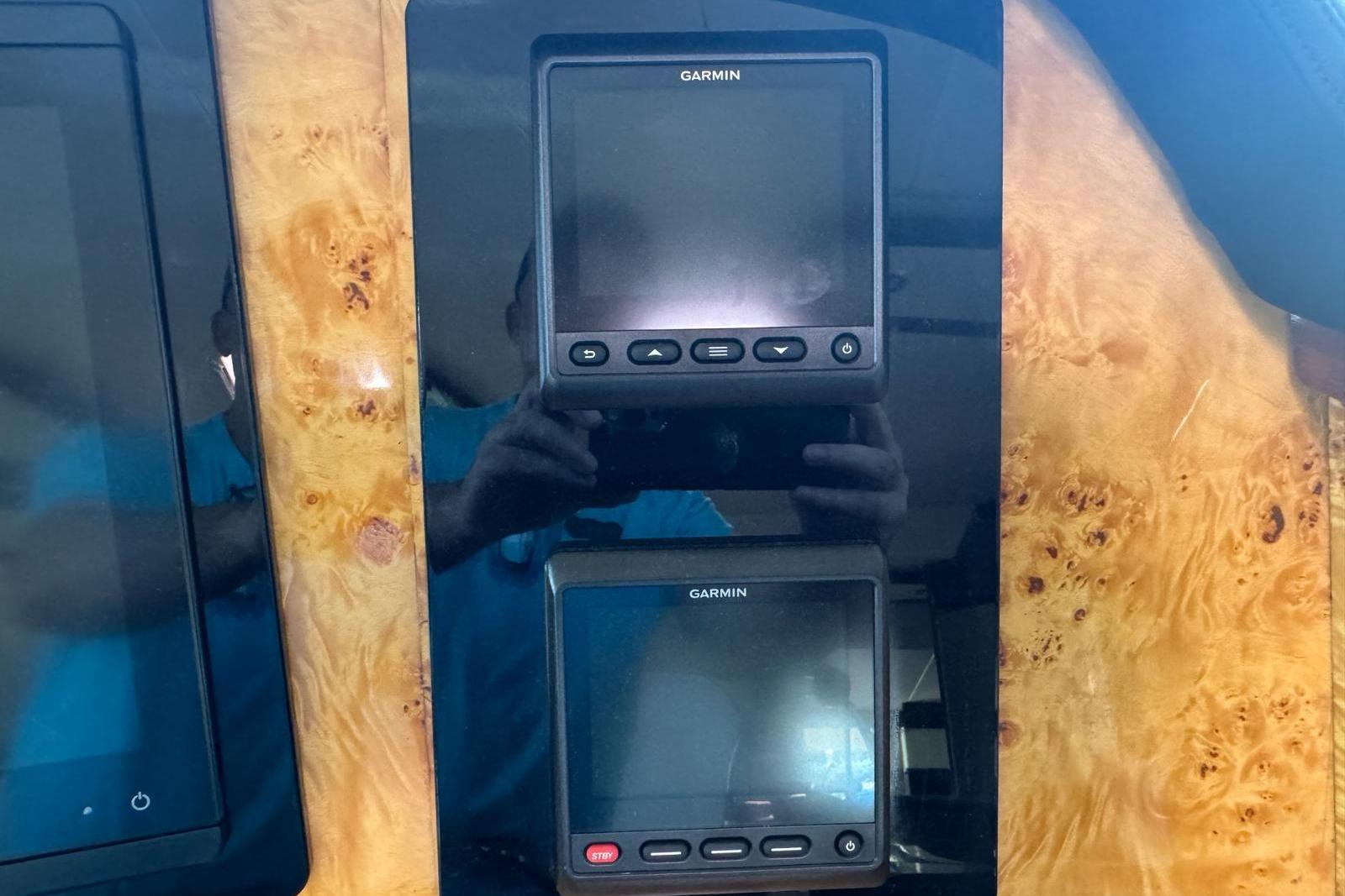 In 2022, the yacht’s navigation systems were fully upgraded to Garmin electronics, including dual Garmin 8616 multifunction displays (MFDs), autopilot, and full Volvo LCD engine displays at both the flybridge and lower helm stations. The yacht is equipped with three joystick docking stations—flybridge, salon, and aft port side—for precise and effortless maneuvering.