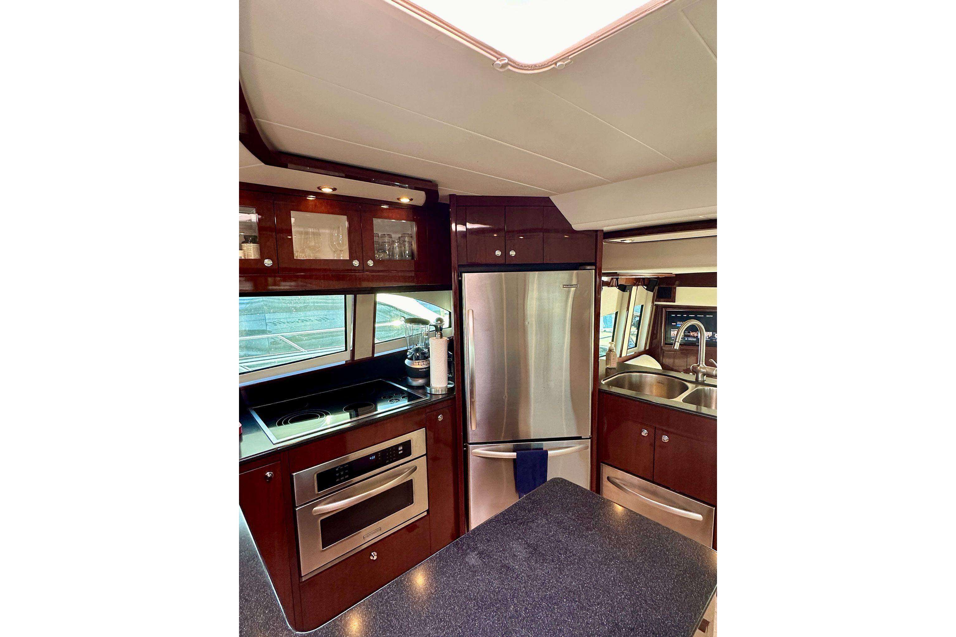 The galley is fully equipped with a suite of KitchenAid appliances, including a full-size refrigerator with bottom freezer, glass cooktop, drawer dishwasher, and a combination microwave/oven. A Whirlpool stacked, front-loading washer and dryer is conveniently located in the companionway.