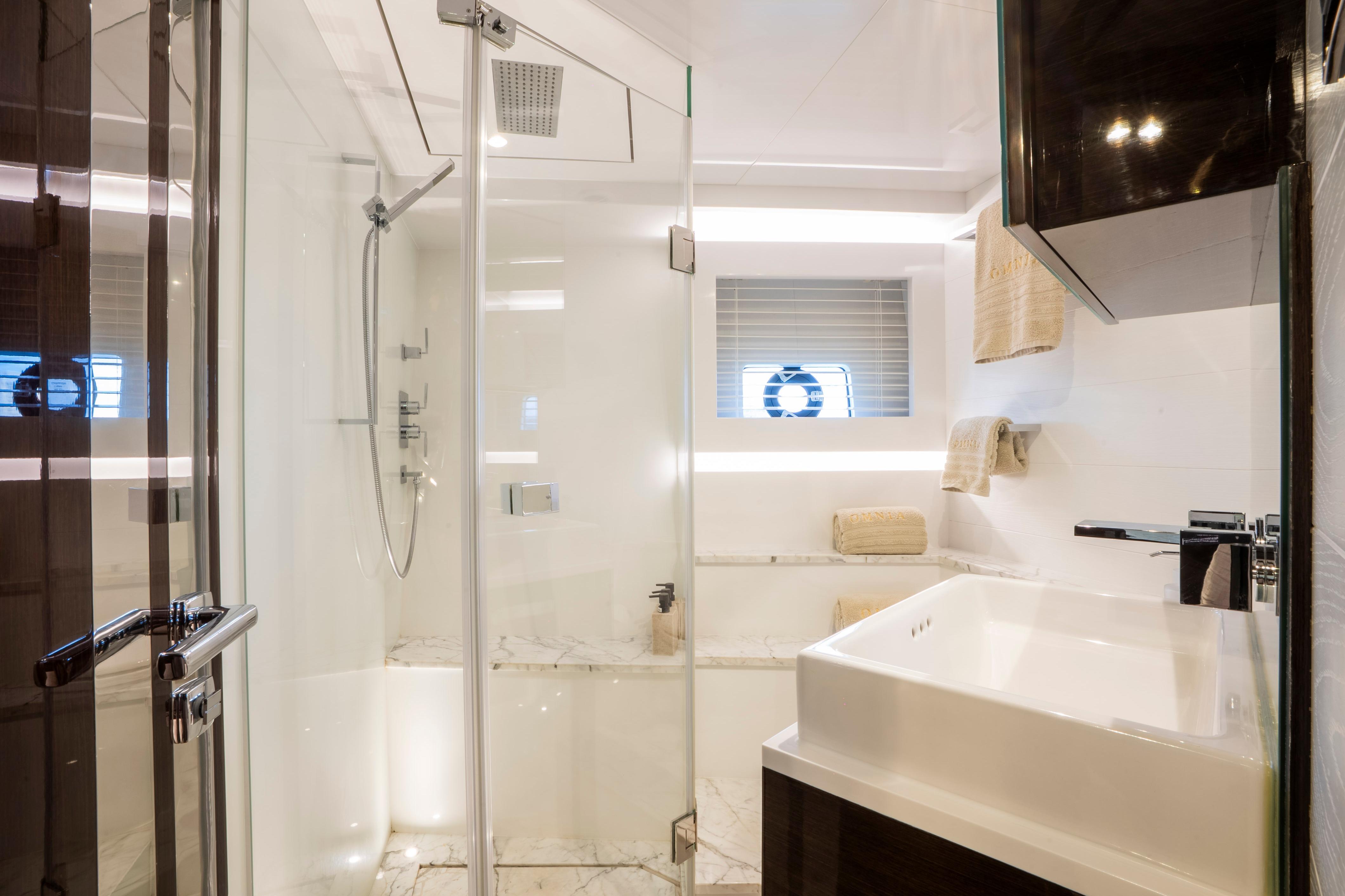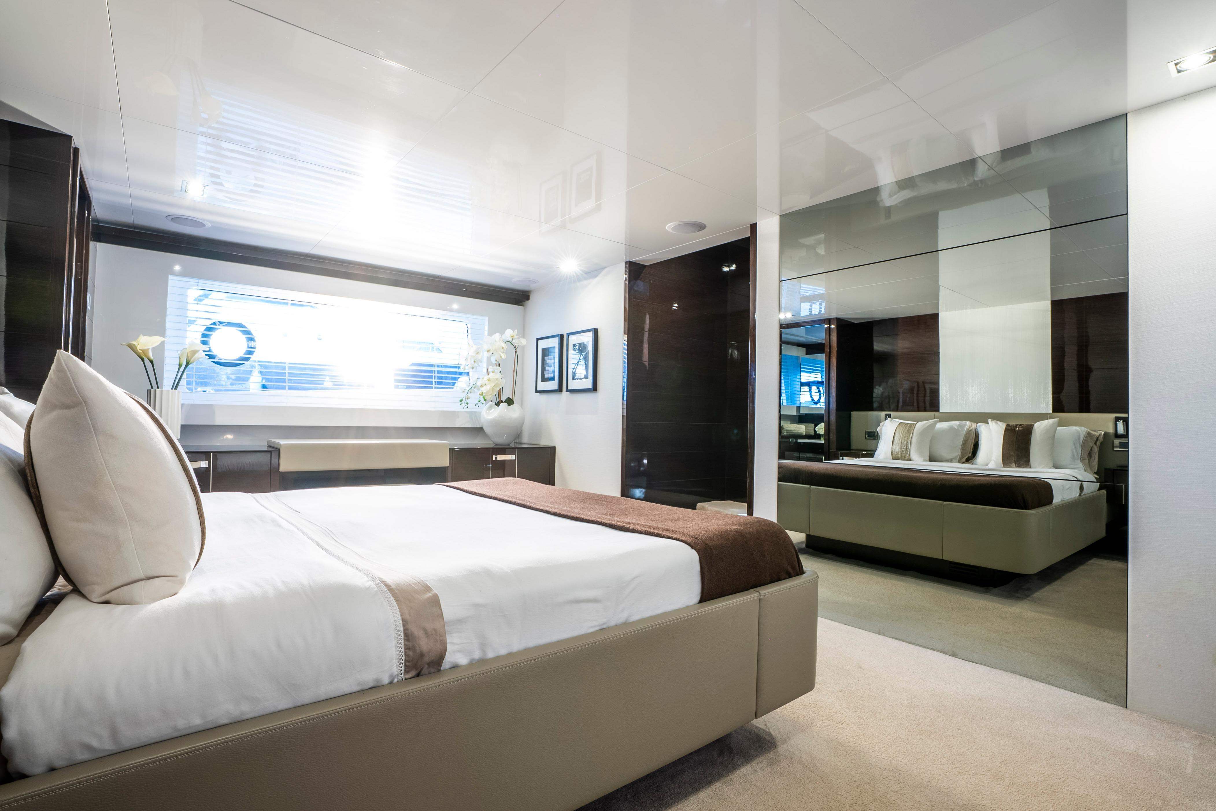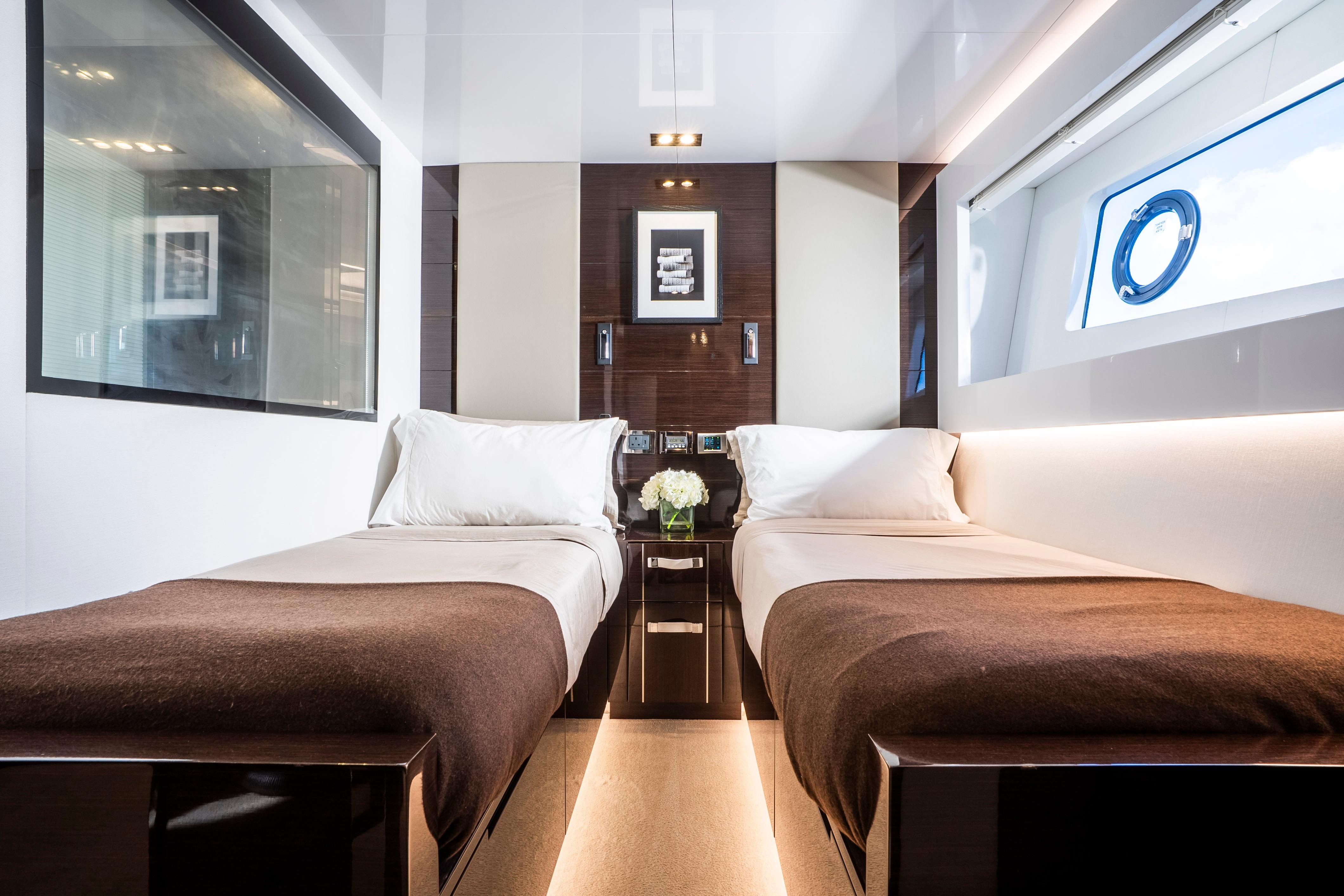 Accommodation is for eight guests in four cabins: a full-beam master suite, a forward VIP, and two convertible twins. Crew quarters sleep two.