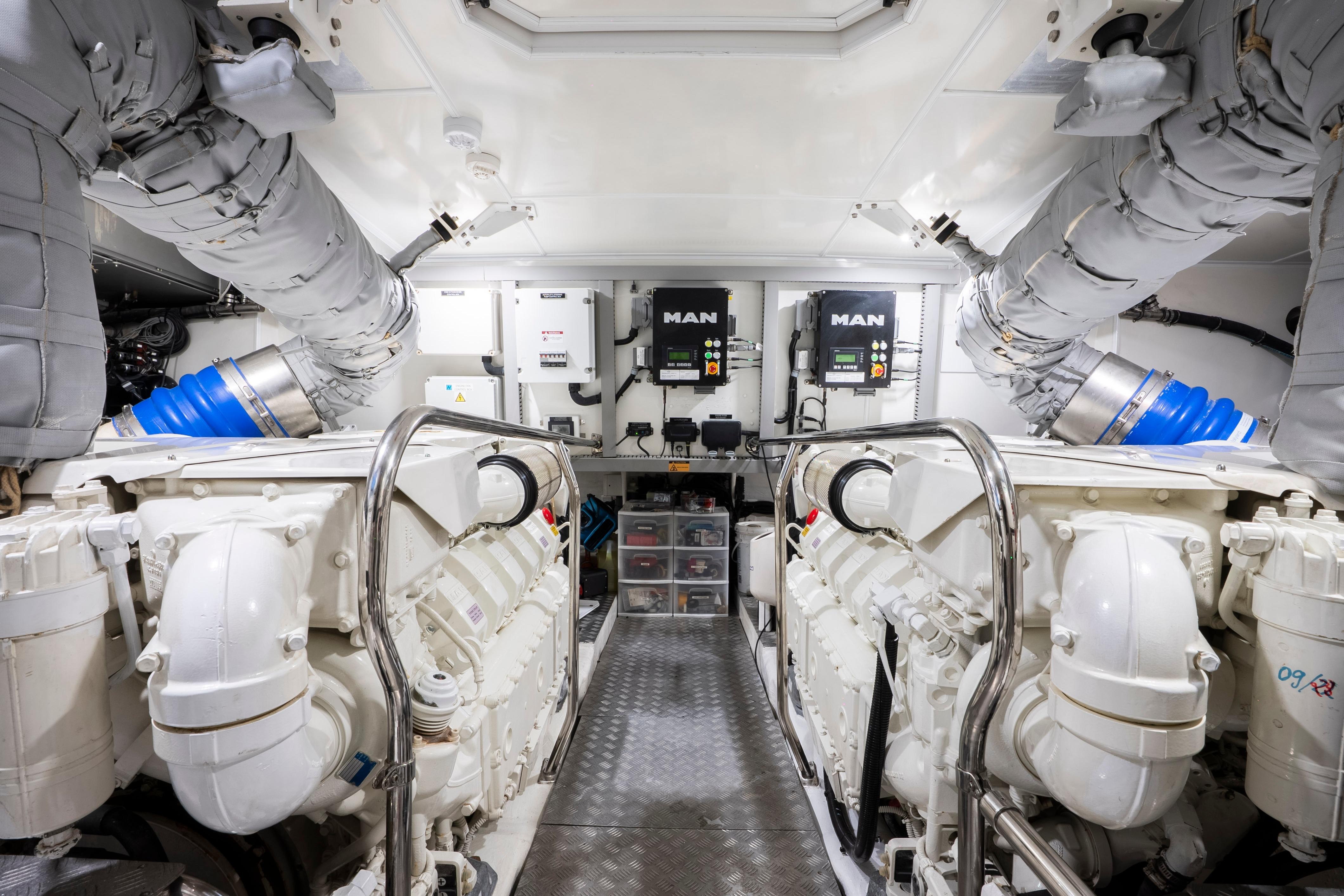 Powered by twin MAN V12 engines, she cruises at 25 knots with a top speed of 32 knots. She’s fitted with a Seakeeper SK16 gyro stabilizer, hydraulic thrusters, and tropical air conditioning rated for up to 40°C.