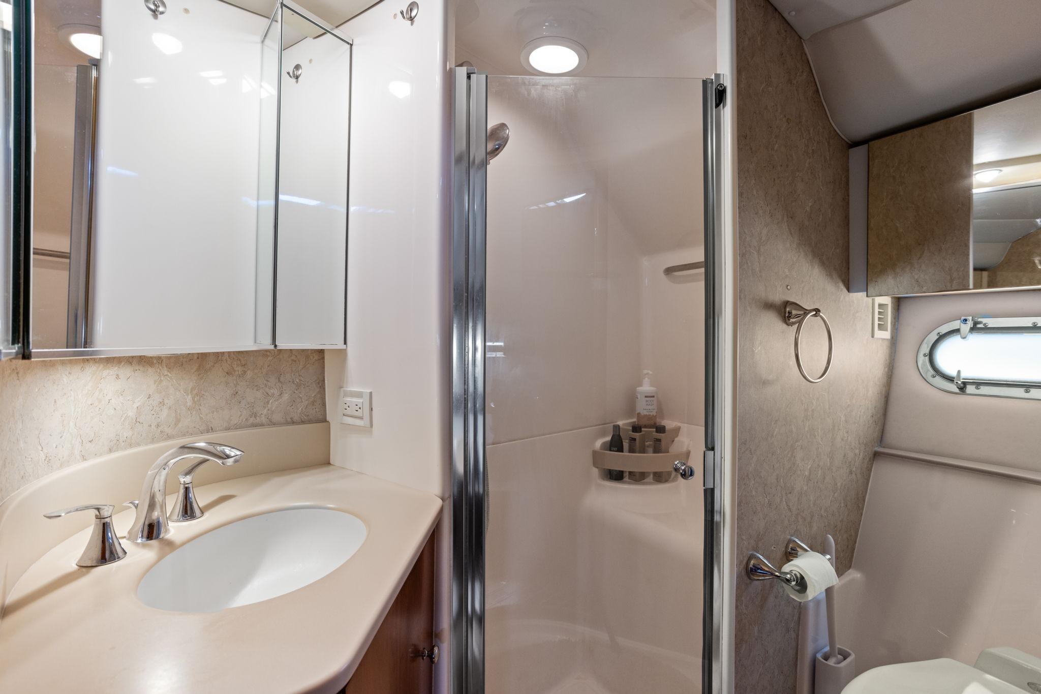 Several design features place the Tiara 5200 Express in a unique category apart from its competitors. Above deck, two large bench seats surround a removable table in the cockpit. The unique dual transom doors provide access to a spacious swim platform that easily holds a personal watercraft or tender. A crane that hides away completely when not in use also serves as a passarelle for easy boarding. The main deck features Tiara's trademark standup helm. A vast expanse of glass surrounds helm for excellent visibility to all quarters. In the cabin, the same socializing spaciousness continues. The main salon features a pair of opposing seating areas. The one to port is U-shaped and built around the pedestal dining table. On the starboard side, an L-shaped lounge compliments the built-in entertainment center. There is a full galley, complete with all the appliances and counter space to prepare a meal in grand style. The 5200 Express has two staterooms. The master forward has a queen-size pedestal bed that's accessible from three sides. The guest cabin can be configured with double twin-size berths or as a king with the use of an insert. Both sleeping areas have access to their own heads, complete with stall showers. The boat is full of amenities, creature comforts and surprises, like the placement of the washer / dryer under the cabin steps. Of course, the handling of the 5200 Express is everything one would expect in a Tiara. The hull design is built to take on the weather and bring passengers home safely. A merger of function and style resulted in a bow flair that all but eliminates spray and softens the ride.
