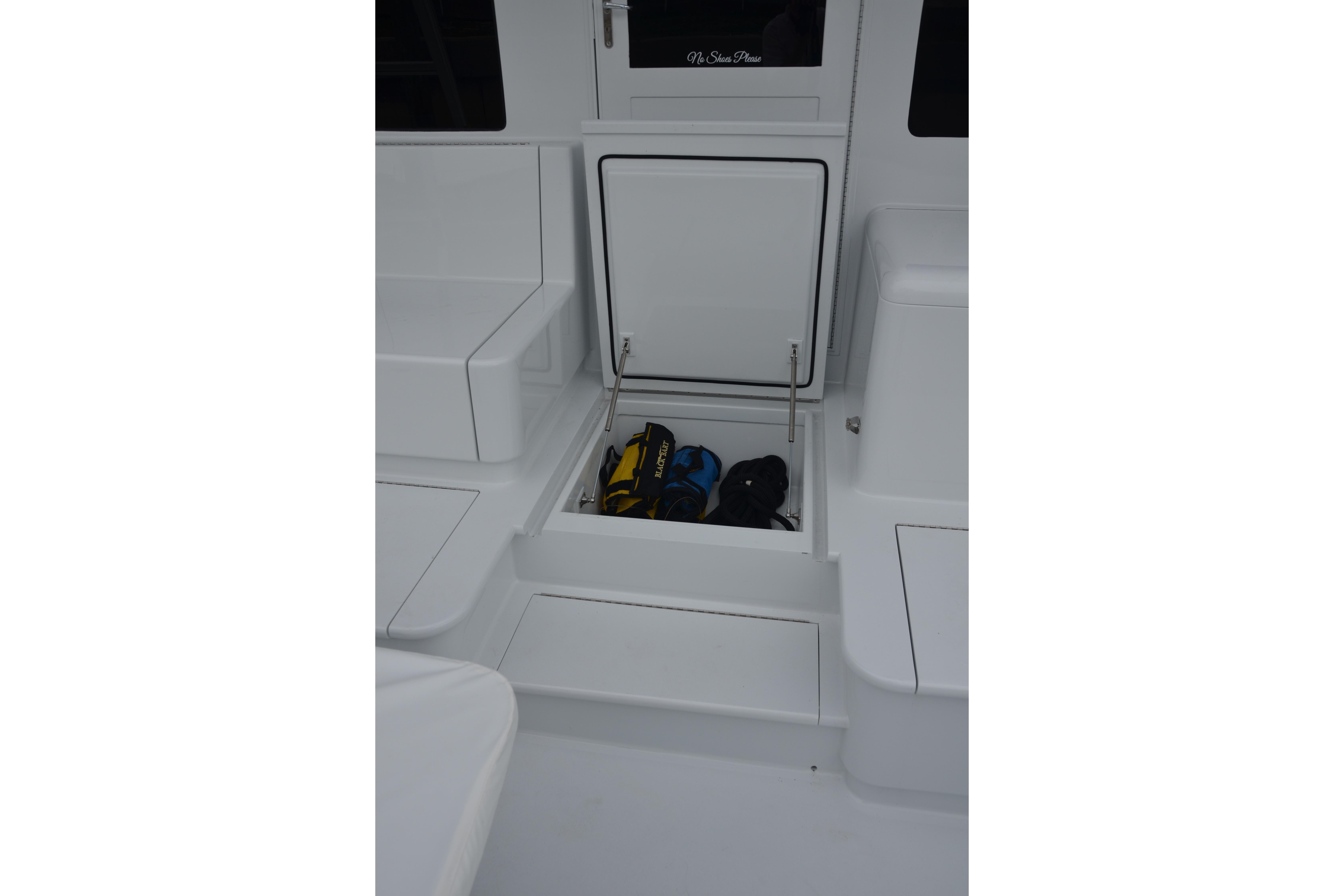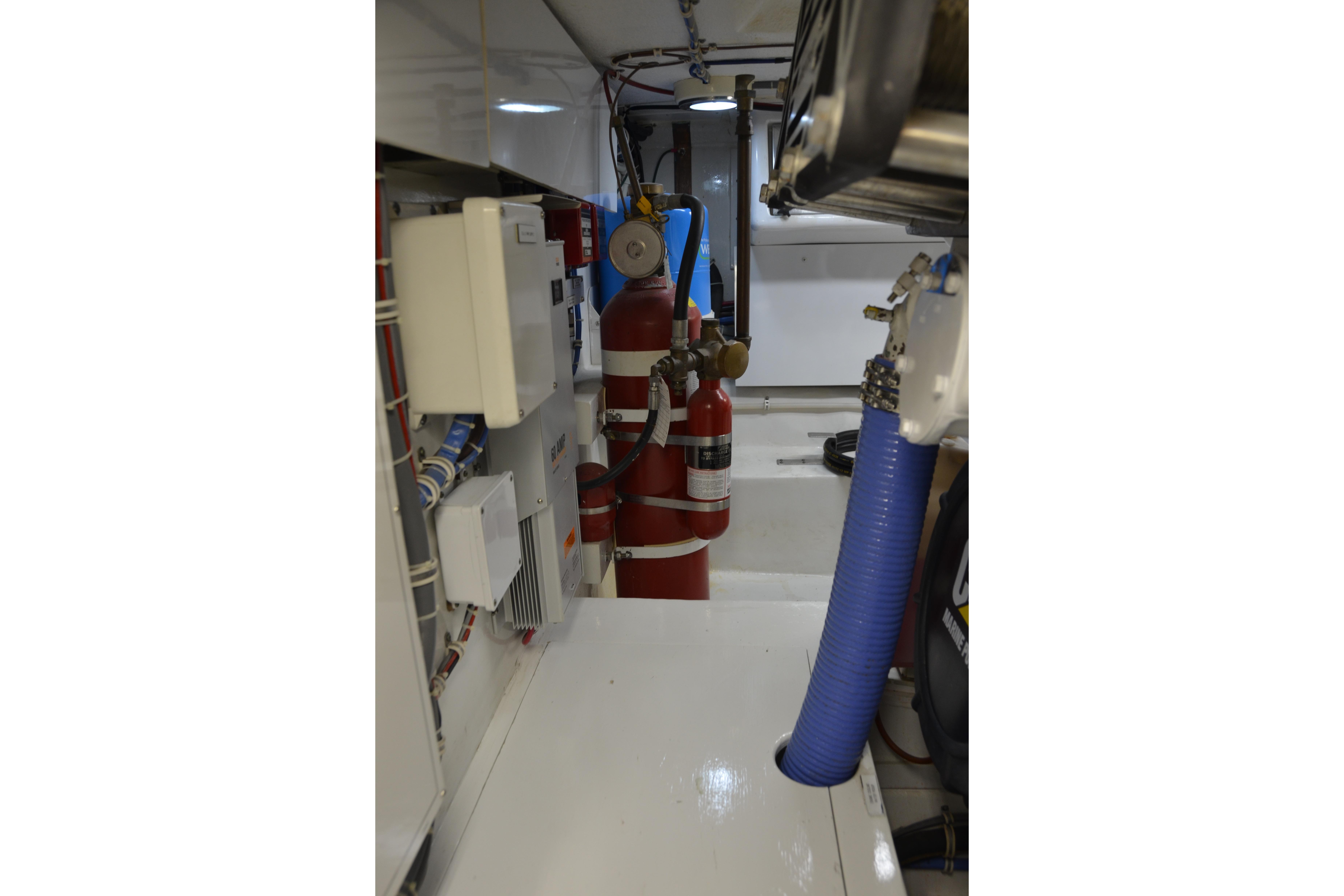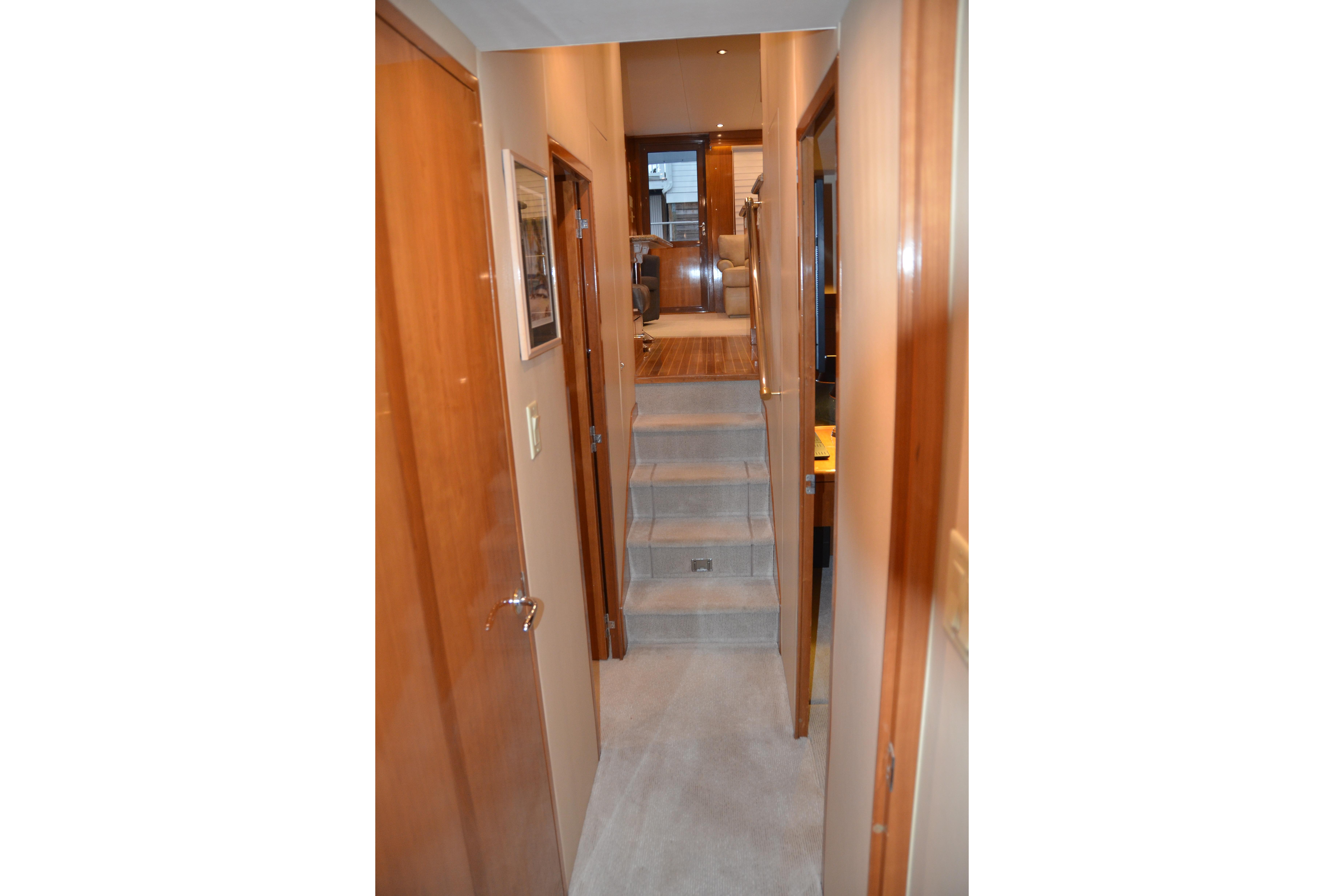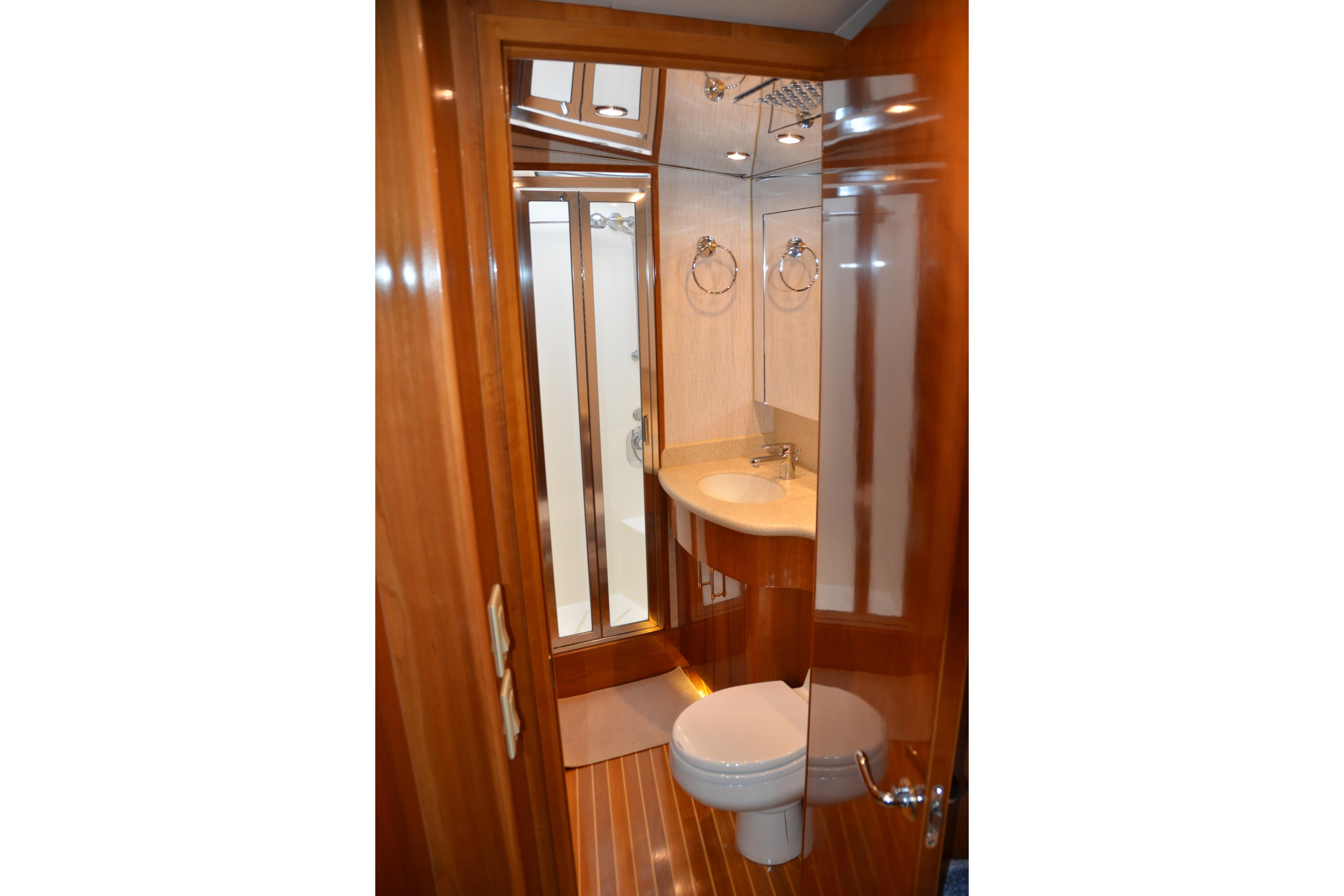 Between the VIP and Bunk staterooms is a well equipped head with Freshwater Vacuflush toilet, Corian counter and sink, mirrored storage and a separate stall shower. All areas are well lit with LED lighting and DC emergency lighting. There is a stacked washer/ dryer unit behind a finished door in the companionway.