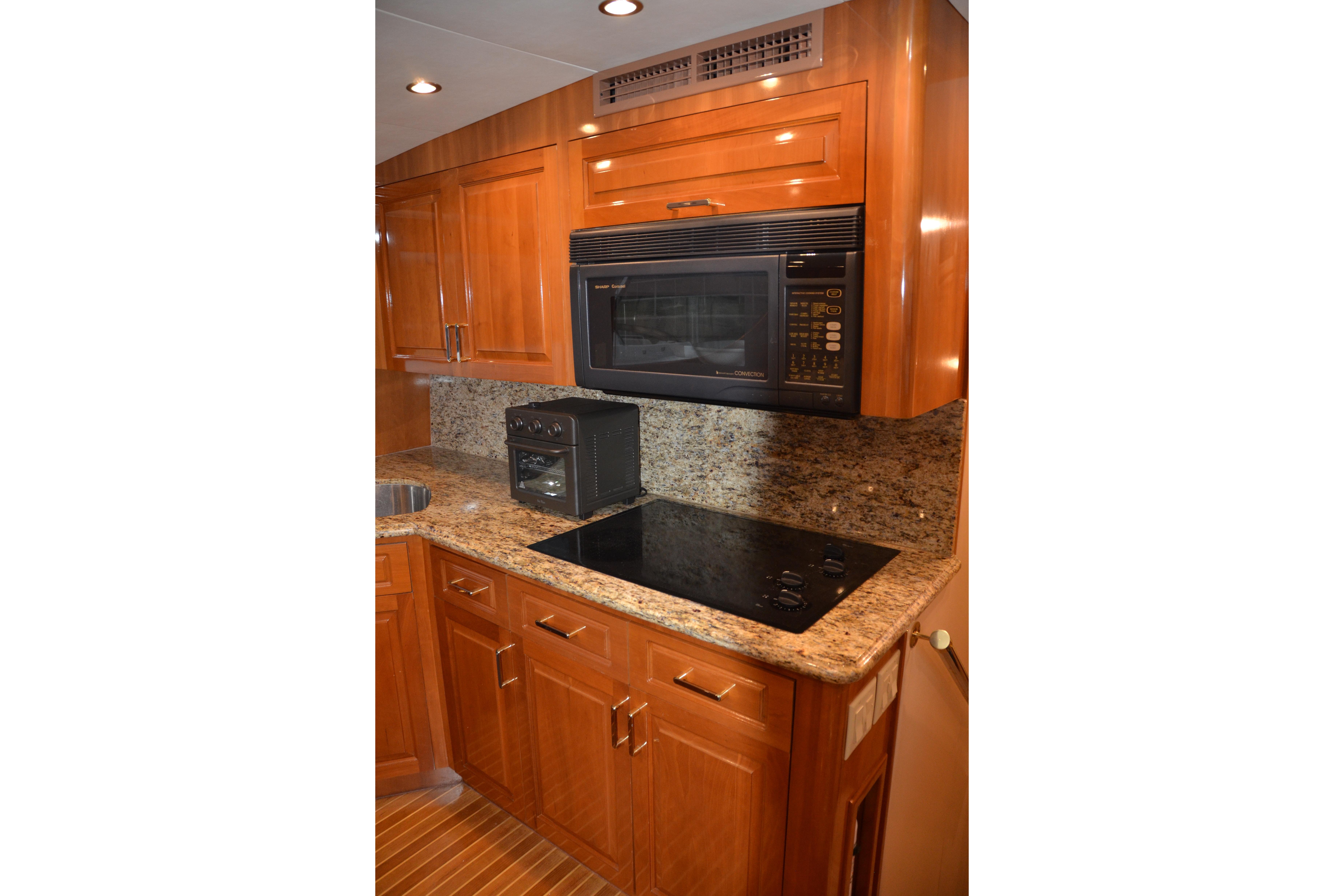 Though the aluminum door, the large cherry salon is freshly updated with NEW soft goods on the Sofa, Swivel Barrel Chair, Dinette and new carpeting. The cream colored sofa in new leatherette fabric has storage below the cushions. The grey leatherette fabric on the dinette highlights the grey in the granite dinette table top. A dark grey fabric shows no wear on the swivel barrel chair. Optional raised panel doors throughout the salon and galley, the area a custom elegant feel. This is not your average 2001 Hatteras, she feels, looks and smells like a new boat.