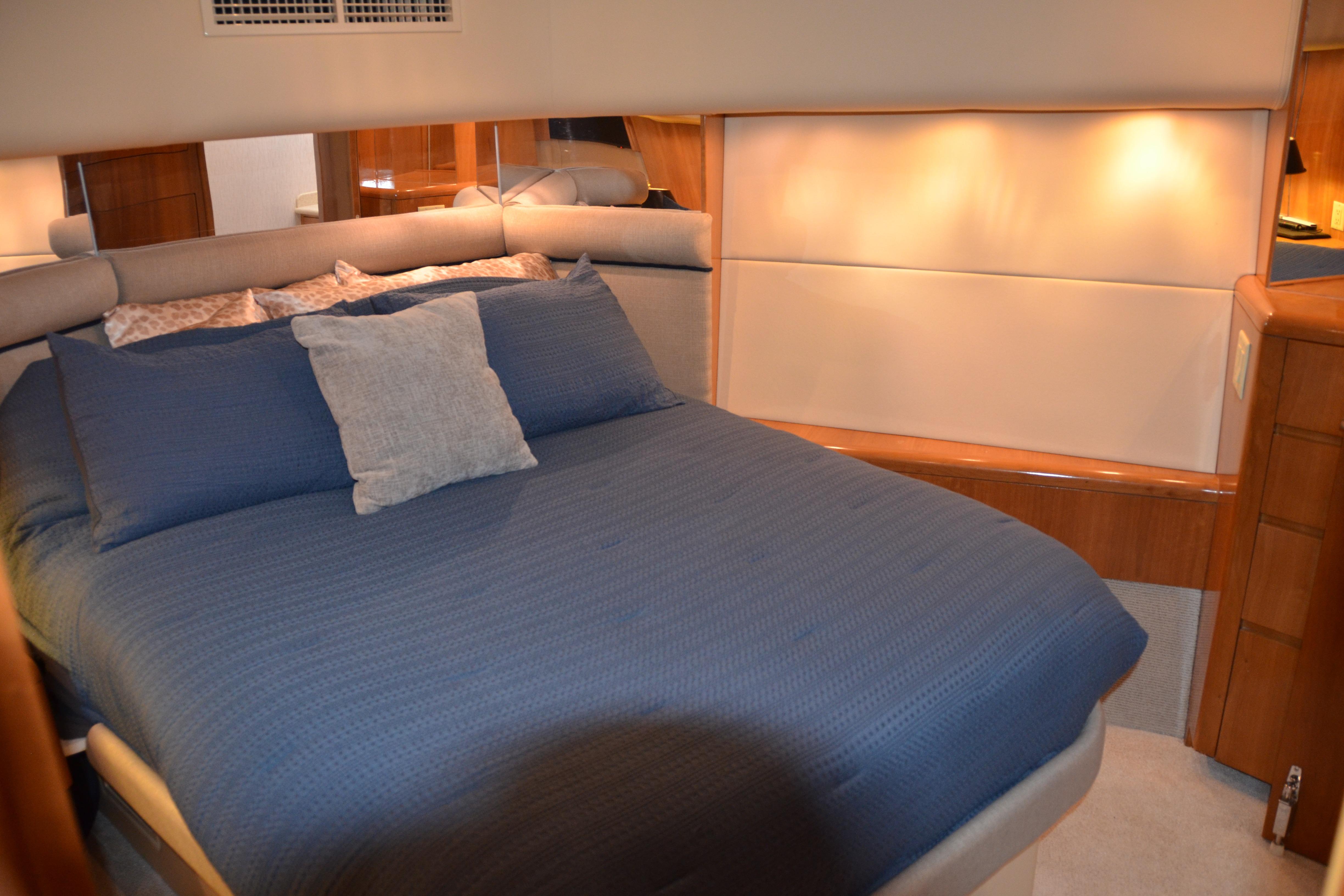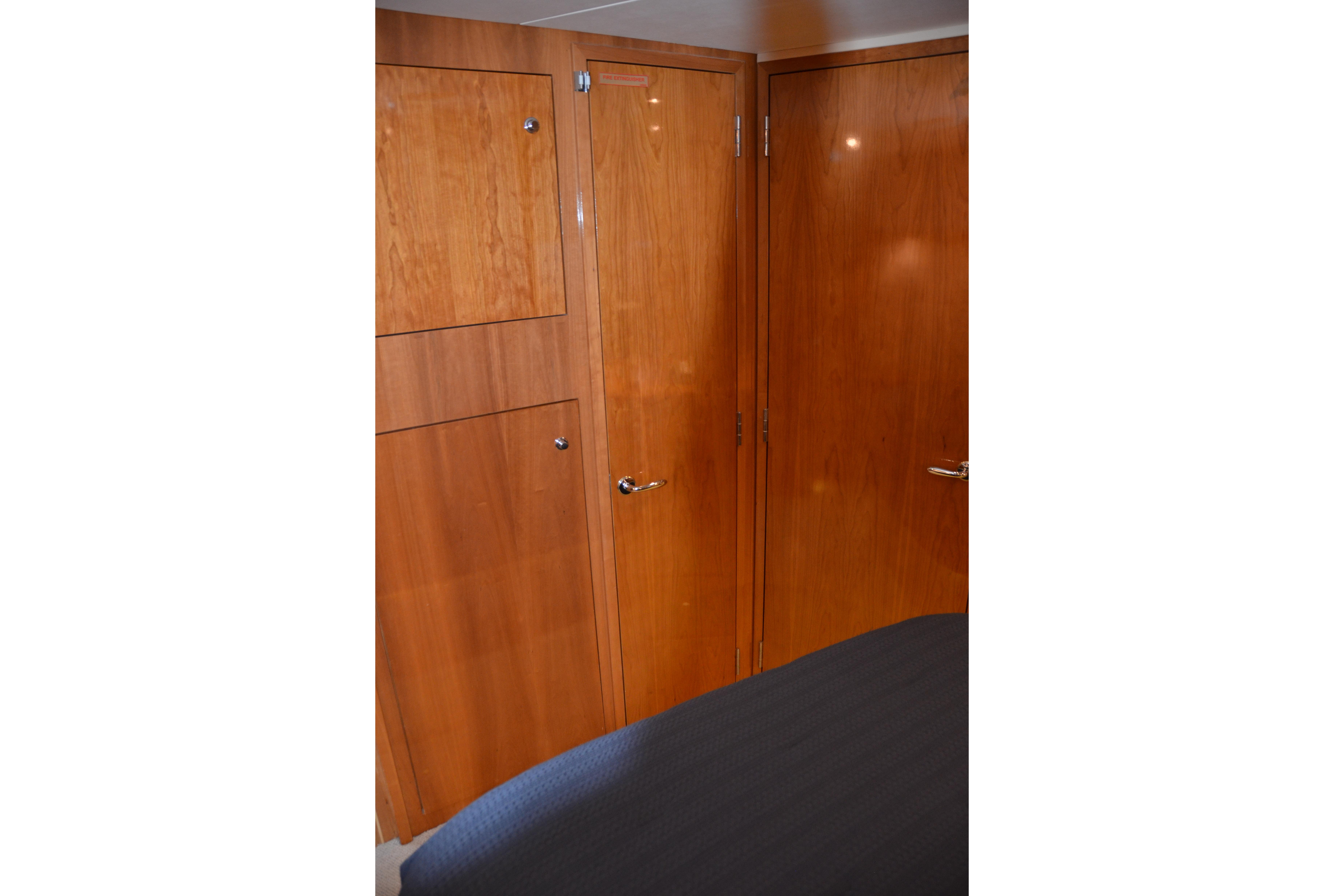 The lower deck is entered via a straight stair. The spacious master stateroom is to port with angled, walk around queen berth with NEW mattress and covering, rope lighting beneath, cedar lined hanging lockers, cedar lined storage beneath the hinged berth top, a built in night stand with lamp and night stand on the starboard side, entertainment center with NEW 32" LCD Smart TV and Fusion stereo. The private ensuite head features a large stall shower, teak and holly flooring, an optional mirrored overhead and a mirrored cabinet over Corian counter and integral sink. The Head also has a freshwater Vacuflush toilet and opening hatch in the overhead.
