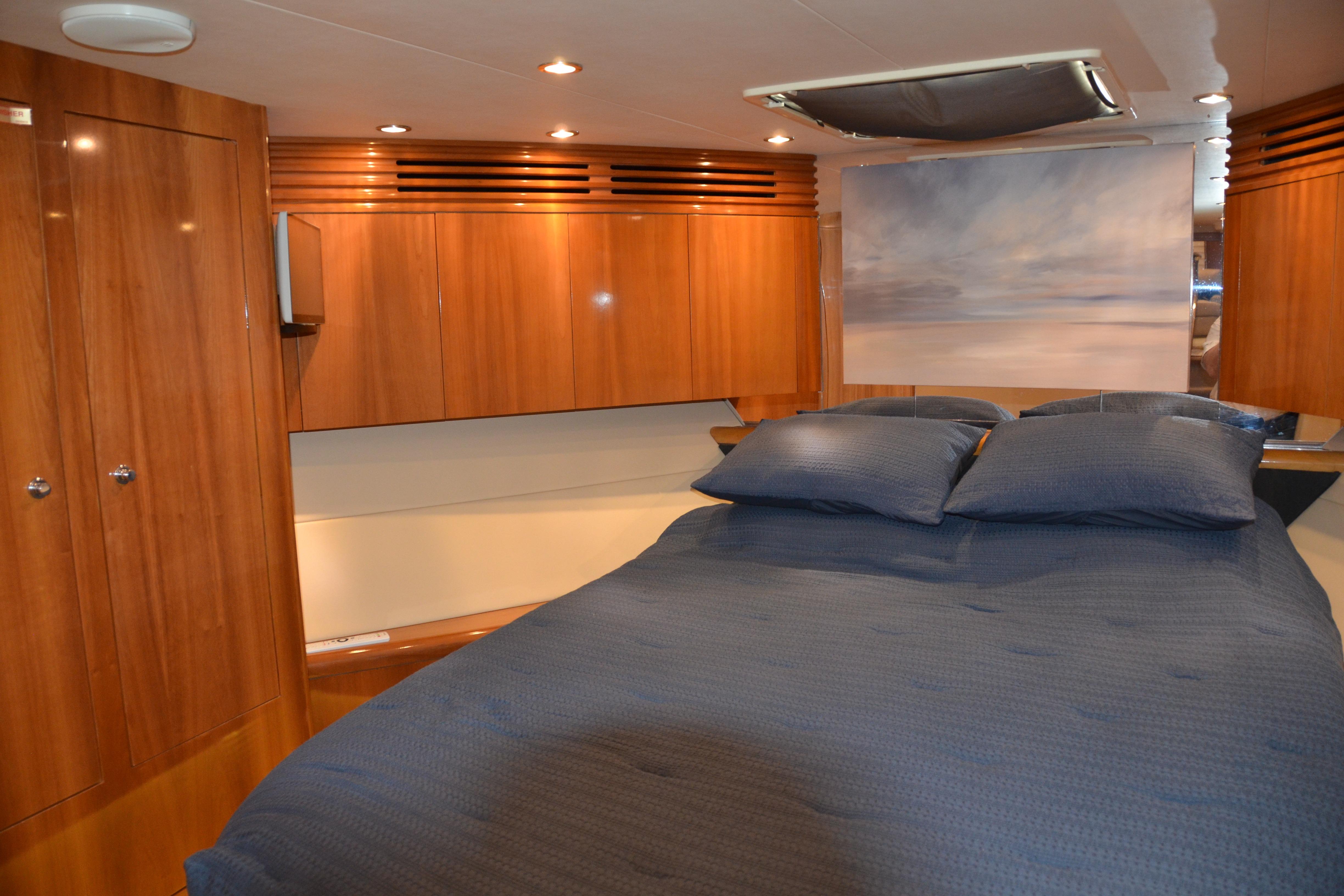 Forward in the bow is the VIP stateroom with queen berth with NEW mattress and coverings, cedar lined hanging lockers, drawer storage, opening hatch overhead with privacy screen and NEW wall mounted flat screen TV.