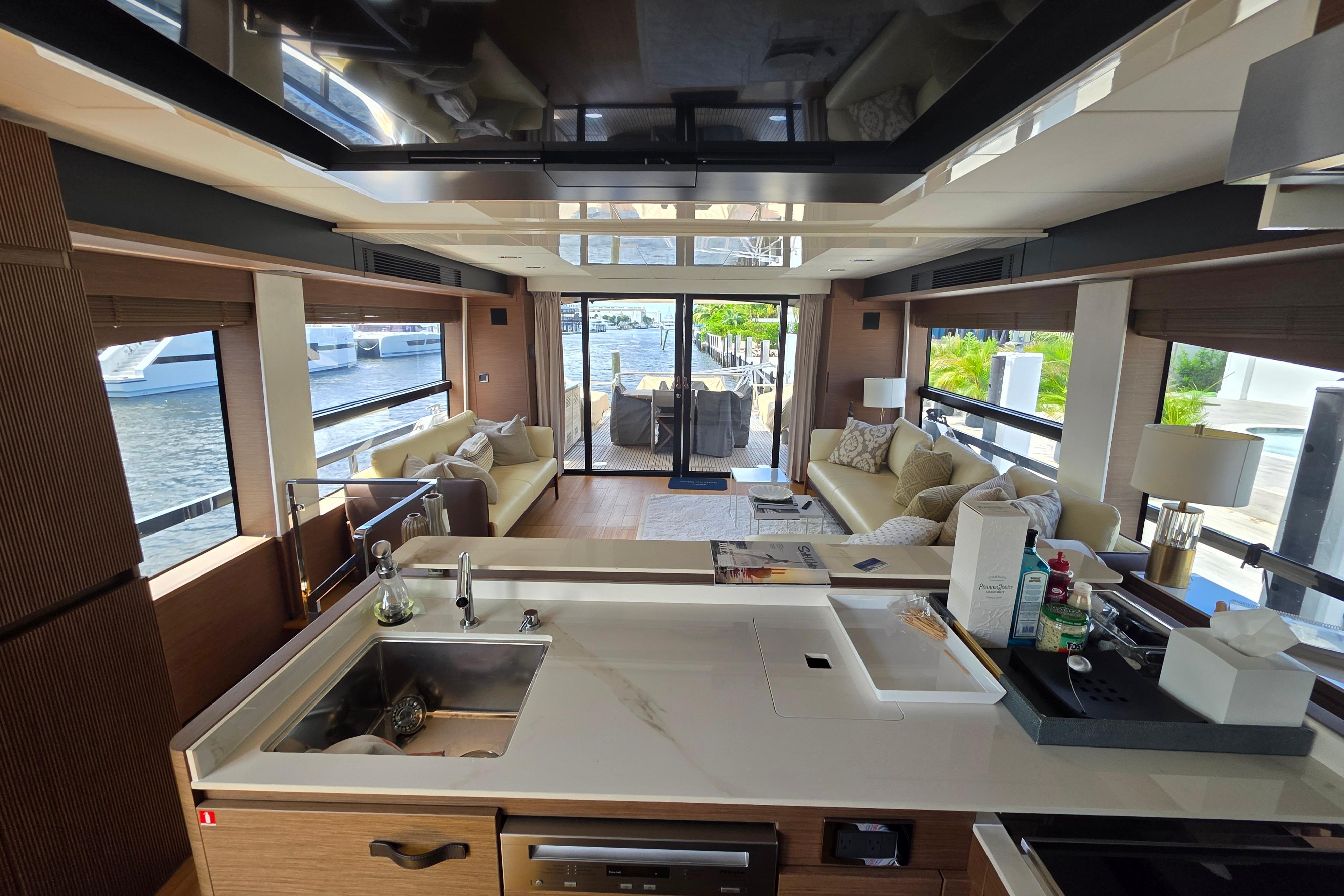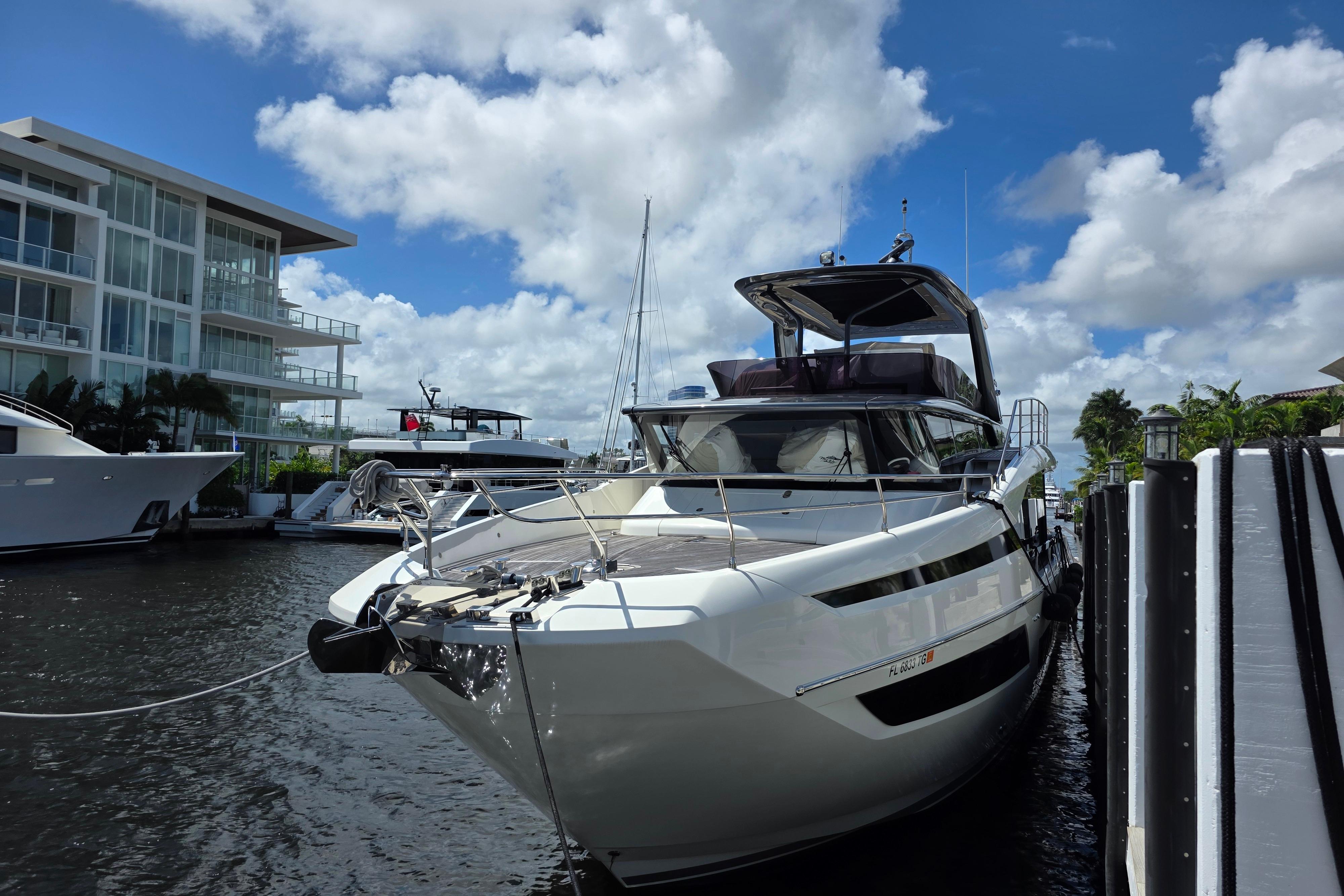 The 2022 Prestige X70 is a luxury motor yacht designed with superyacht features, including a full-beam main deck for increased interior space, a large beach-style aft cockpit, and a massive flybridge for relaxation and entertaining. Powered by Volvo Penta IPS 1350 engines, it offers easy maneuverability with joystick control. The interior features a private owner's suite and a salon with drop-down windows, all designed to provide an unparalleled experience of life at sea.