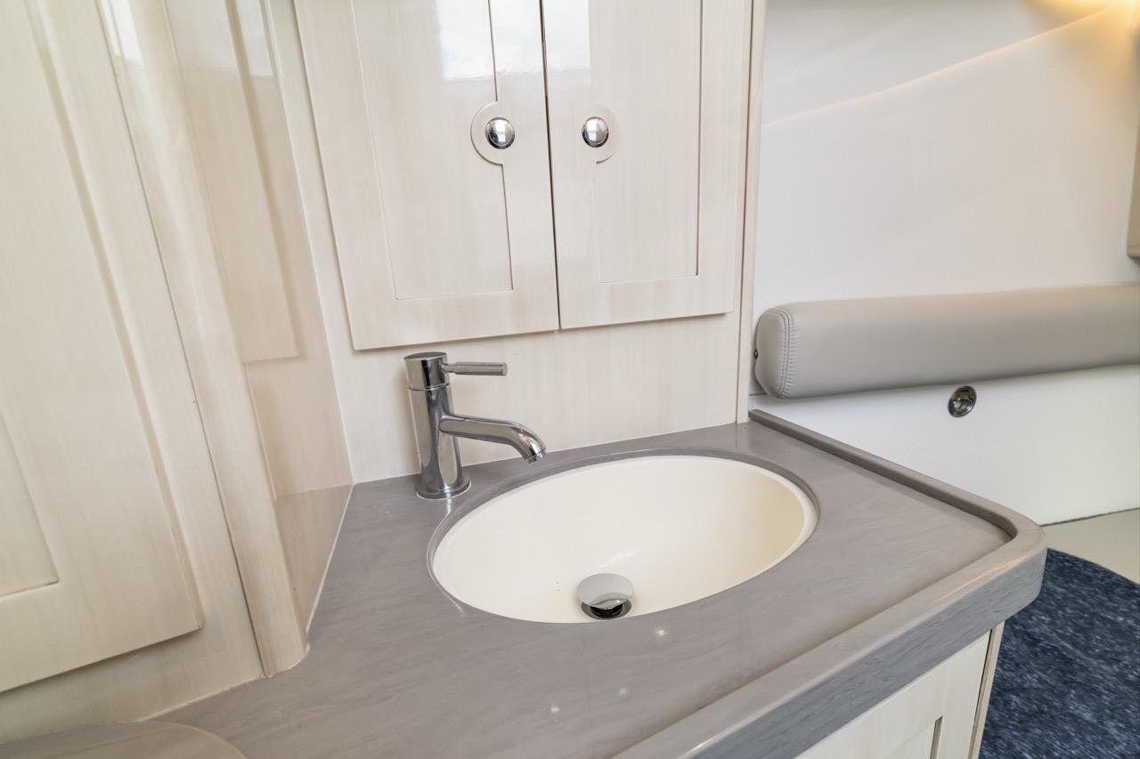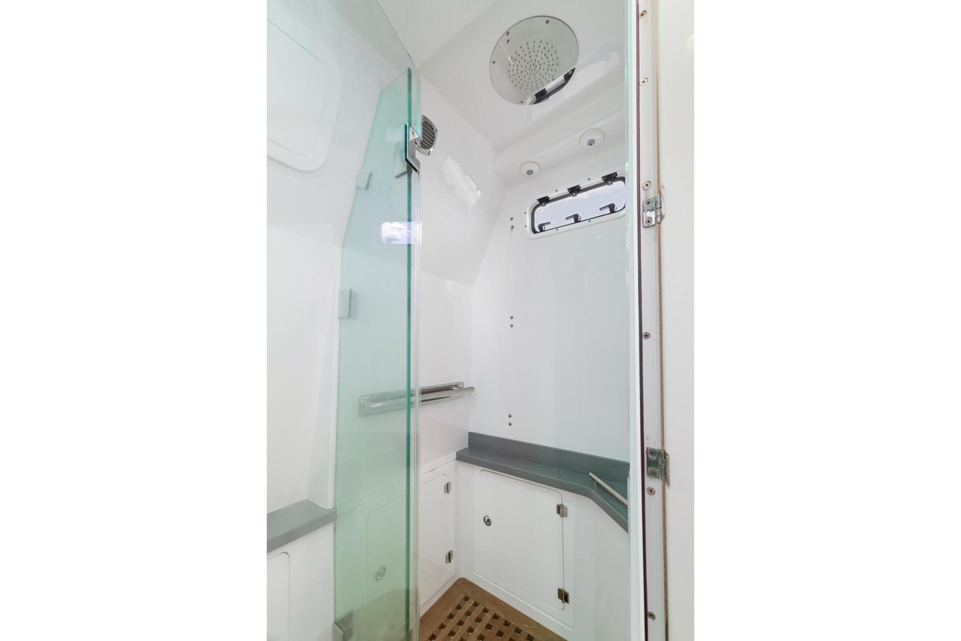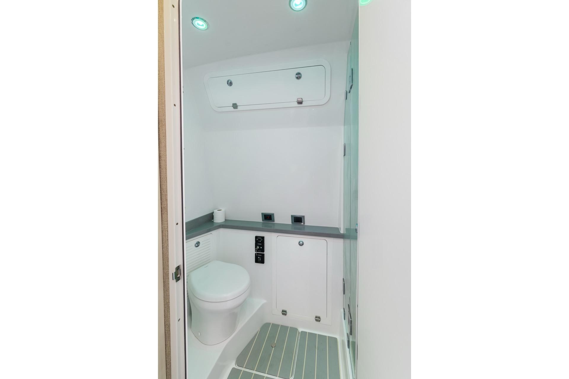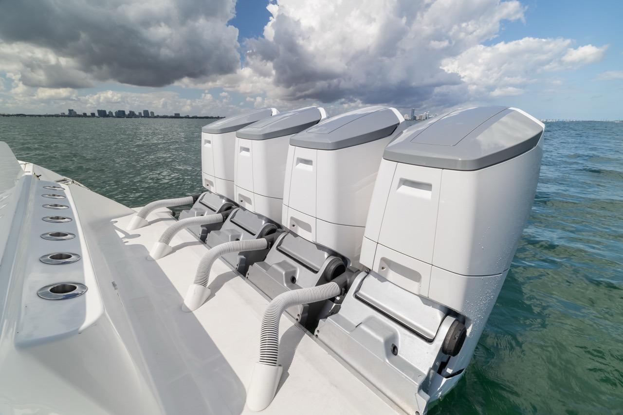- Transom Center In-Deck Seakeeper & Generator Access with ample storage