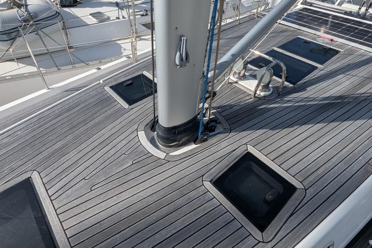 Teck appliqué sous vide, épaisseur nominale de 9 mm, sur les passavants, le rouf, le plancher et les sièges du cockpit, ainsi que sur la plateforme de bain