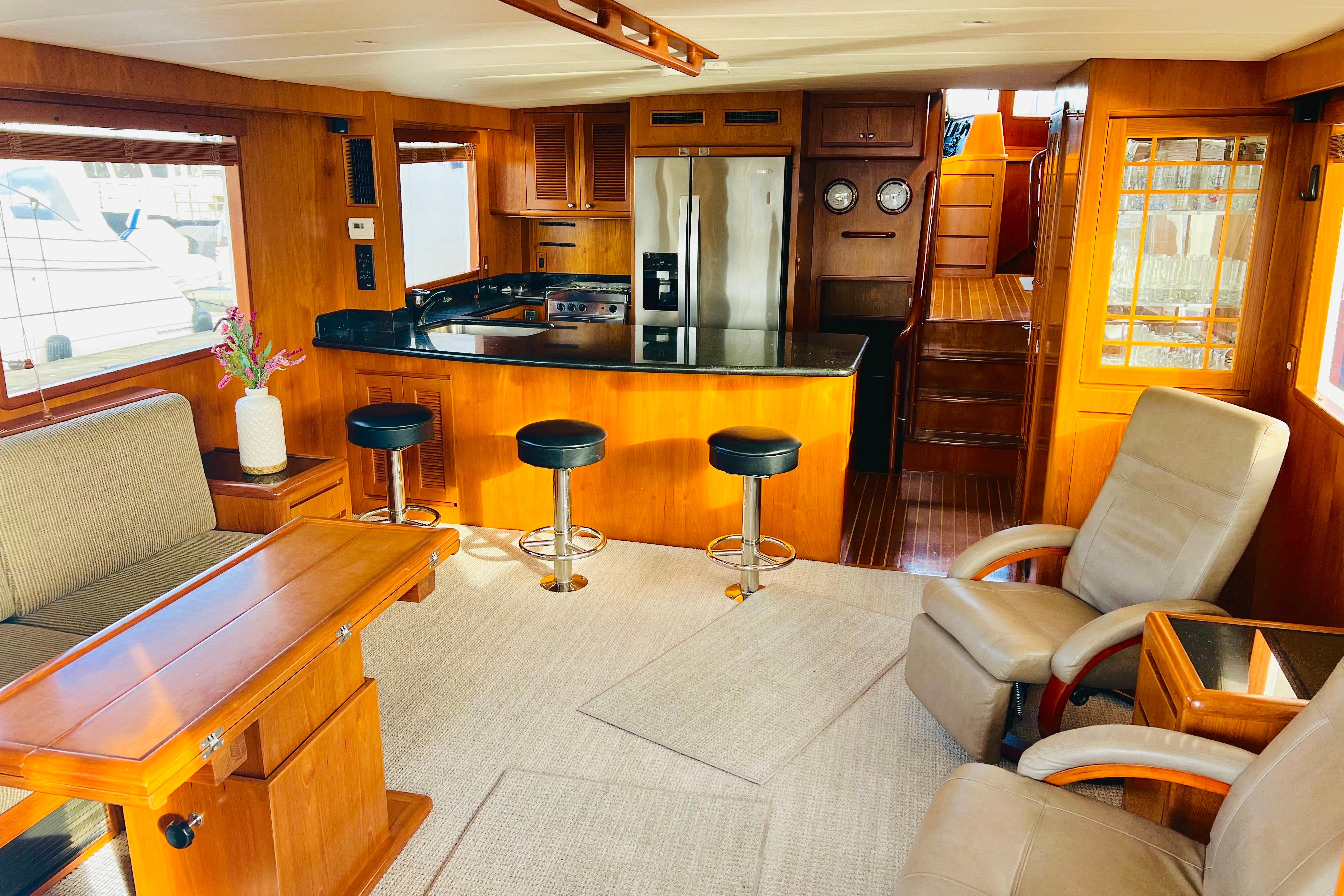 Forward is a stateroom with an island queen berth with storage and the bow thruster beneath the berth. The stateroom also has port and starboard cabinets and hanging lockers and a starboard aft door to a head compartment with stall shower. A vestibule follows and has a second door to the forward head compartment to starboard followed by steps to the pilothouse, and has a port side door to a stateroom with stacked single berths and a hanging locker. The pilothouse has a centerline helm station with a pedestal pilot seat, a port side chart table area followed by a side door and a raised “L” shaped settee with table, and the starboard side stairway to the forward accommodations followed by a side door, steps up to the flying bridge, and a steps leading aft to the main cabin. The main cabin has a port side “U” shaped galley followed by a breakfast bar with three stools and an “L” shaped settee with table. To starboard is a pantry followed by a door to a day head compartment, and two arm chairs and an entertainment center. Steps forward in the galley lead down to the master stateroom which has an island king berth, bureaus, a hanging locker, a head compartment with stall shower, and an aft door to the engine compartment. The engine compartment contains the engines, fuel tanks, batteries, and generator. An aft door in the engine room opens to the lazarette. The interior is well finished in teak, stone, new carpet.