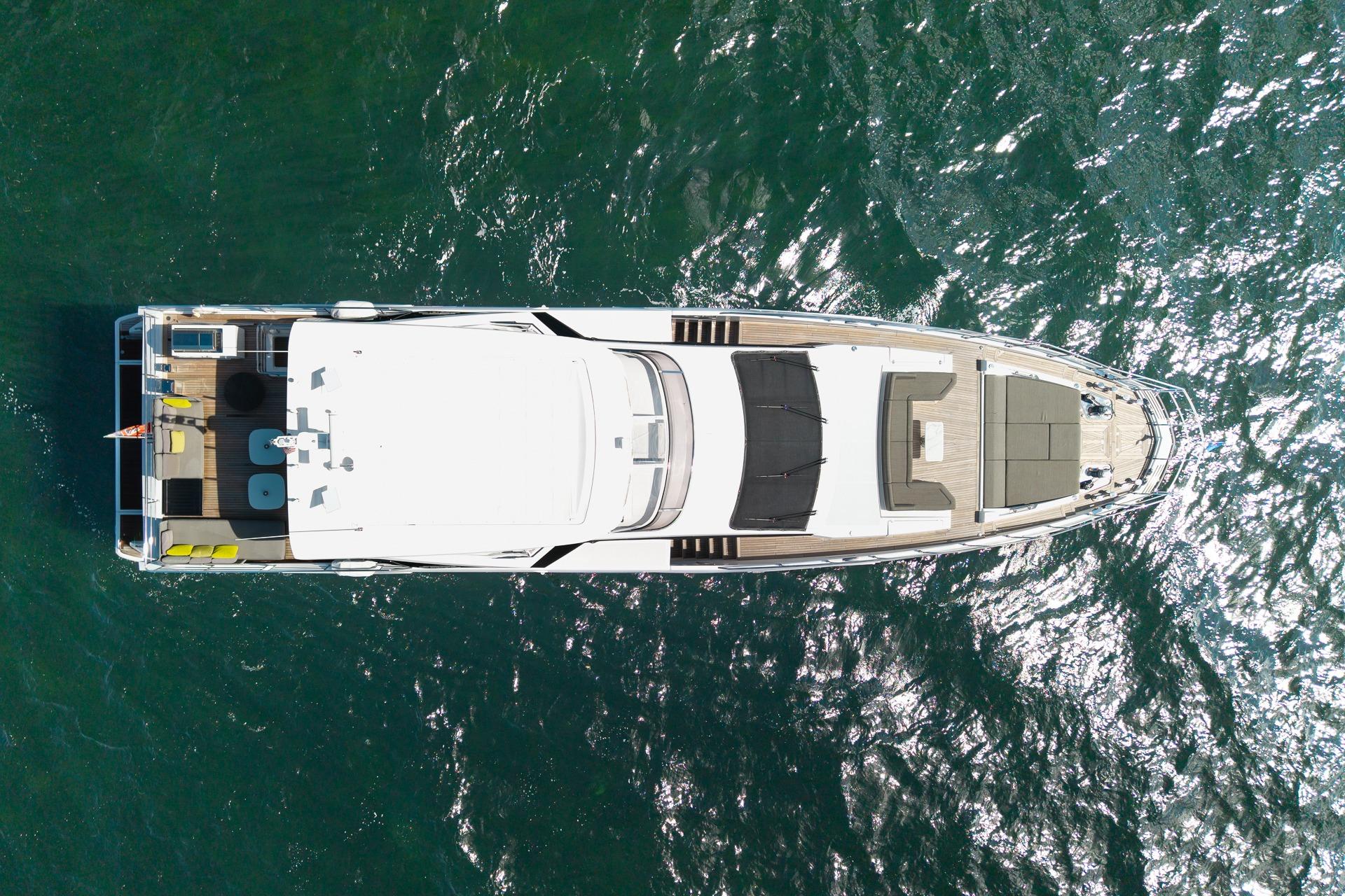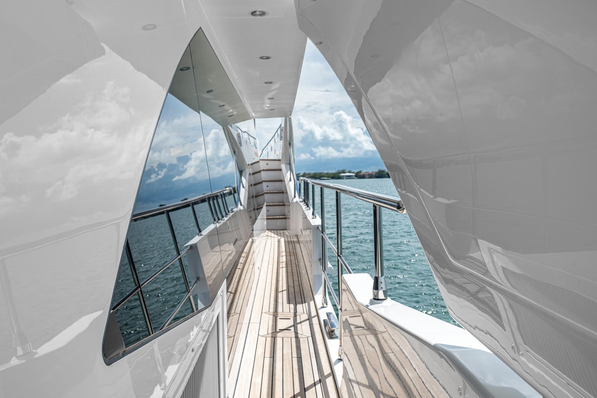 - The salon doors can be opened up to create a large indoor/outdoor space, and there is easy access to the flybridge, bow, and tender garage/swim platform.