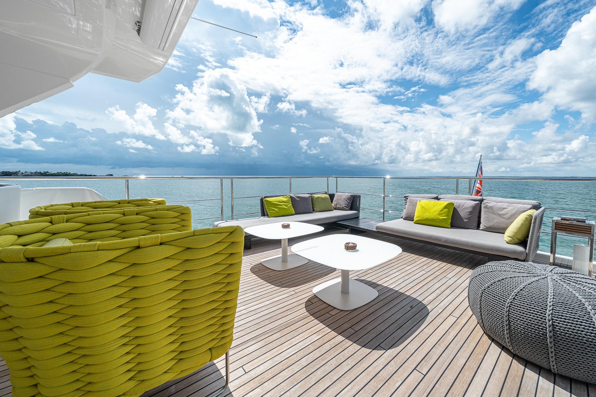 - Forward of the dining area is the upper helm station with additional forward-facing seating to port.