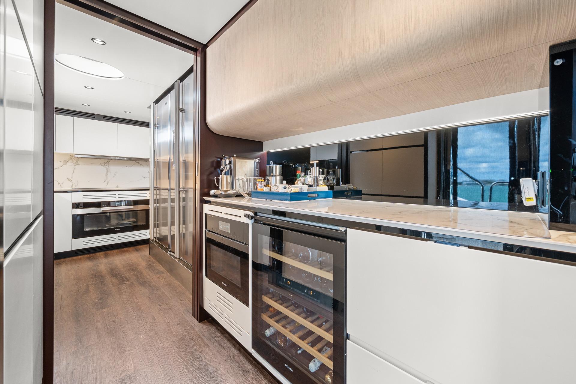 - There is a lot of counter space and an additional coffee bar area as you enter the galley with a Miele wine fridge and Miele microwave/convection oven.