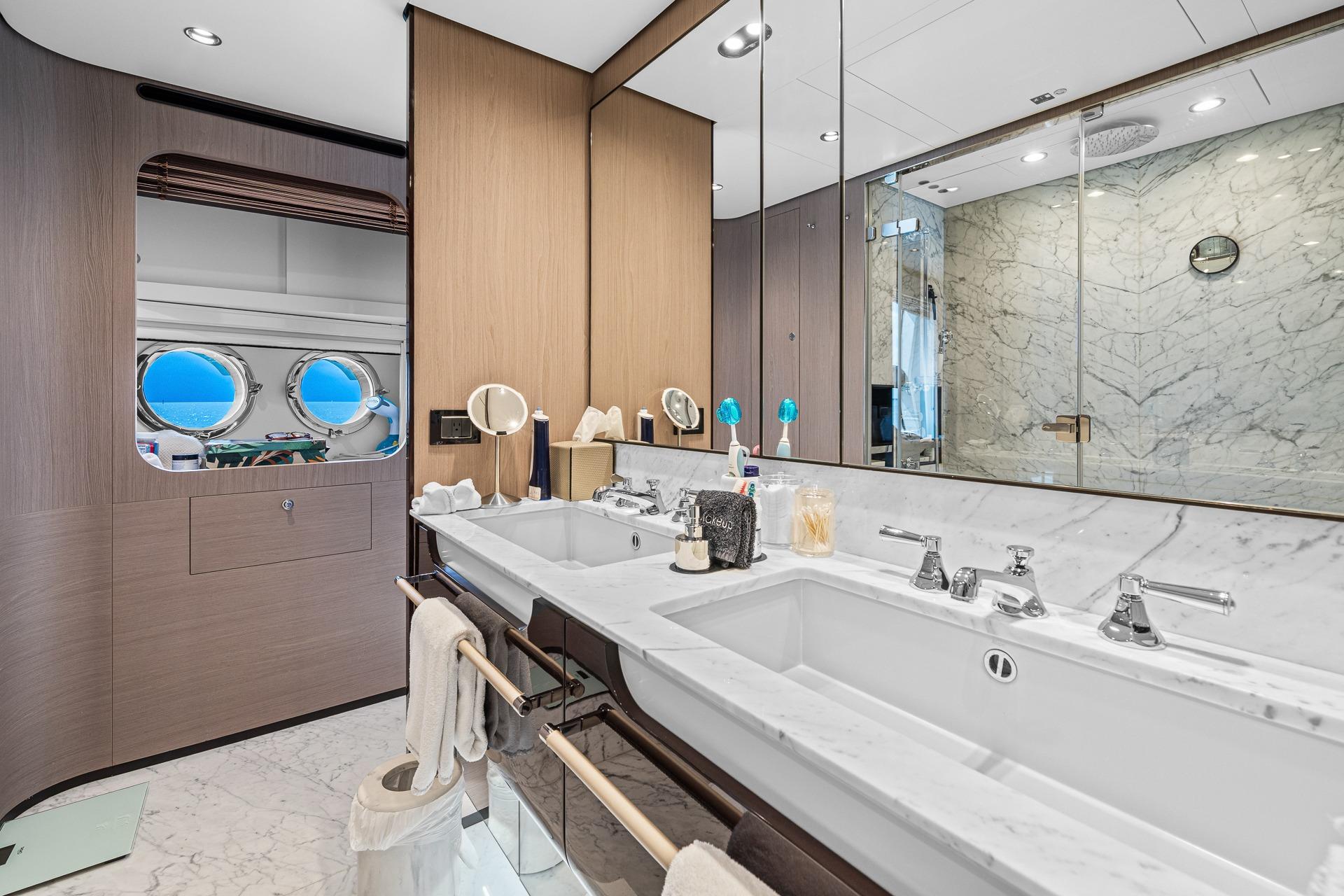 - The light-colored marble with dark accents continues through the master head with a double vanity aft and spacious shower forward.