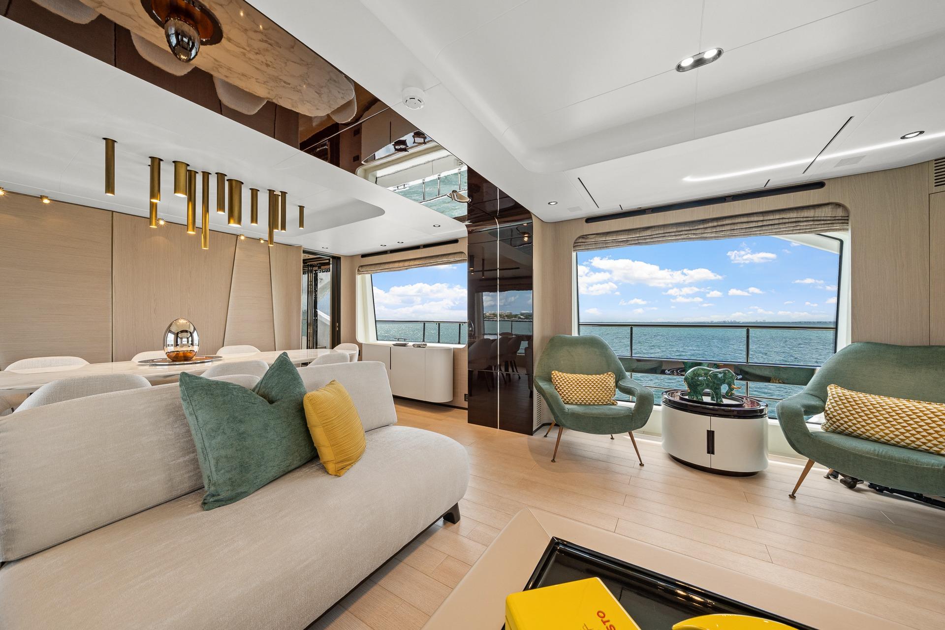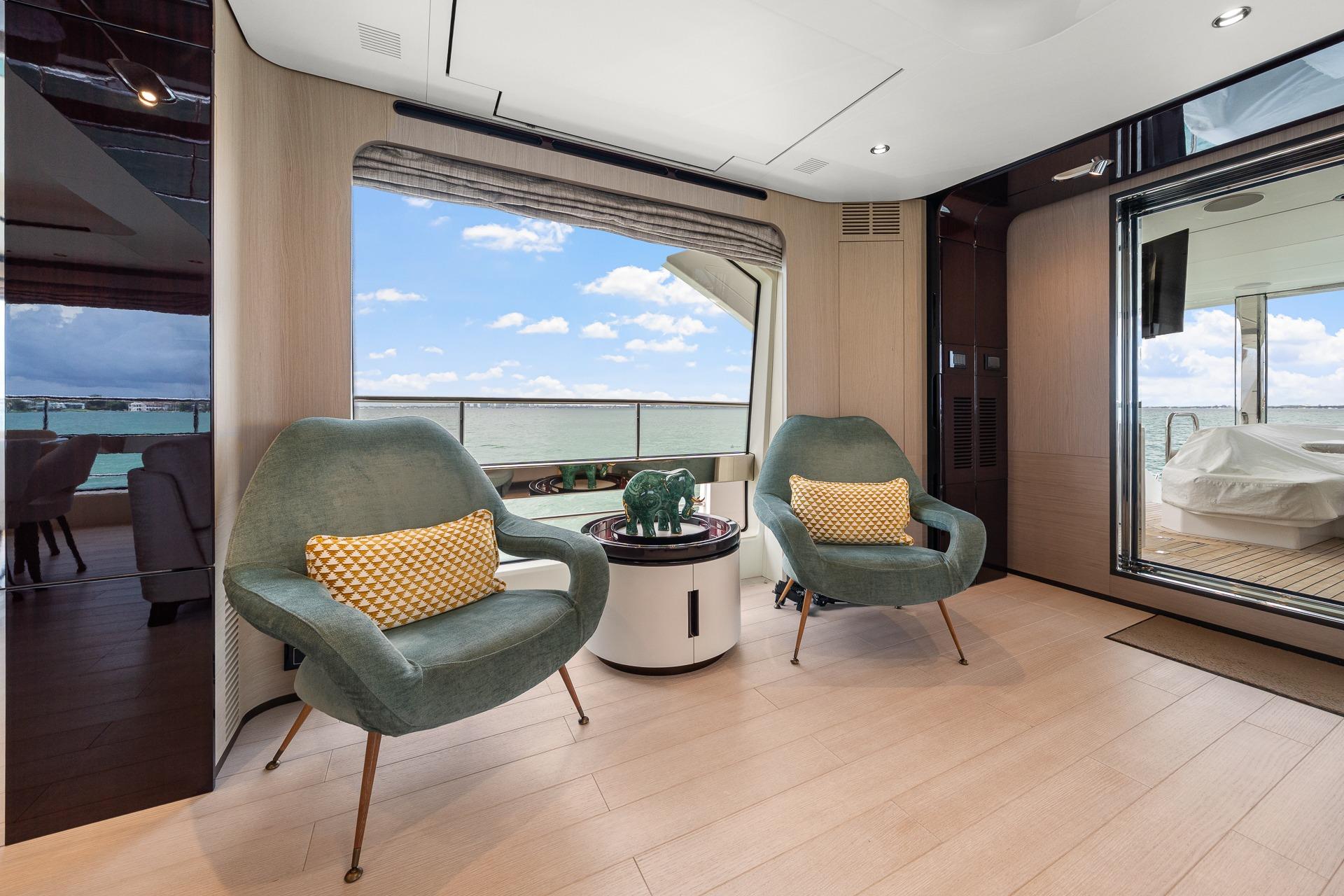 - The salon boasts a spacious seating area with a custom-made sectional sofa to port, 2 arm chairs to starboard, and an additional love seat aft.