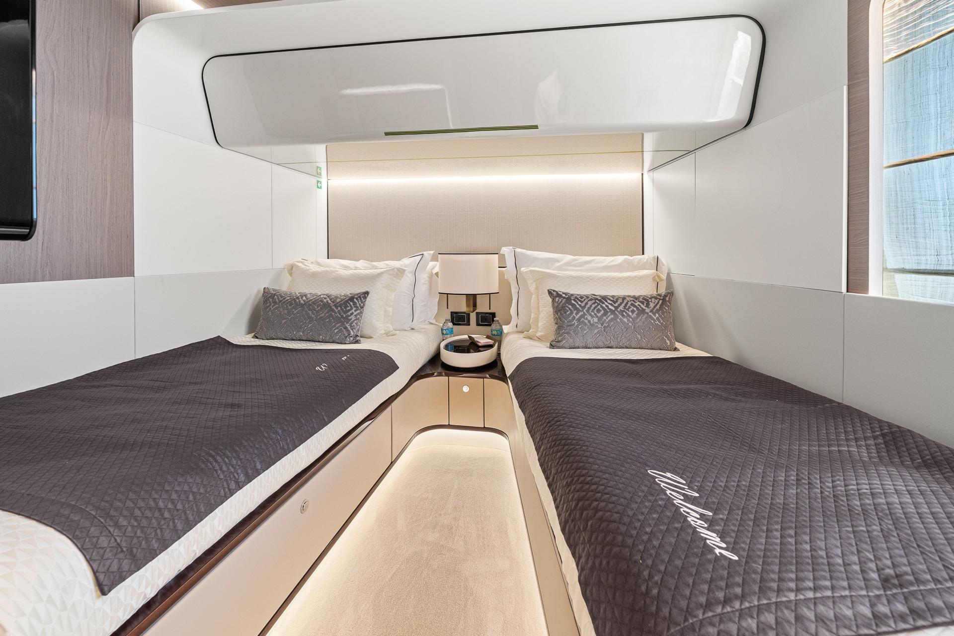- There are 2 staterooms that can accommodate up to 4 crew. One stateroom has a large queen berth and the other has twin bunks.