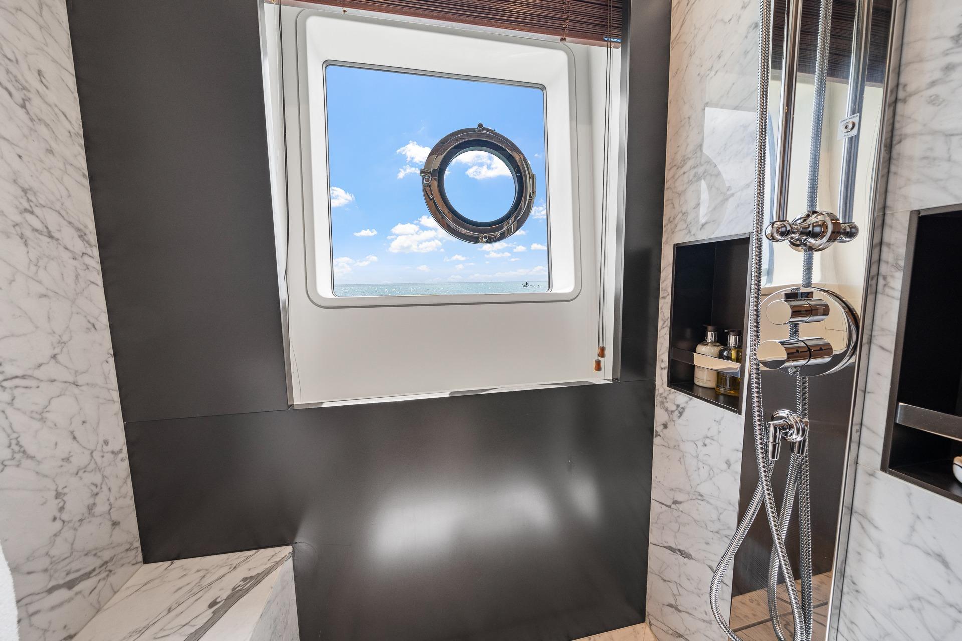 - The natural light filters through both the stateroom and the en-suite and highlights the beautiful marble and stainless accents.