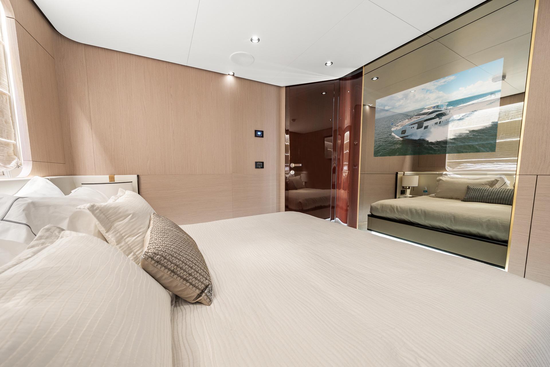 - The TV is mounted at the foot of the inboard bed and concealed nicely behind the dark glass.