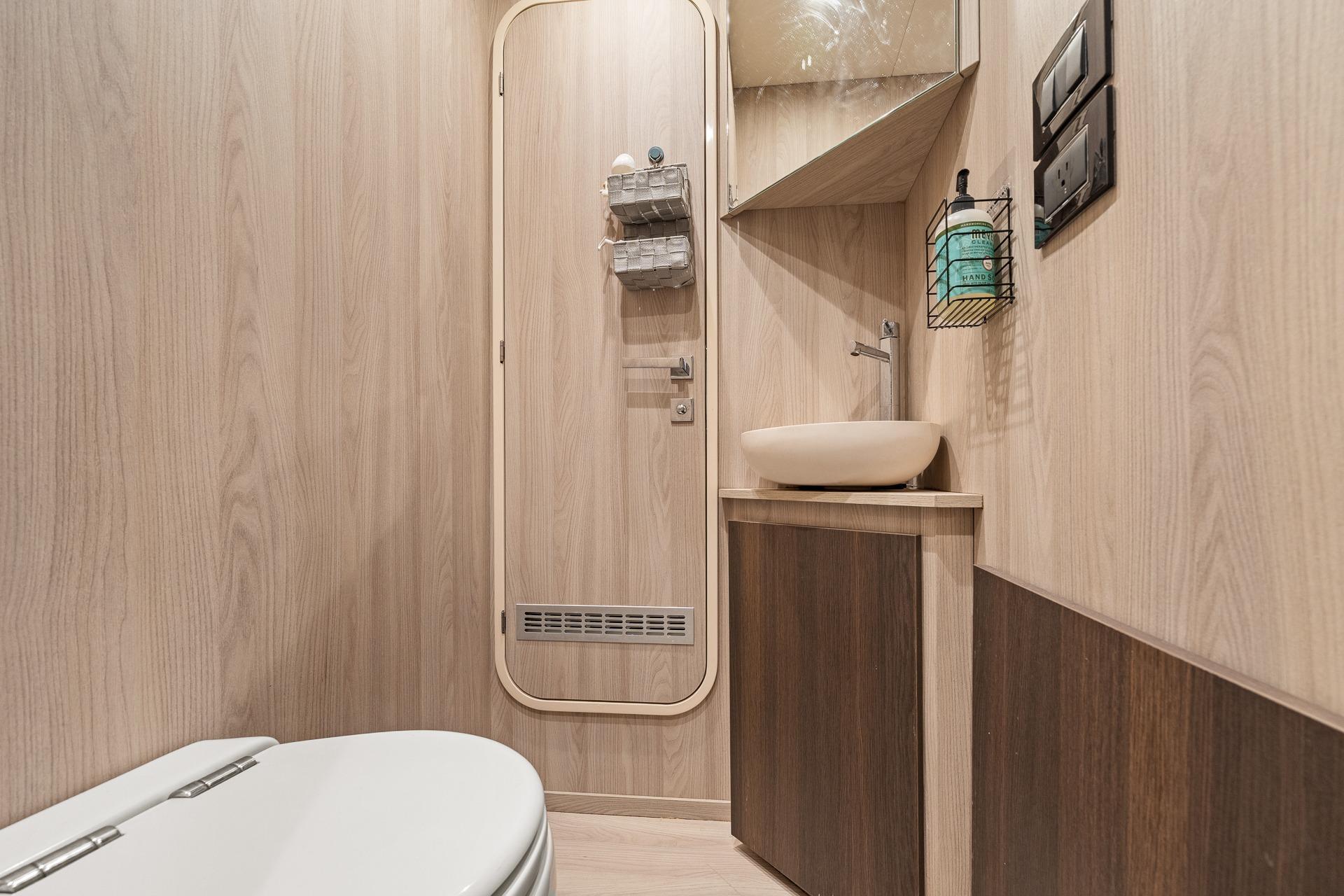 - There is a large hanging locker aft as well as storage under the bed and concealed lockers above the nightstands and next to the TV.