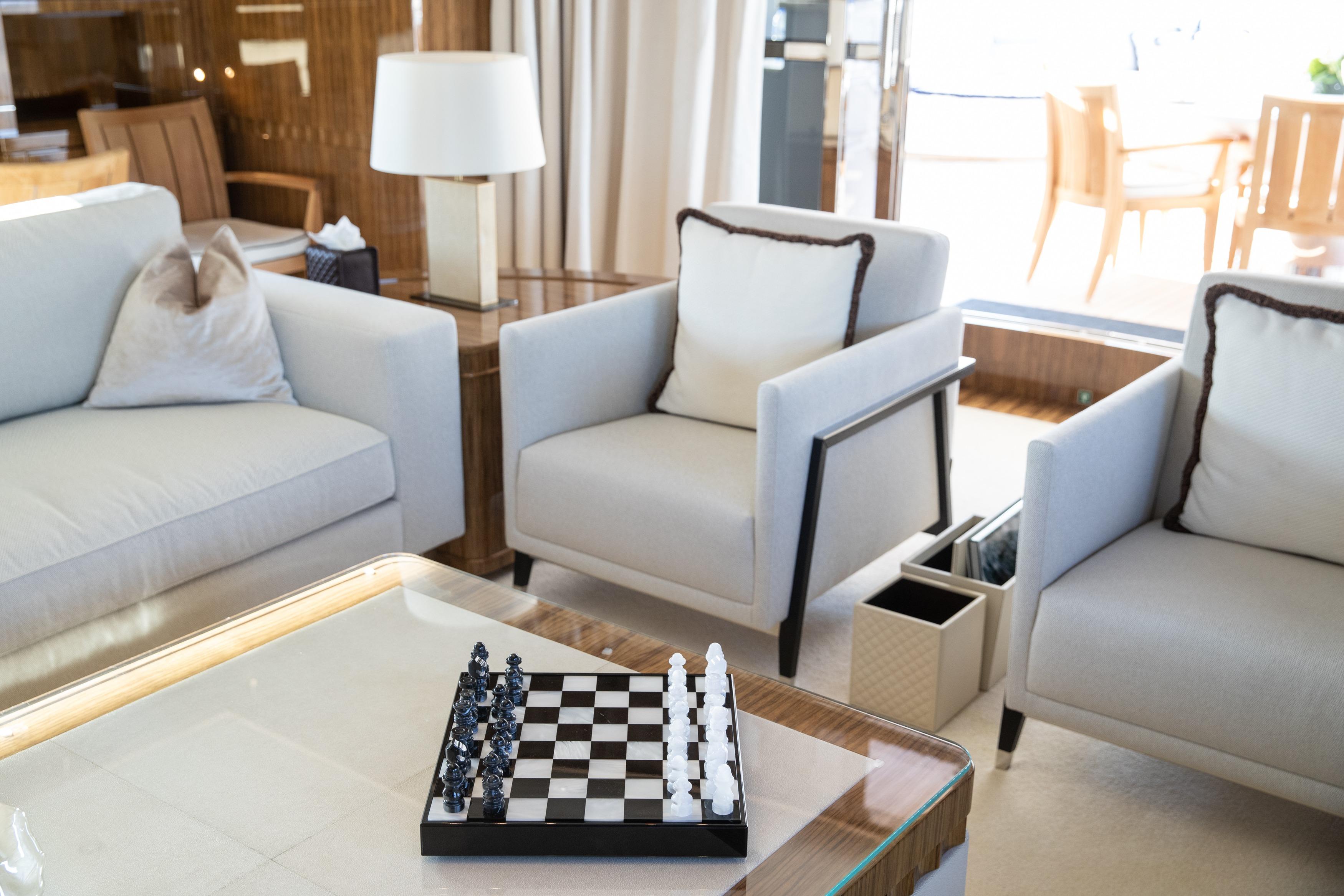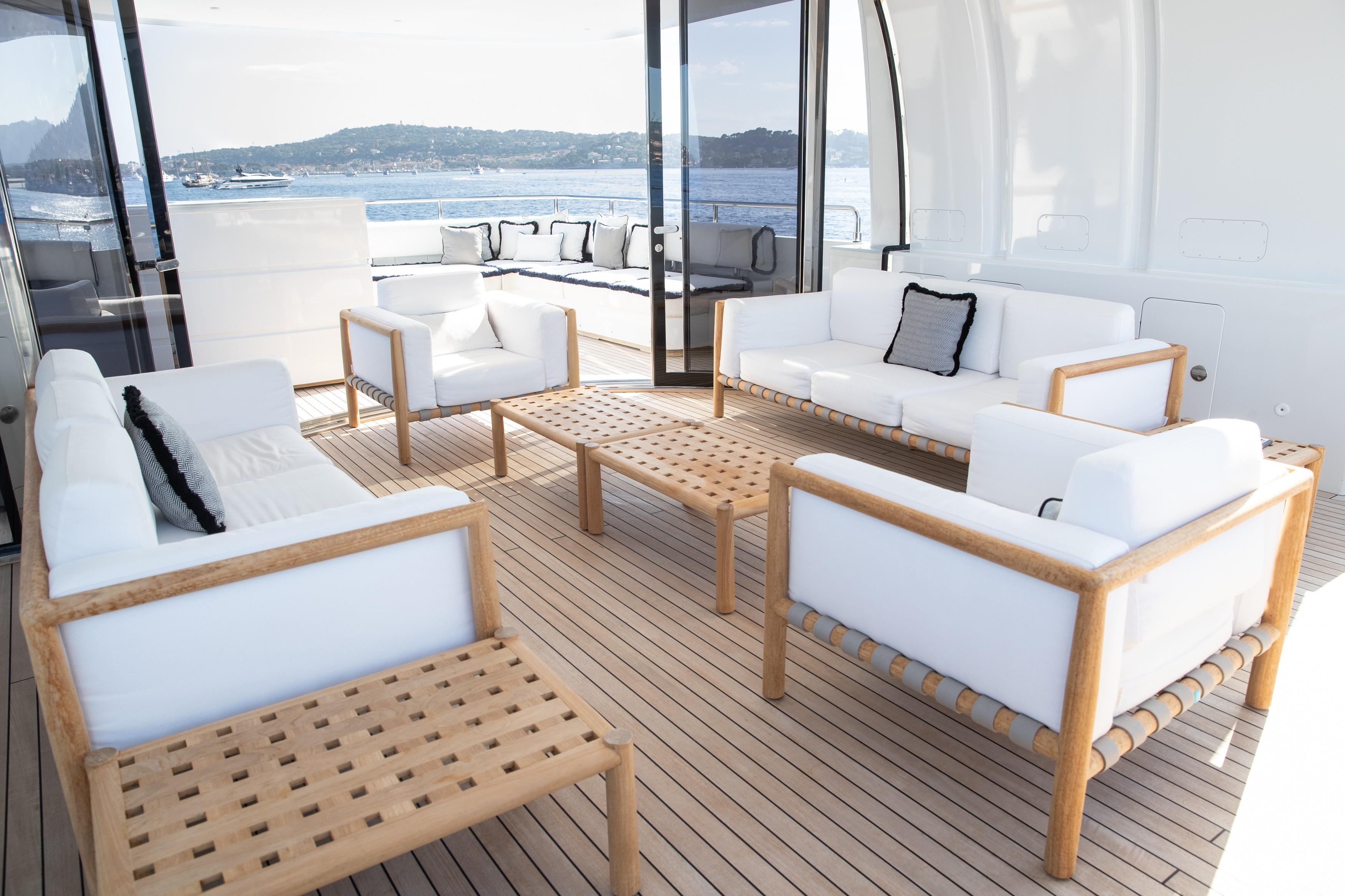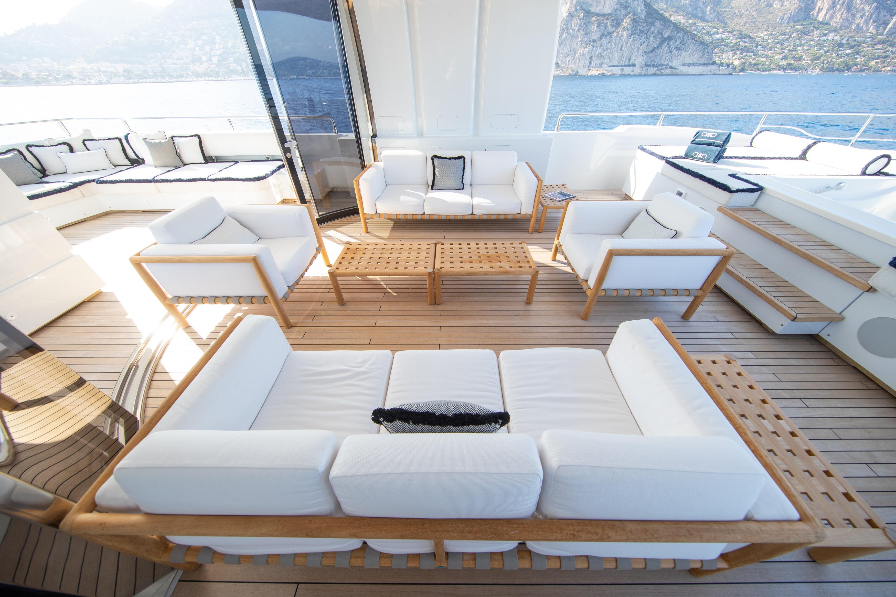 Life on board OKKO is designed to inspire. Whether you're seeking relaxation or adventure, she offers something for everyone. Keep active in the outdoor gym area, soak in the jacuzzi while admiring breathtaking views, or enjoy her selection of water toys for exhilarating moments on the water. Her expansive main deck salon and dining area form an open, welcoming space bathed in natural light thanks to large panoramic windows that frame the seascape beyond.