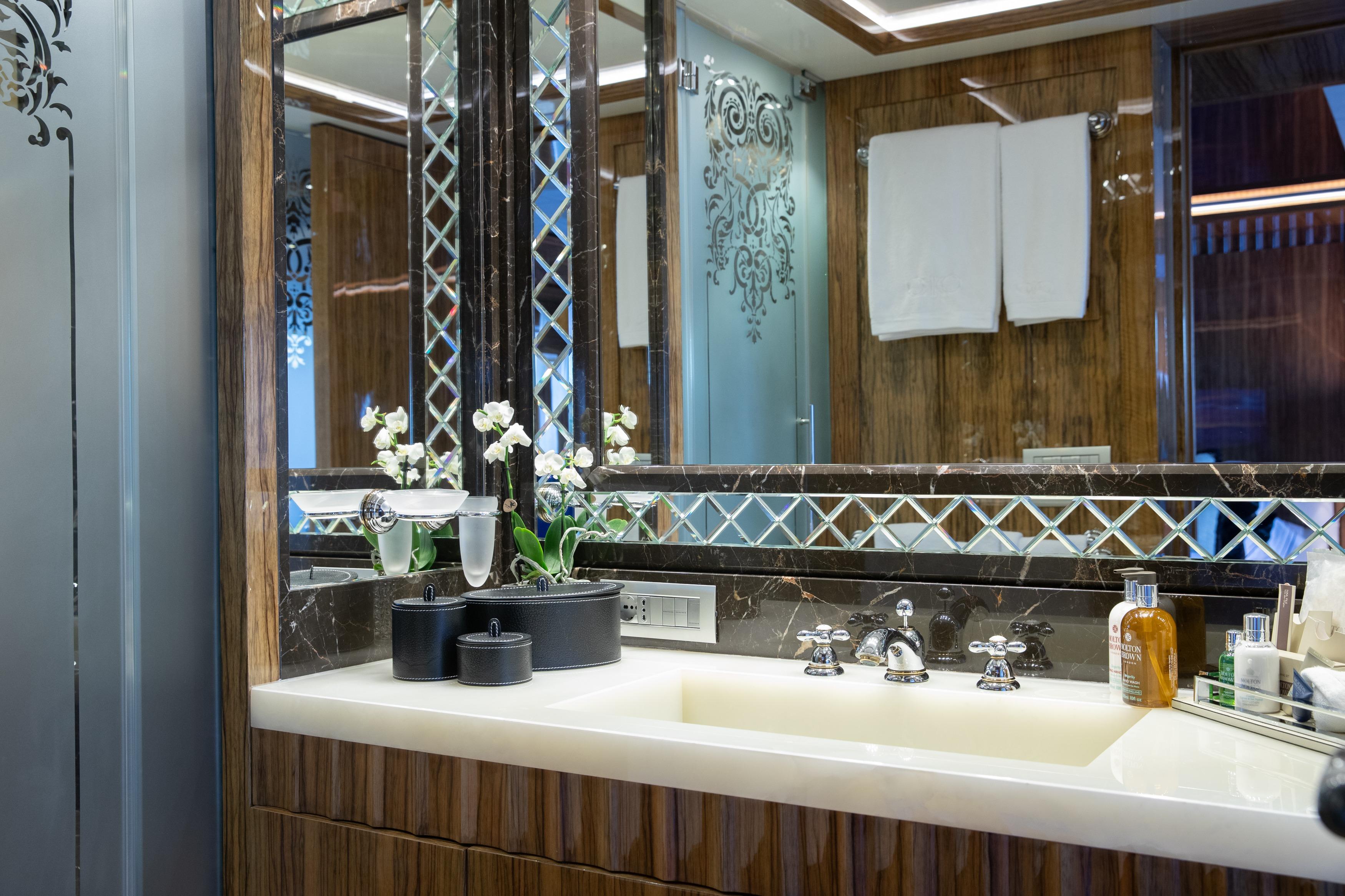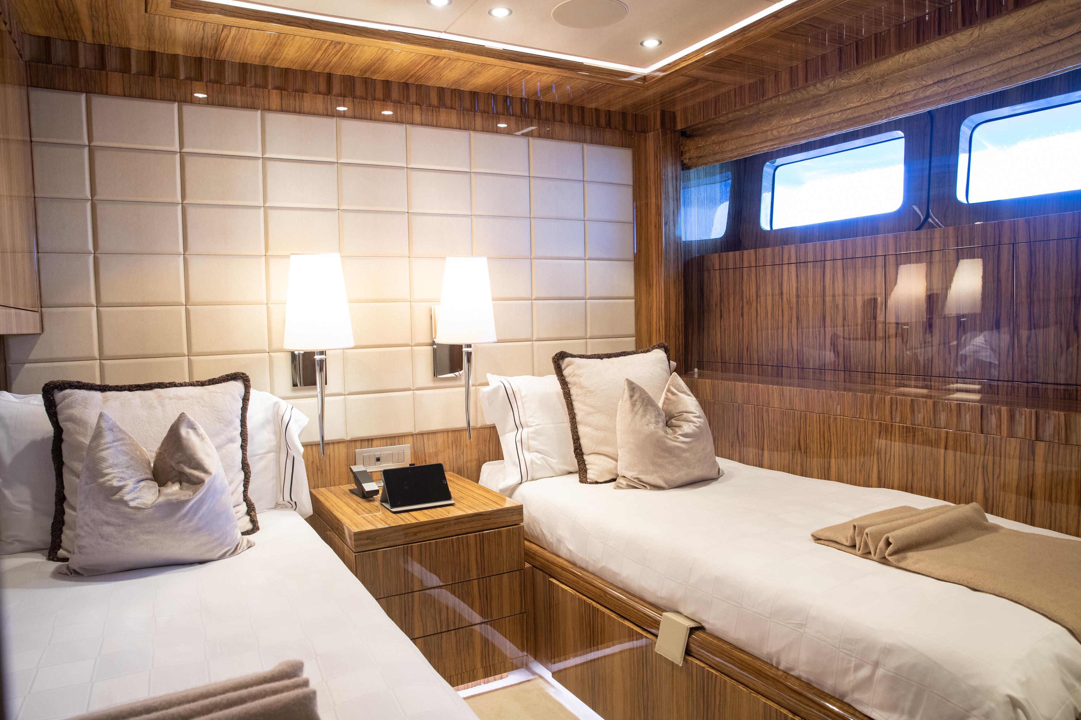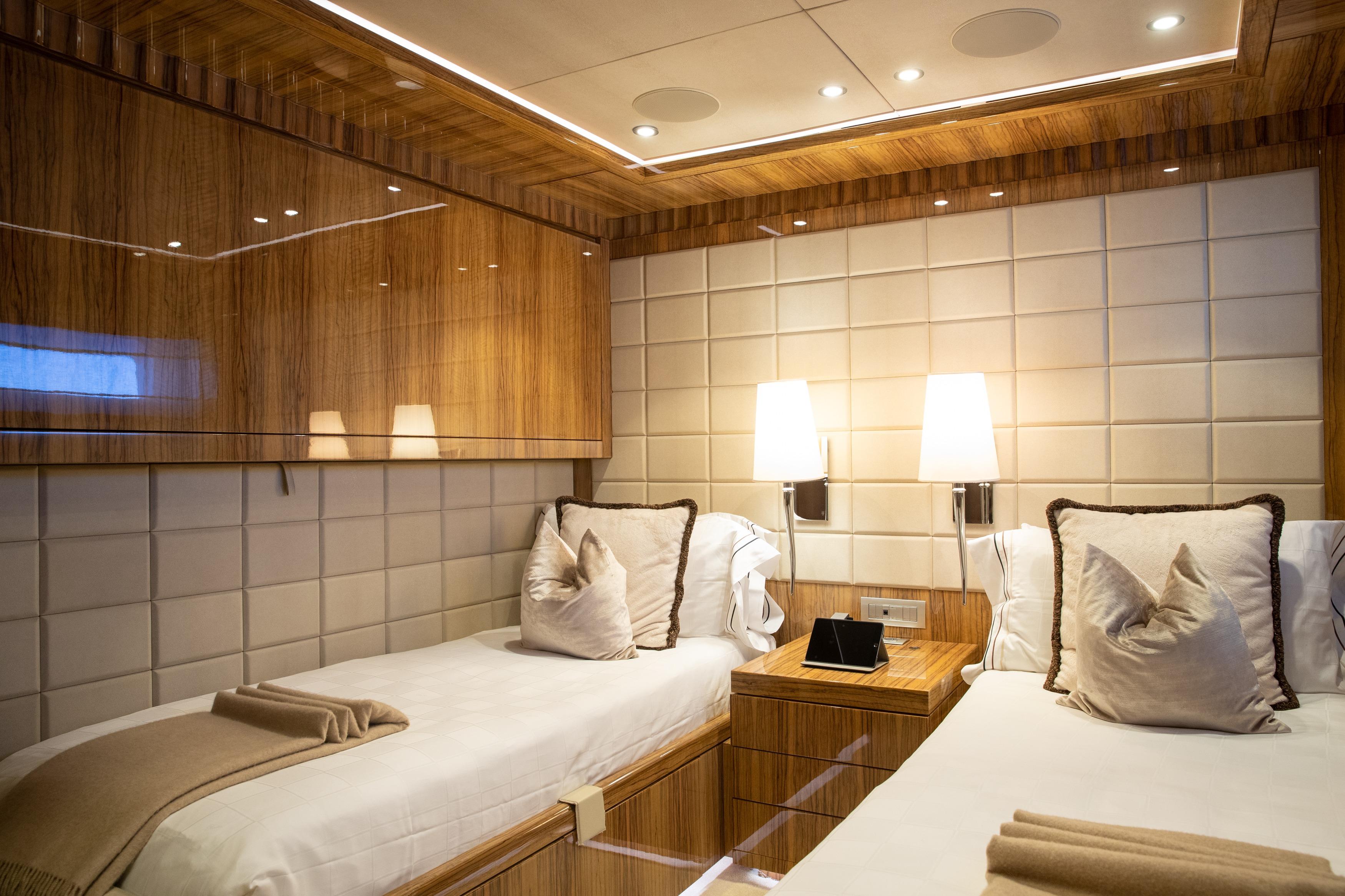 OKKO accommodates up to 12 guests in five en-suite cabins, including a generous Owner’s suite on the main deck. Her layout ensures optimal privacy and comfort, while a dedicated crew of seven delivers an exceptional onboard experience. With both underway and zero-speed fin stabilizers, she guarantees a smooth and stable ride, further enhanced by her low fuel consumption, making her not only economical but also environmentally considerate.