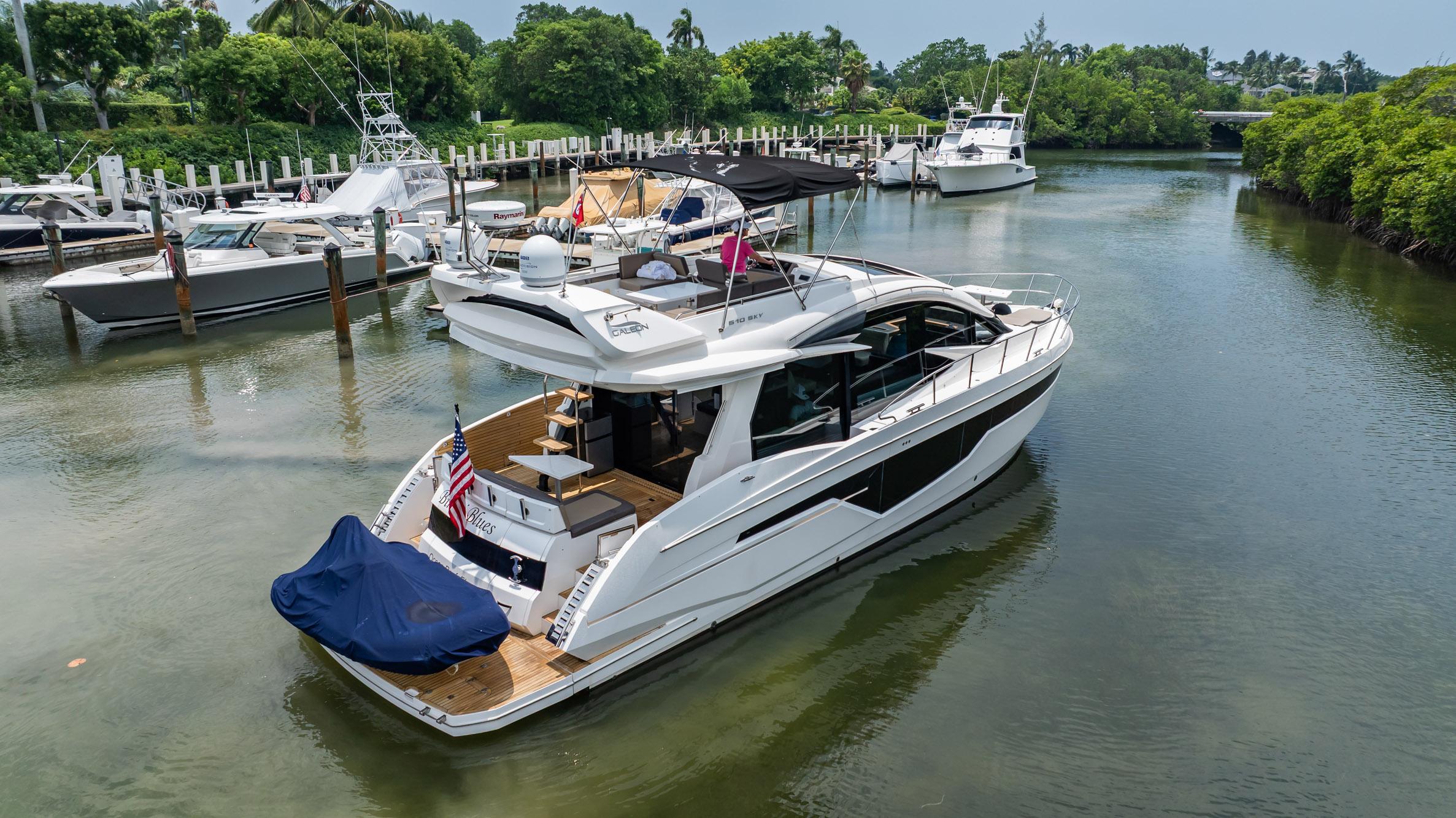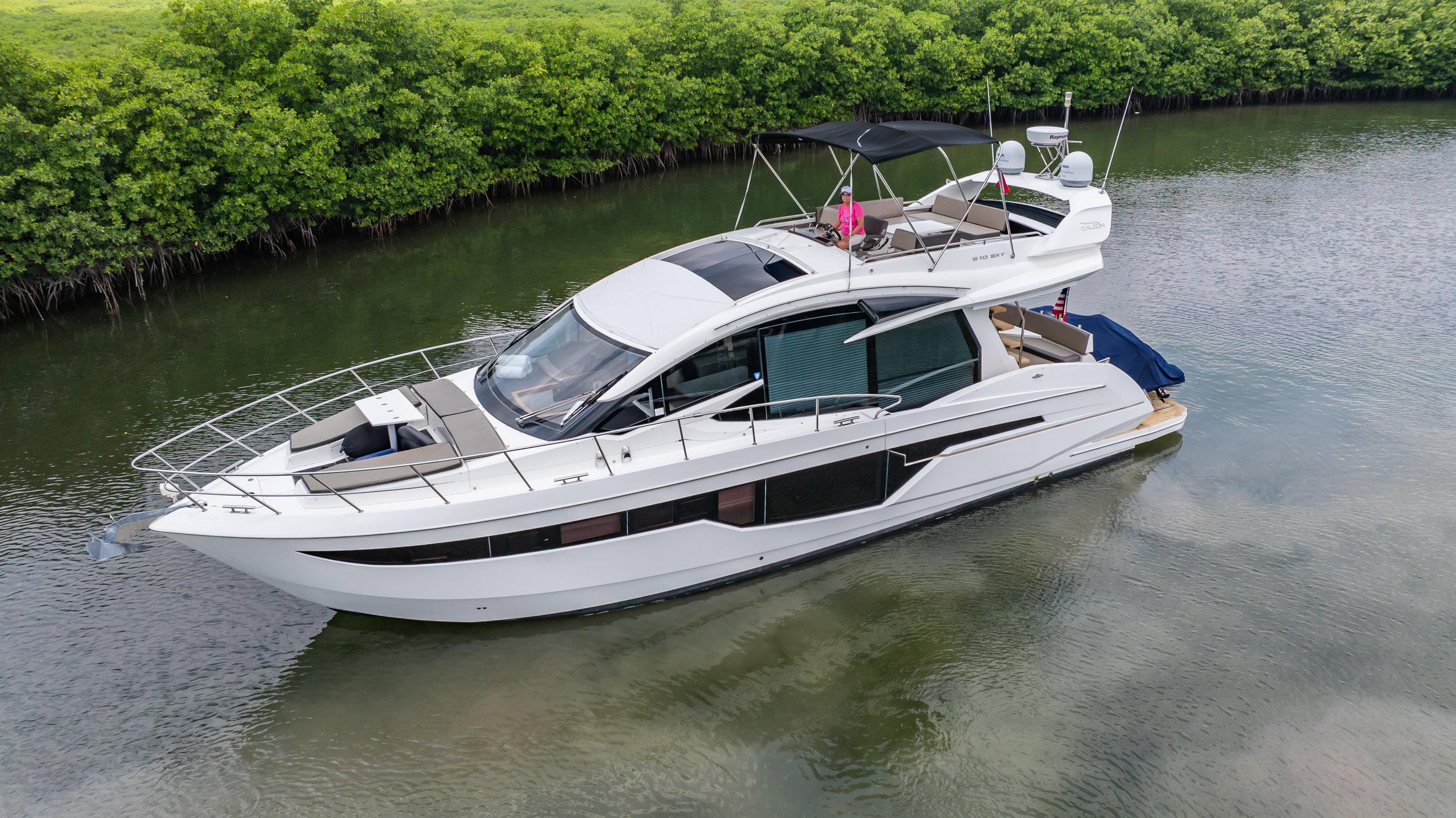 2017 Galeon 510 Skybridge is in nice condition. Its is powered with twin Volvo Penta D11 670hp diesel engines, 3 cabin and 2 head layout. It has a spacious salon, galley aft, dual helm stations, Raymarine electronics, sliding port and starboard side windows, and retractable sunroof, bow and stern thrusters and lots more. Both sides of the boat are deployable and drop down via hydraulic actuators to increase the boat's beam by an additional 5'. Bar stools can be inserted on the portside extension and the aft portside sliding window moves forward to allow a galley counter extension to be opened for pass through bar and meal service. Starboard aft sliding window and swing backrest on couch across from the galley reverses for a great starboard couch facing outwards. The Main Salon aft sliding doors retract and stack to open up access to and from the aft deck wrap-around seating area to the galley. Both port and starboard windows at helm and forward in the salon drop down electronically and when combined with electronically retractable sunroof in salon, give an open airflow and spaciousness that is unseen in any boat in this class size. This boat offers excellent flexibility/access to take advantage of sea breezes and open up the interior to outdoors. Seller is looking for offers!