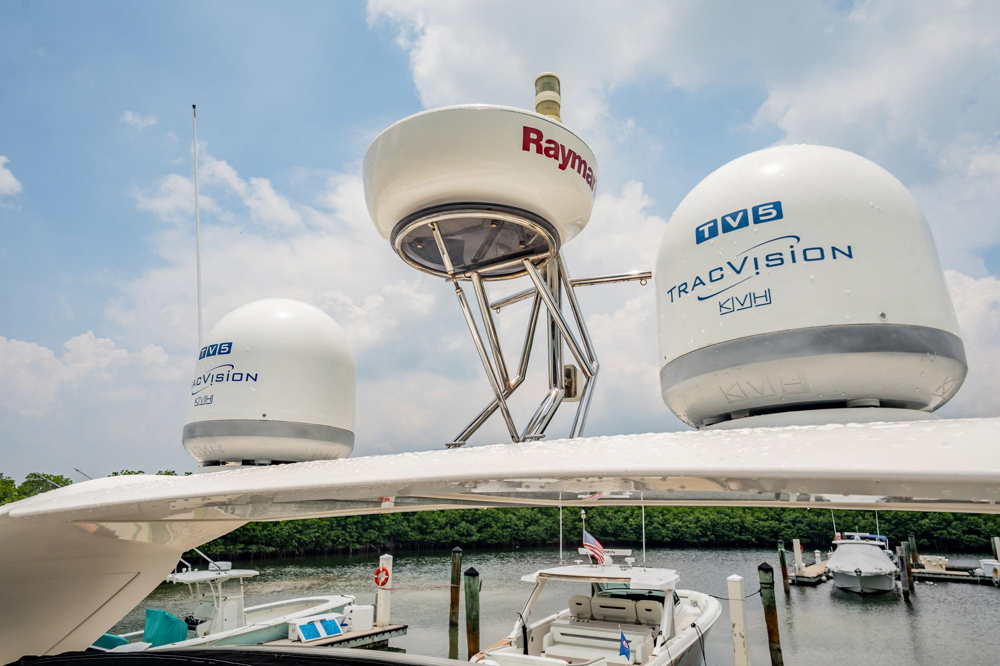 The Skybridge on this model offers exceptional views and visibility when underway and docking, and its electronically retractable cover, allows you so seal it up with the push of a switch to keep it protected when not in use. The retractable closure is excellent for keeping condensation from forming on your upper bridge cushions, and protects the entire helm from the elements. The additional Skybridge fully-equipped helm station offers matching electronic controls and equipment as the lower helm station, so also adds a nice element of safety and redundancy when on longer trips down to The Bahamas. This boat also features a massive aft storage area, accessible from transom hatch off of the swim platform that is ideal for storing dive tanks, scuba and fishing gear, or can be converted to a crew quarters. It also gives additional engine room access through an internal doorway.