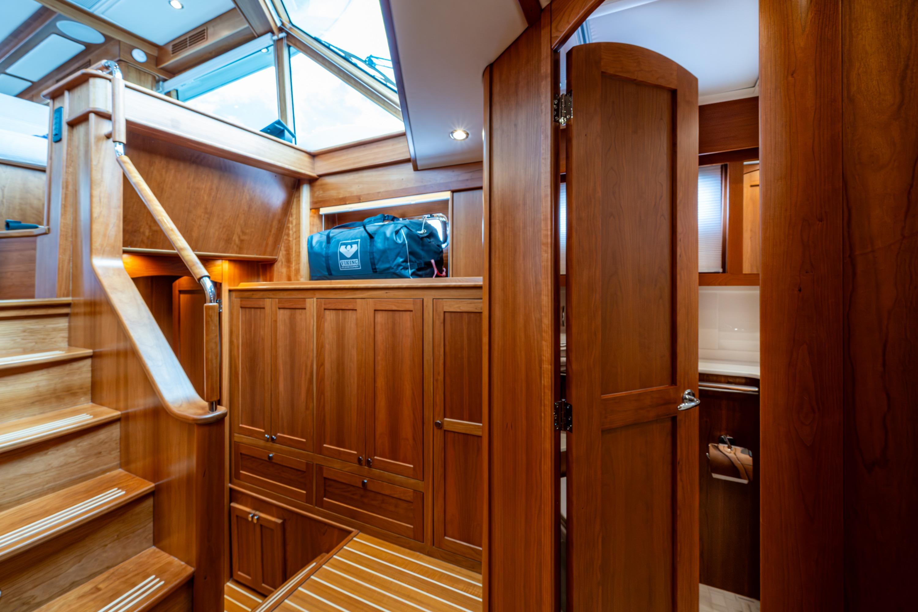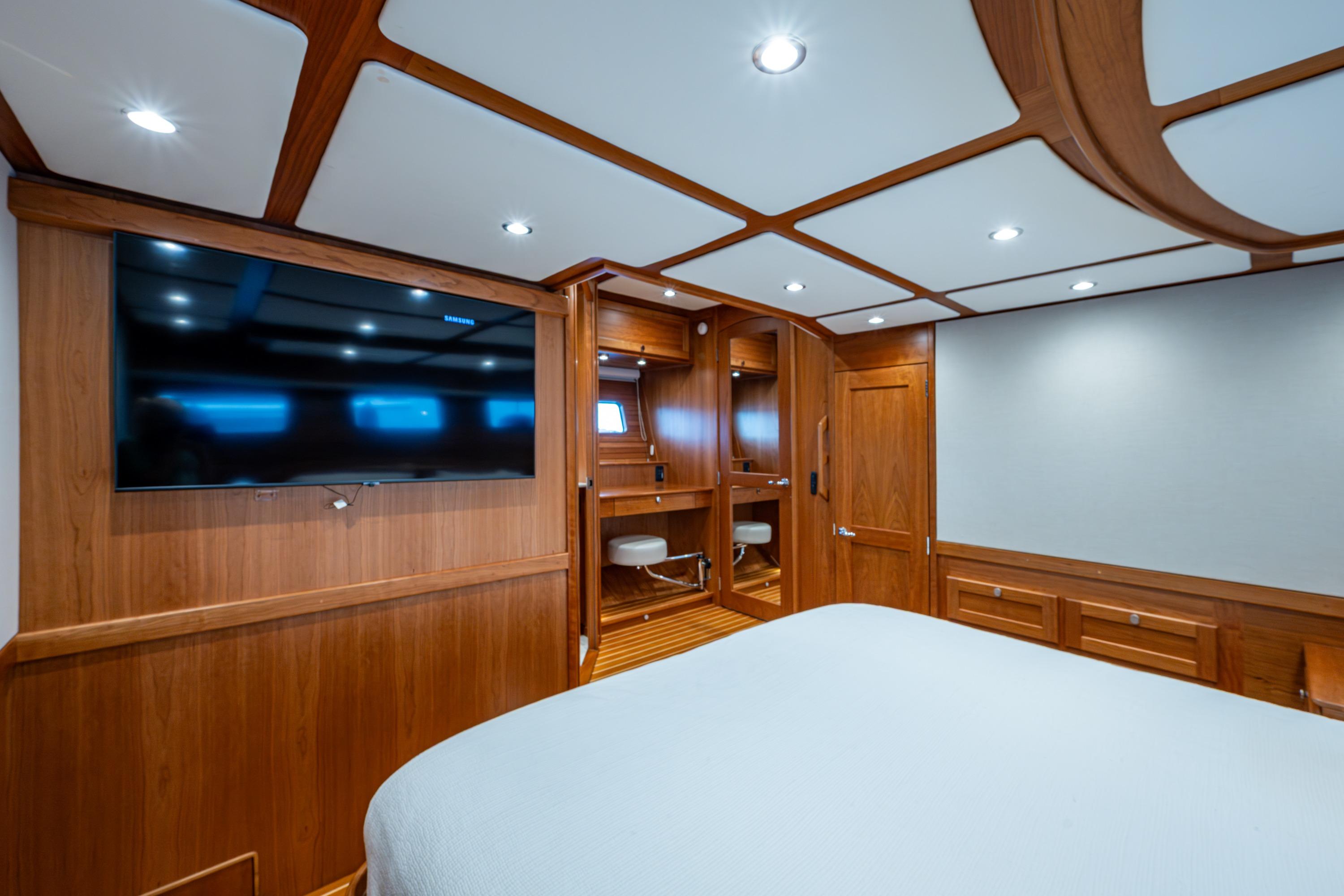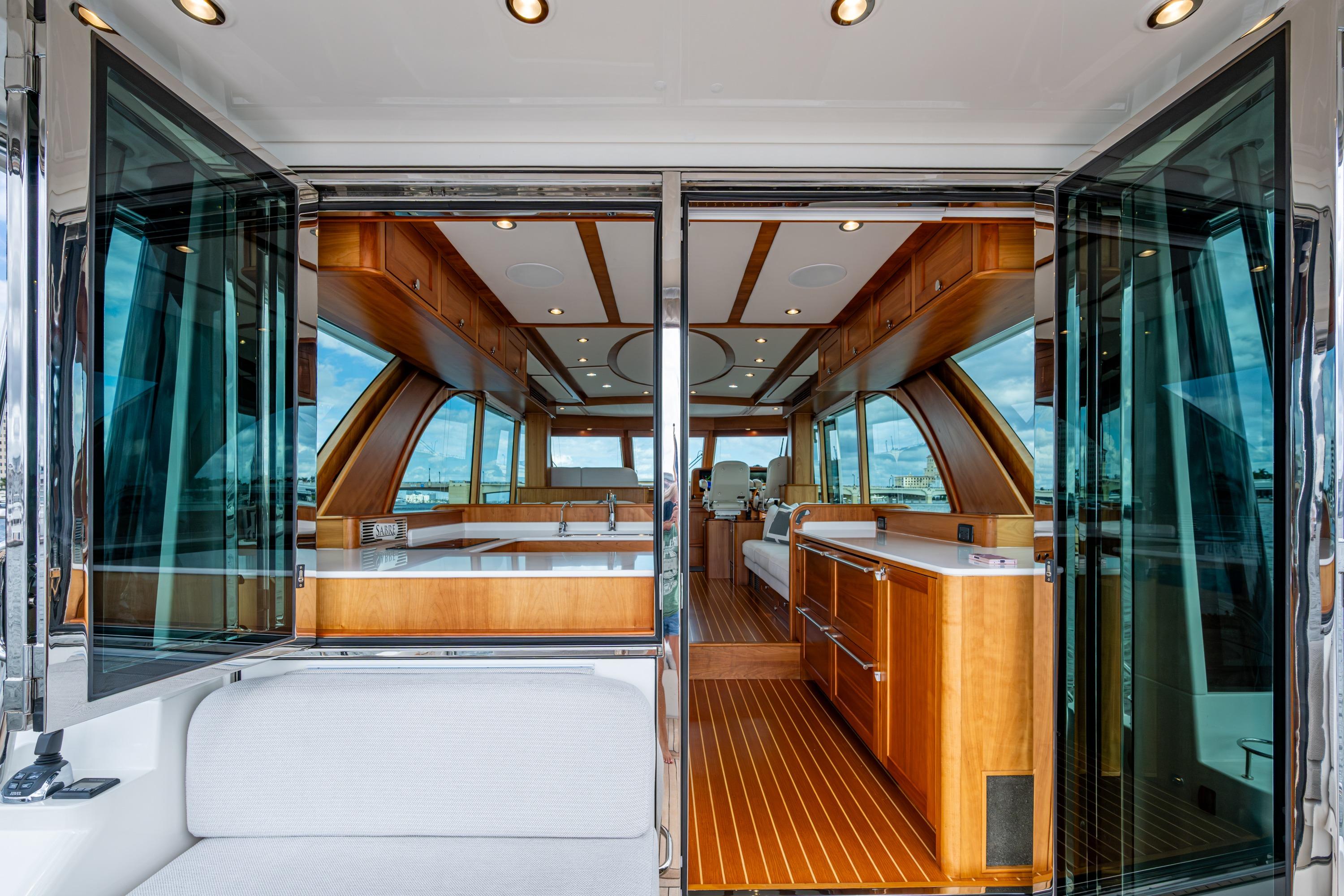 Sabre created a three stateroom, three head layout that is the envy of the industry. The king sized master suite is amidships, is full beam, and adjoined by ensuite facilities. The guest VIP is forward, has a queen berth, and immediate access to ensuite facilities. Additionally, a second guest suite is to starboard which sleeps two on twin lower berths (which slide together if preferred), and includes ensuite facilities. Each suite provides Apple TV for entertainment, an abundance of locker and drawer storage, separate air conditioning/heat controls and either port lights or hatches for natural light.
