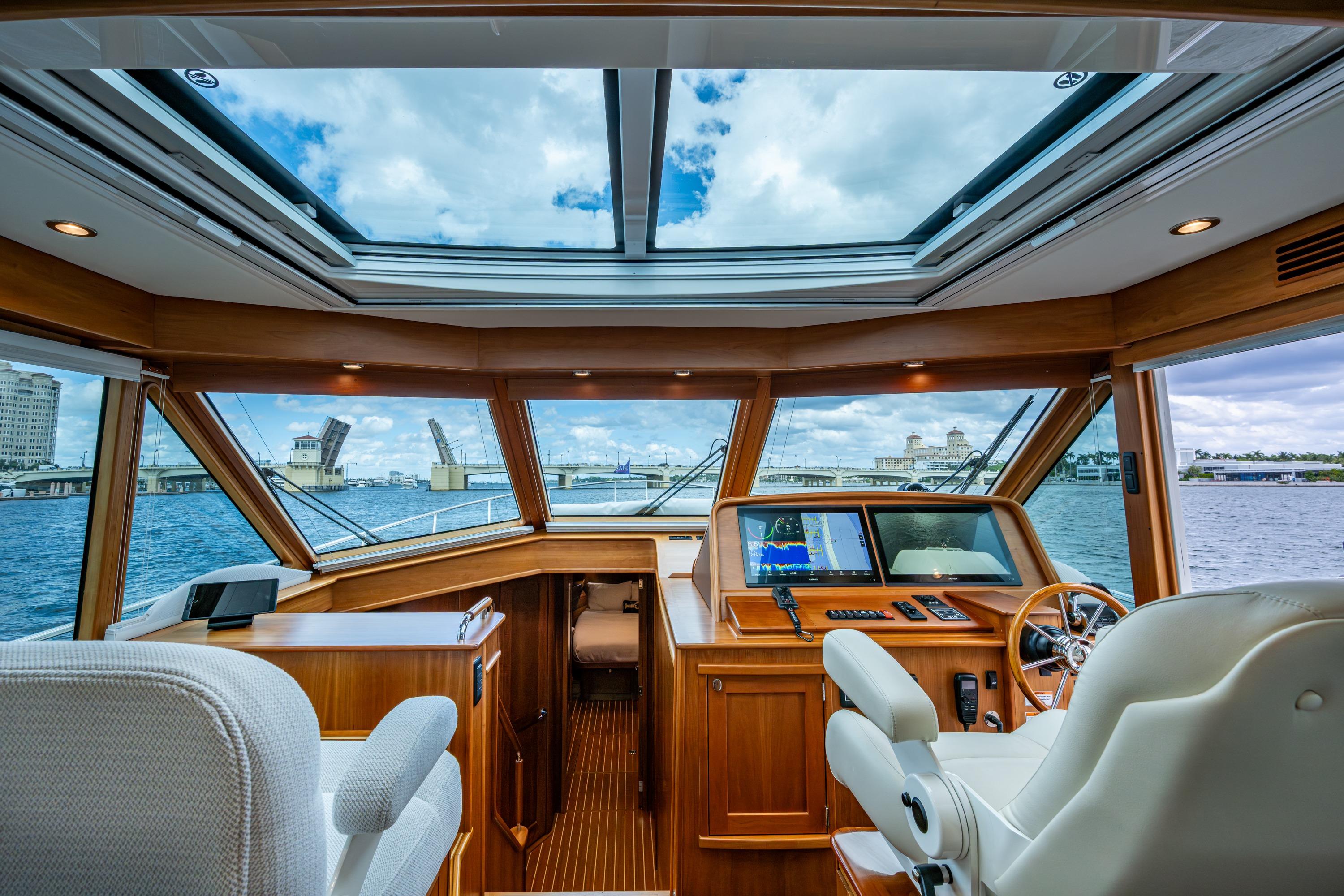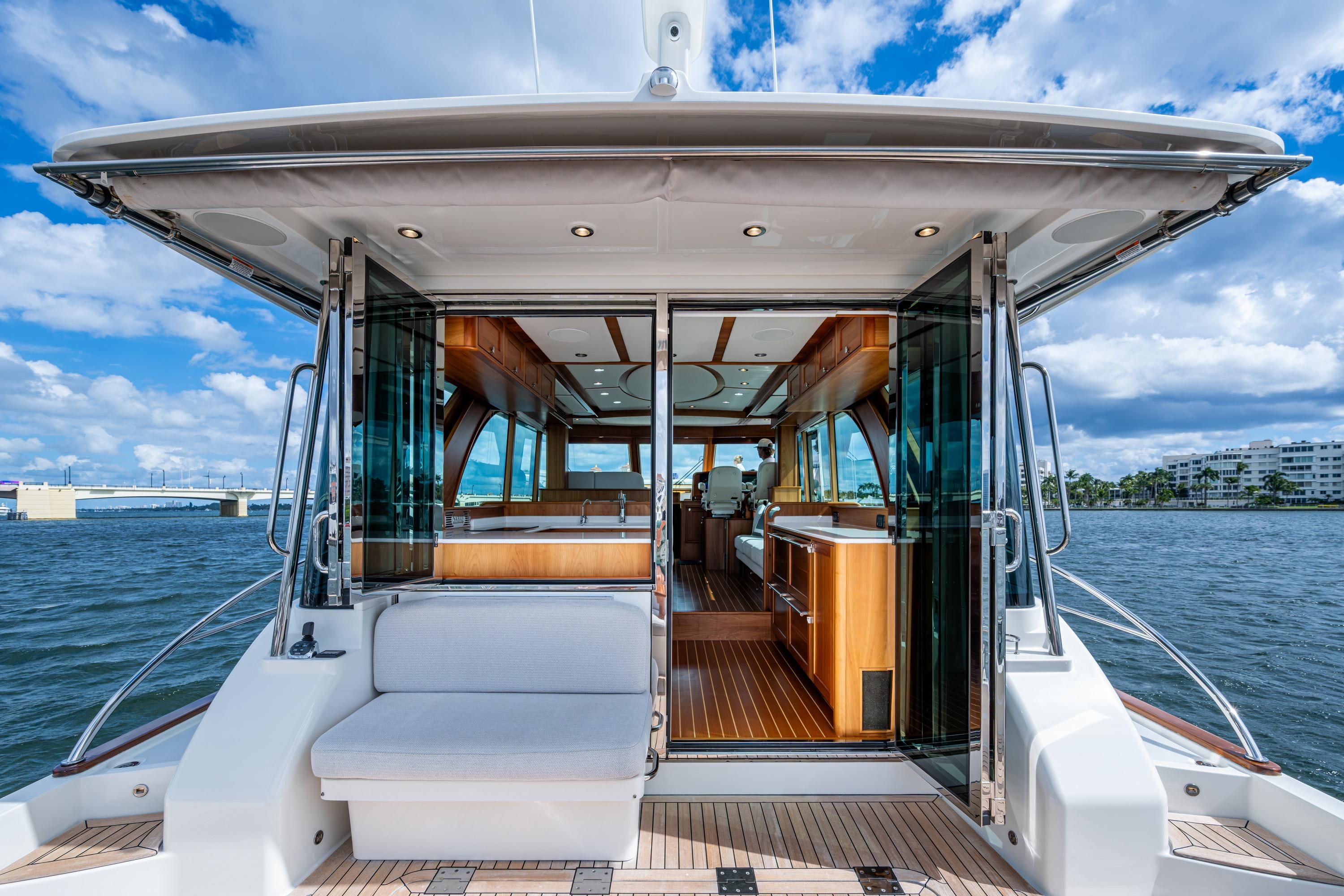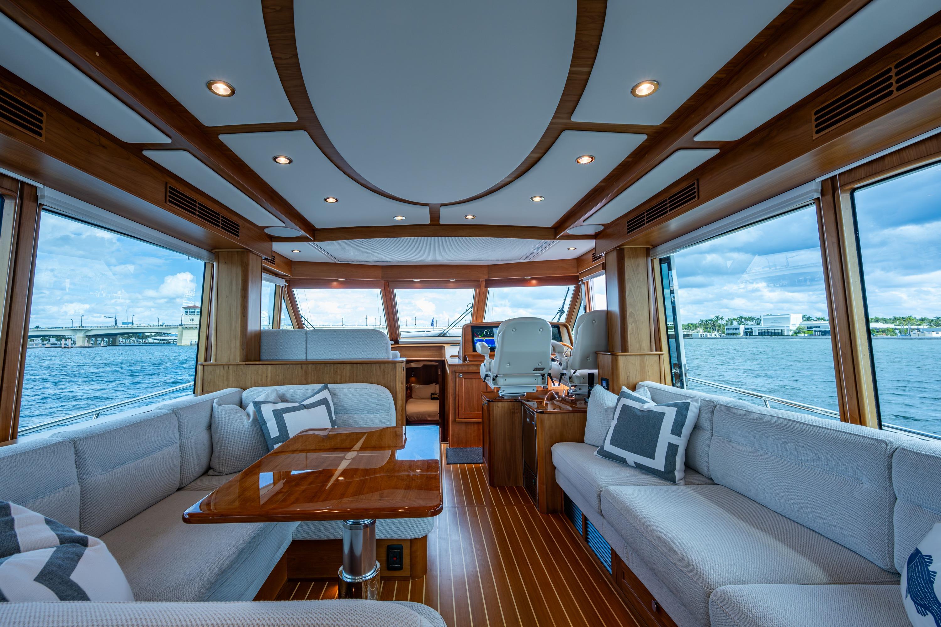 The main deck cleverly combines a fully outfitted aft galley, large U-shaped dinette, an oversized straight couch, helm station, forward facing STIDD companion seating, abundant storage, a disappearing 50" TV, handy icemaker, a helm area entry door, and access to the spacious aft deck through a double action stainless steel door system.