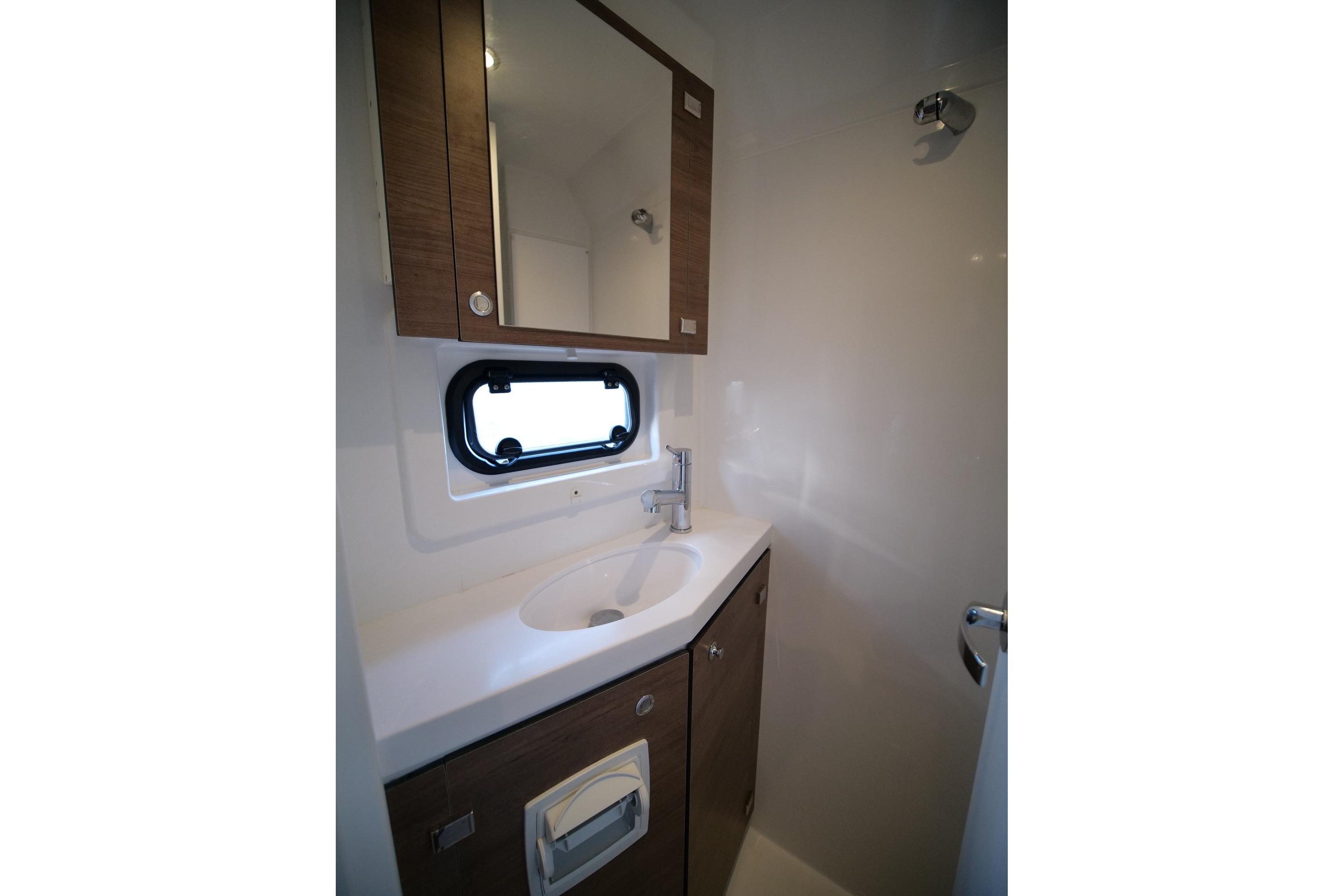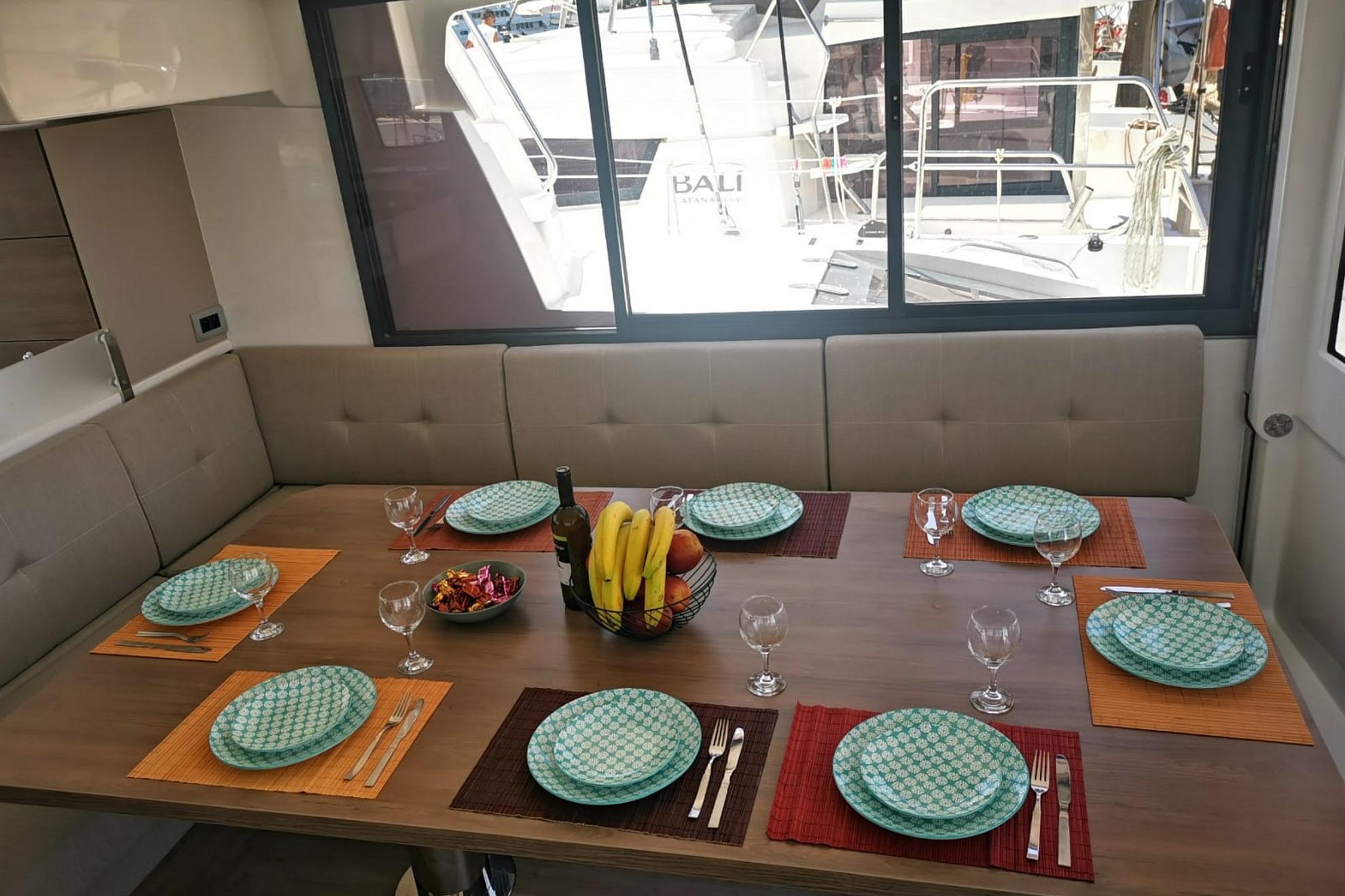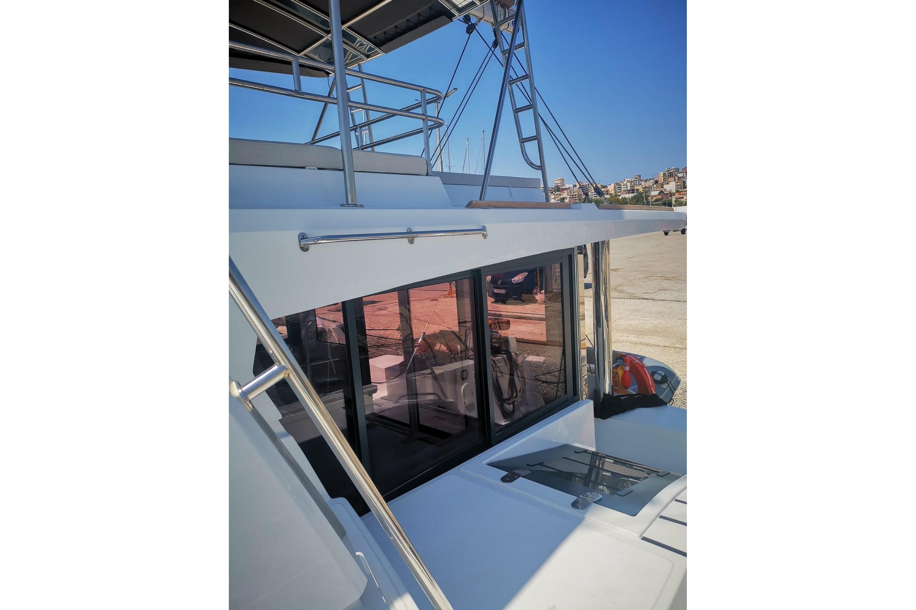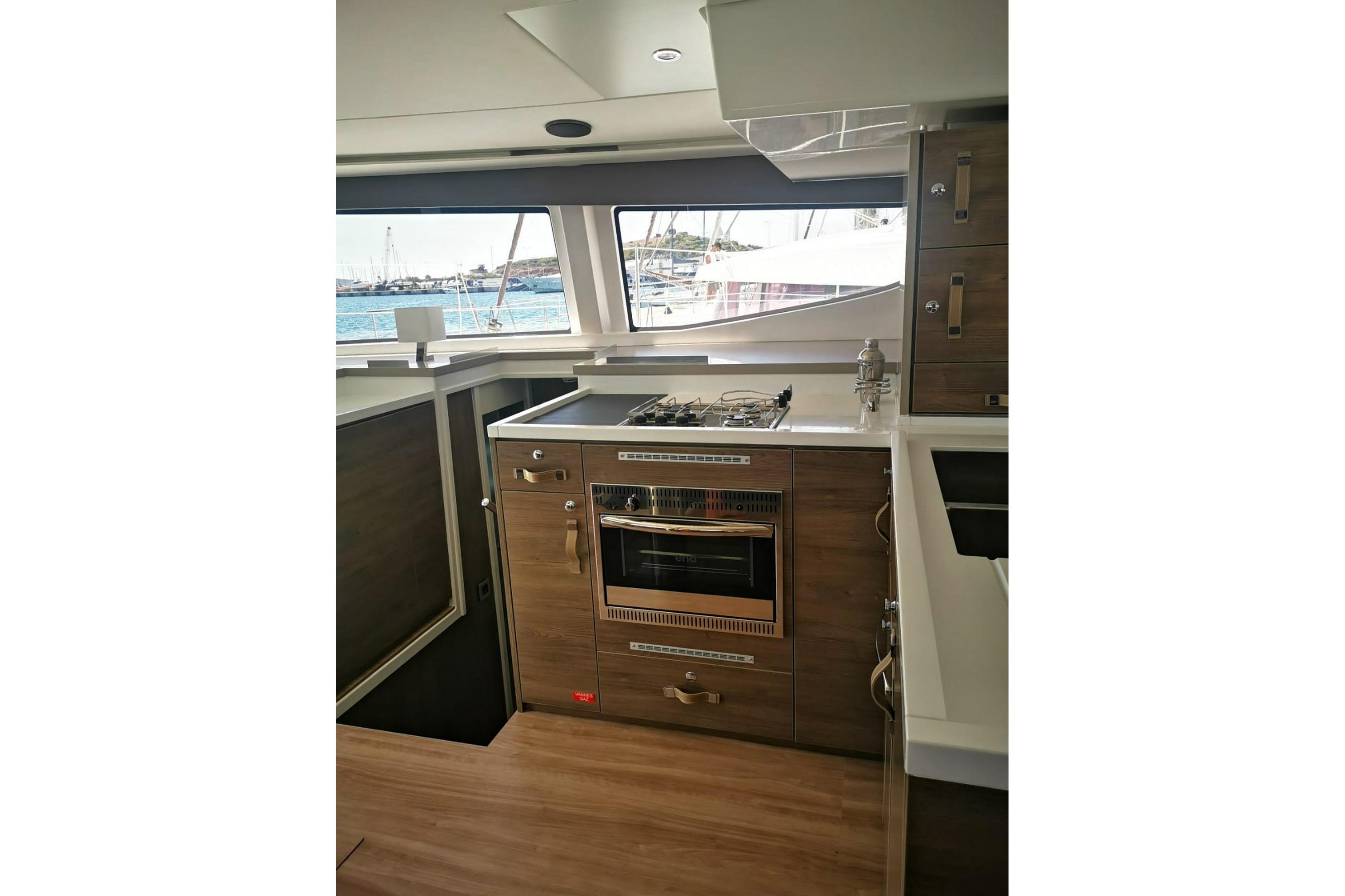 The BALI 4.8 has a fully open-air central nacelle accessible through a huge tilt-and-turn glass door at the rear and a door at the front, allowing you to switch from navigation to lounge mode in the blink of an eye. The large windows pro-vide exceptional natural ventilation and panoramic views. The large, fully retractable galley window allows communication with the forward cockpit. A totally open space with a panoramic view of the sea!
