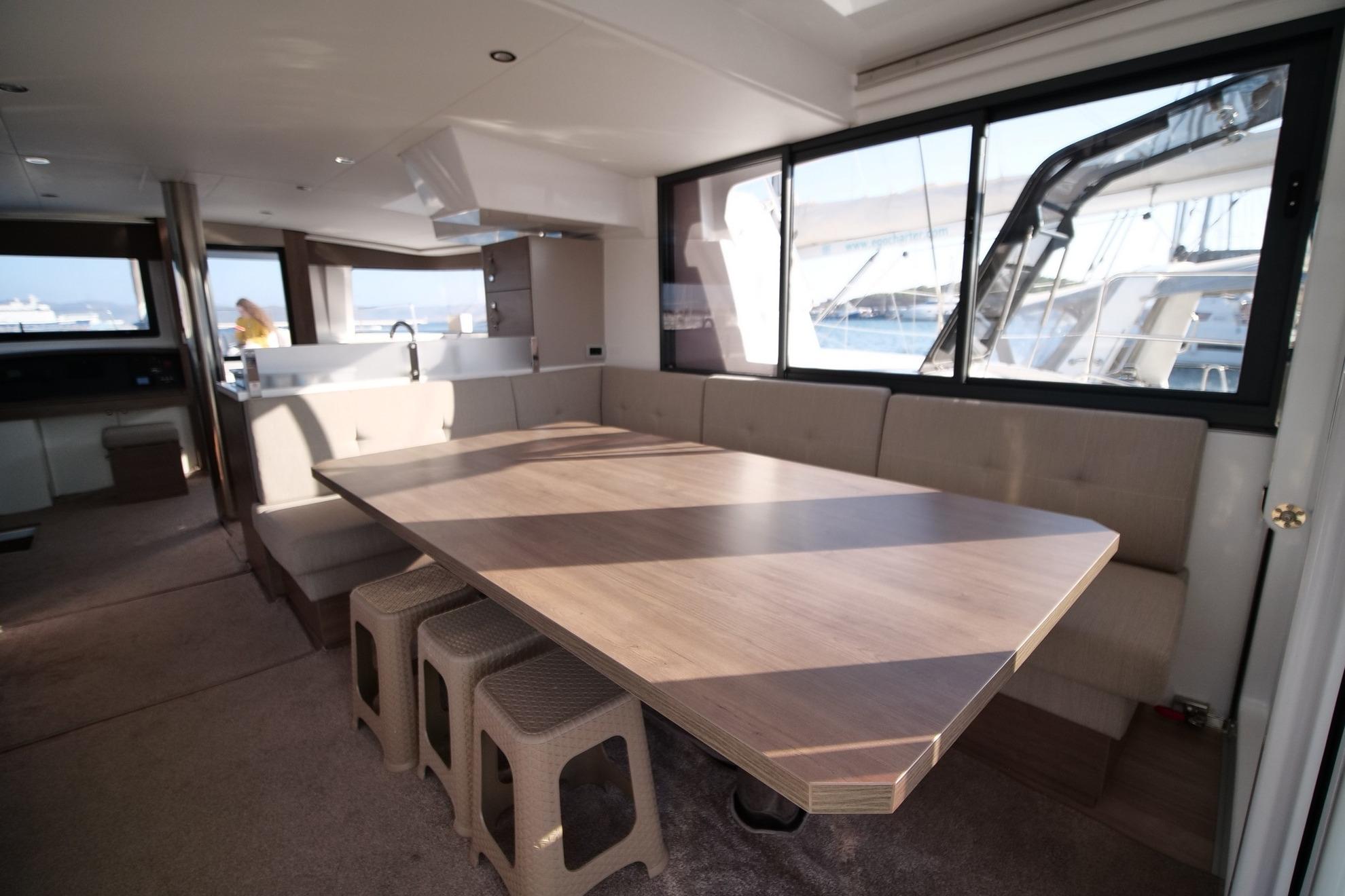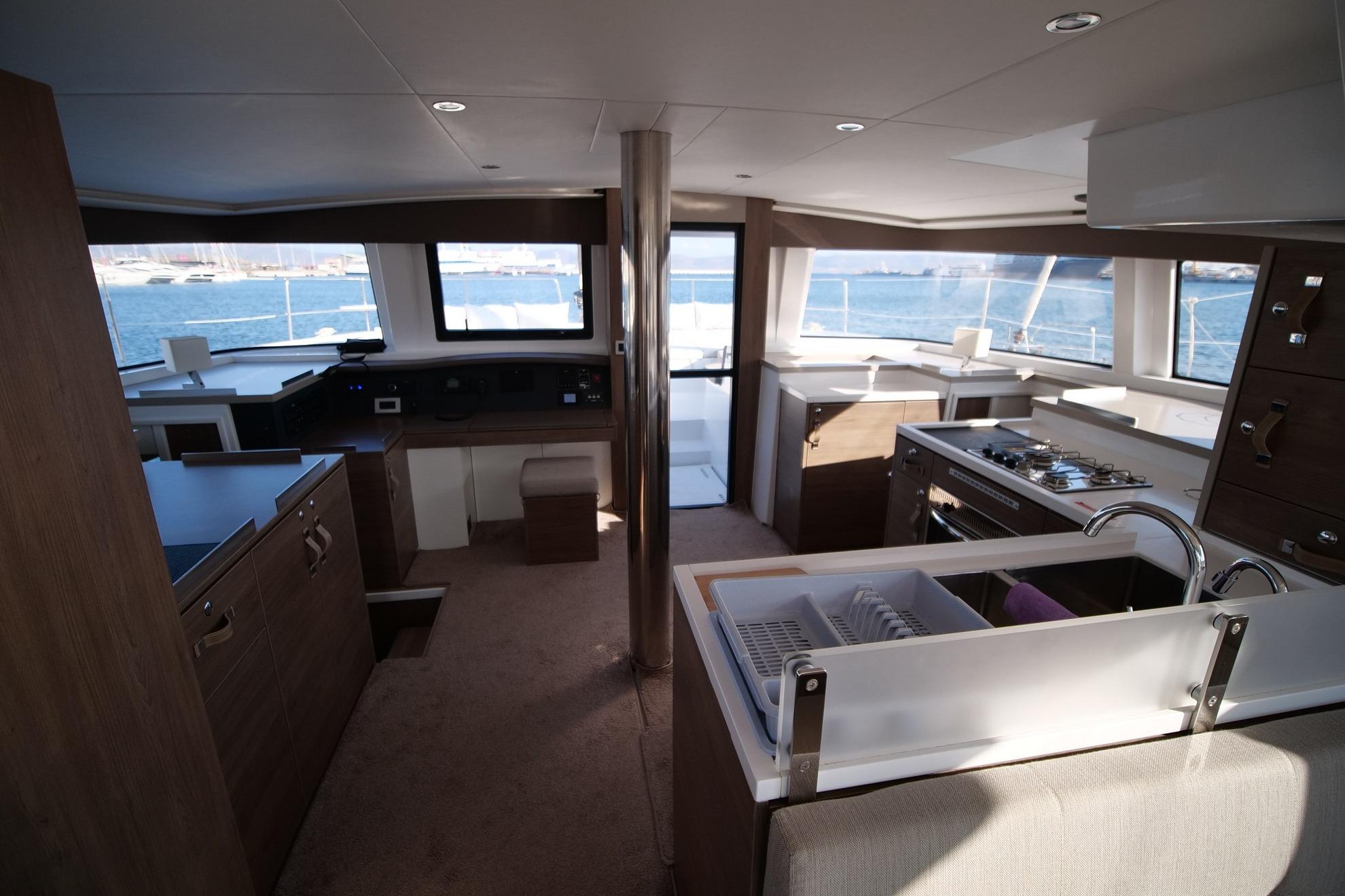 The large galley and the vast chart table are models of ergonomics and comfort. The design is contemporary and warm. A completely open space, bathed in light with a panoramic view of the sea