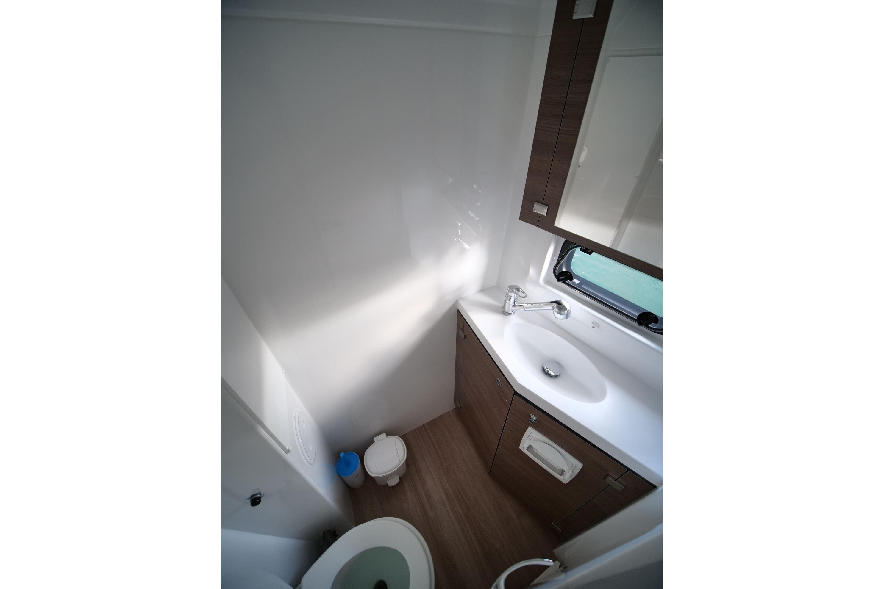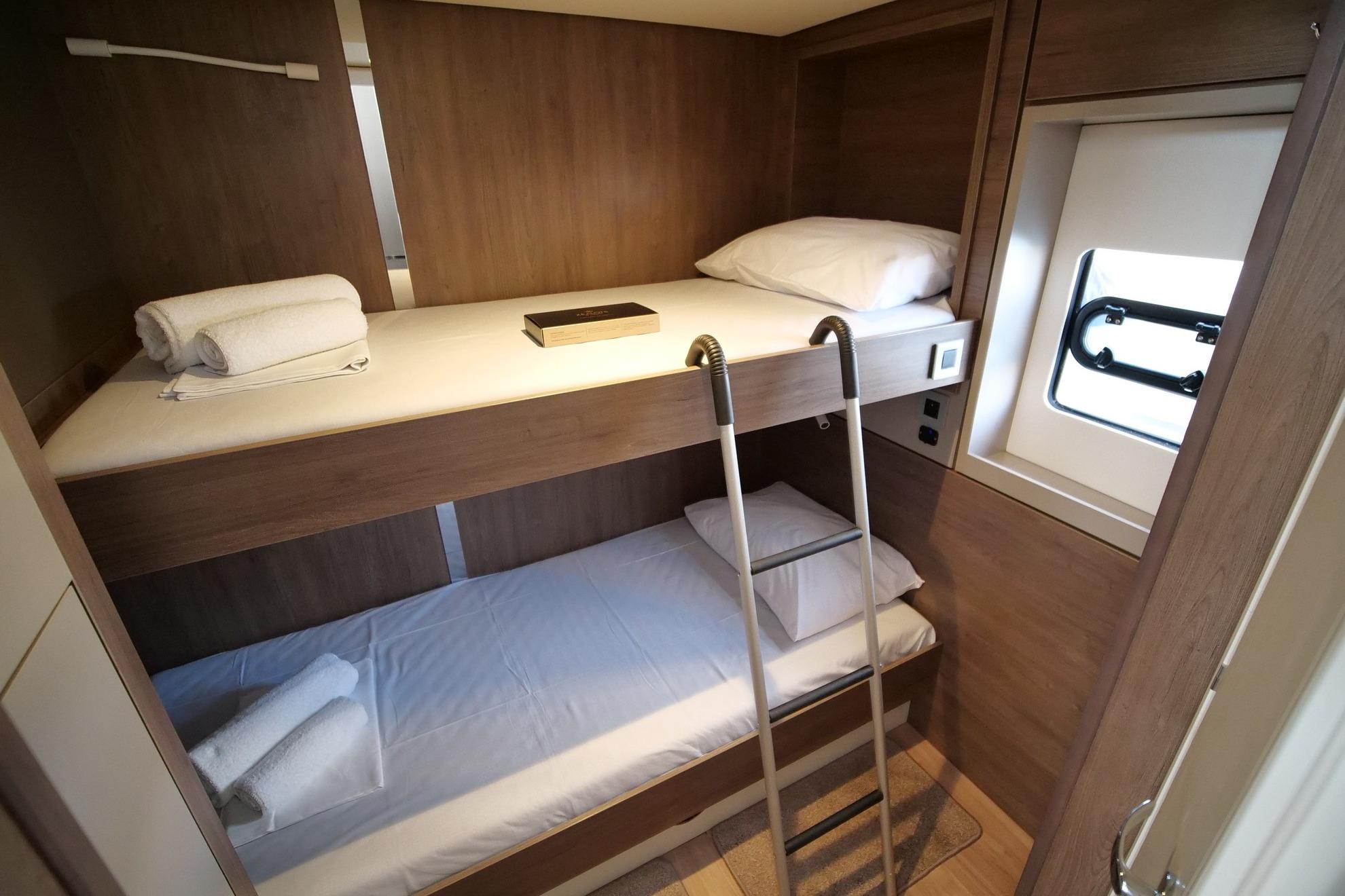 All the innovative features of the French shipyard are present in the Bali 4.8 Eagle: a spacious flybridge, solid foredeck with direct saloon access, large garage-style aft door, U-shaped omega beam, and vast storage areas. Eagle offers 4 double cabins, 1 twin cabin with bunk beds, and a skipper’s cabin with WC — all equipped with private bathrooms.