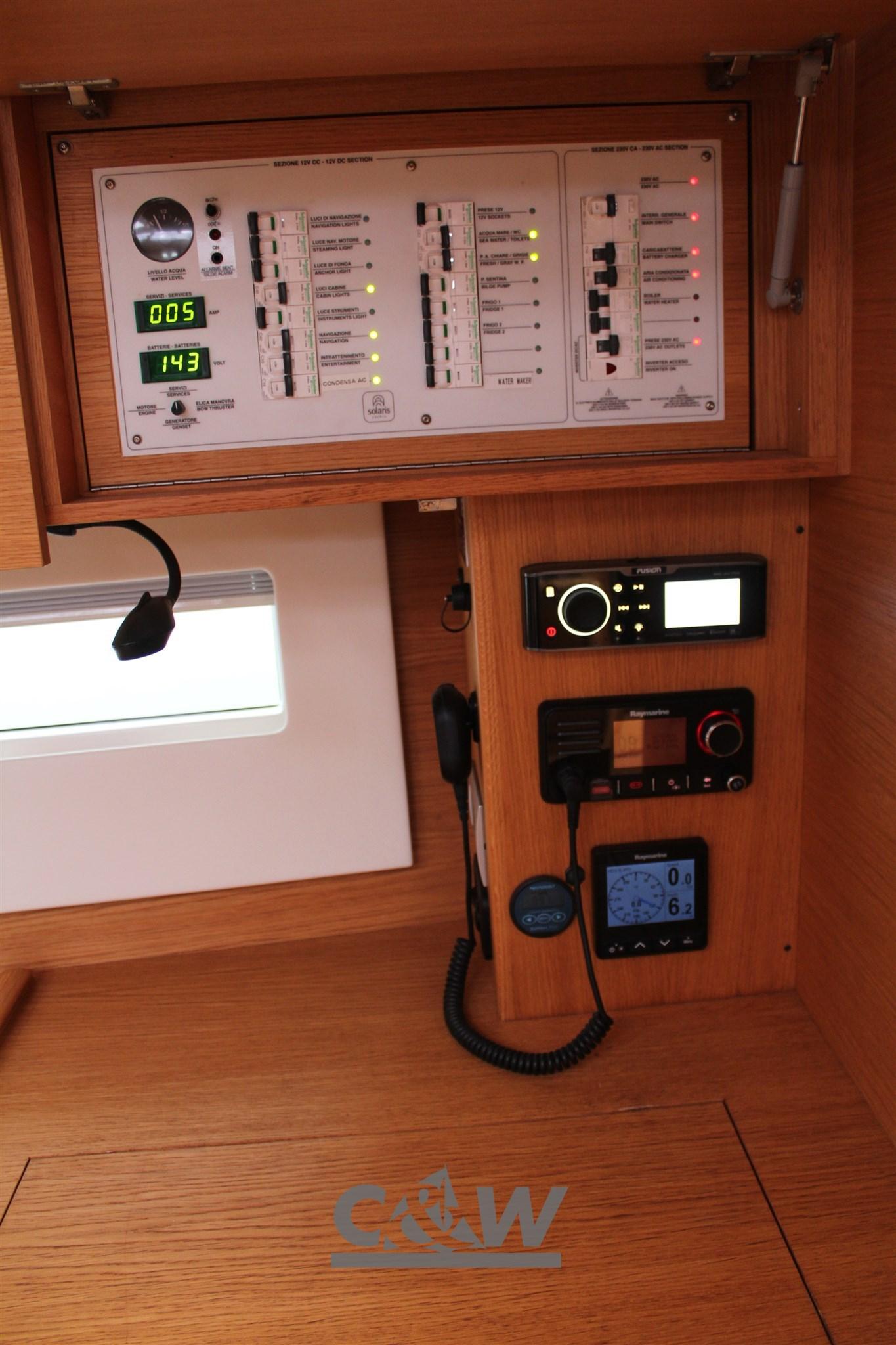 Depth Sounder (Raymarine I70s), Autopilot (Raymarine EV1-ACU400), Plotter with GPS antenna (Raymarine eS75 Hybrid Touch), Radar (Raymarine), VHF Radio (Raymarine Ray 60 con handset), Wind Station (Raymarine i70s).