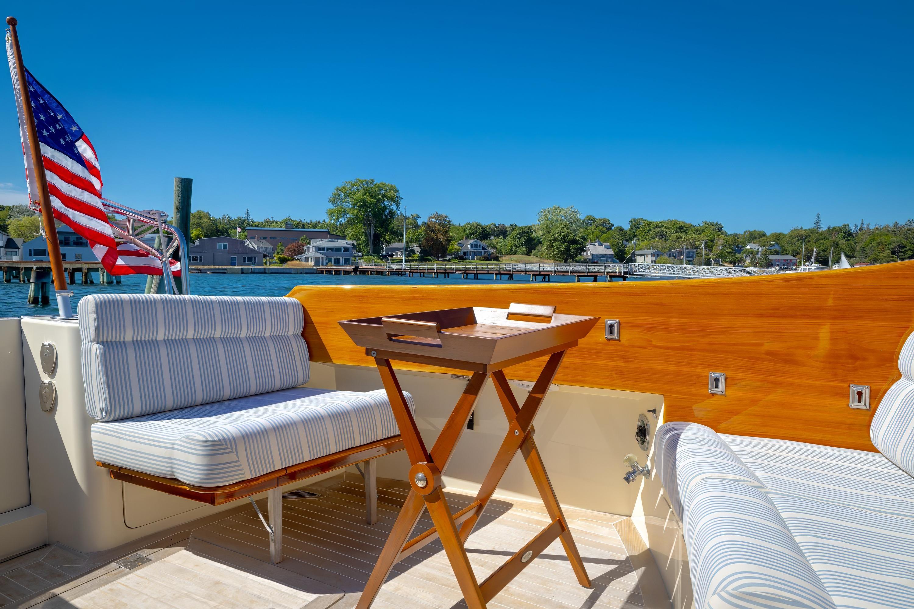 - Tapered, varnished teak toe rail with Hinckley profile and varnished teak trim.