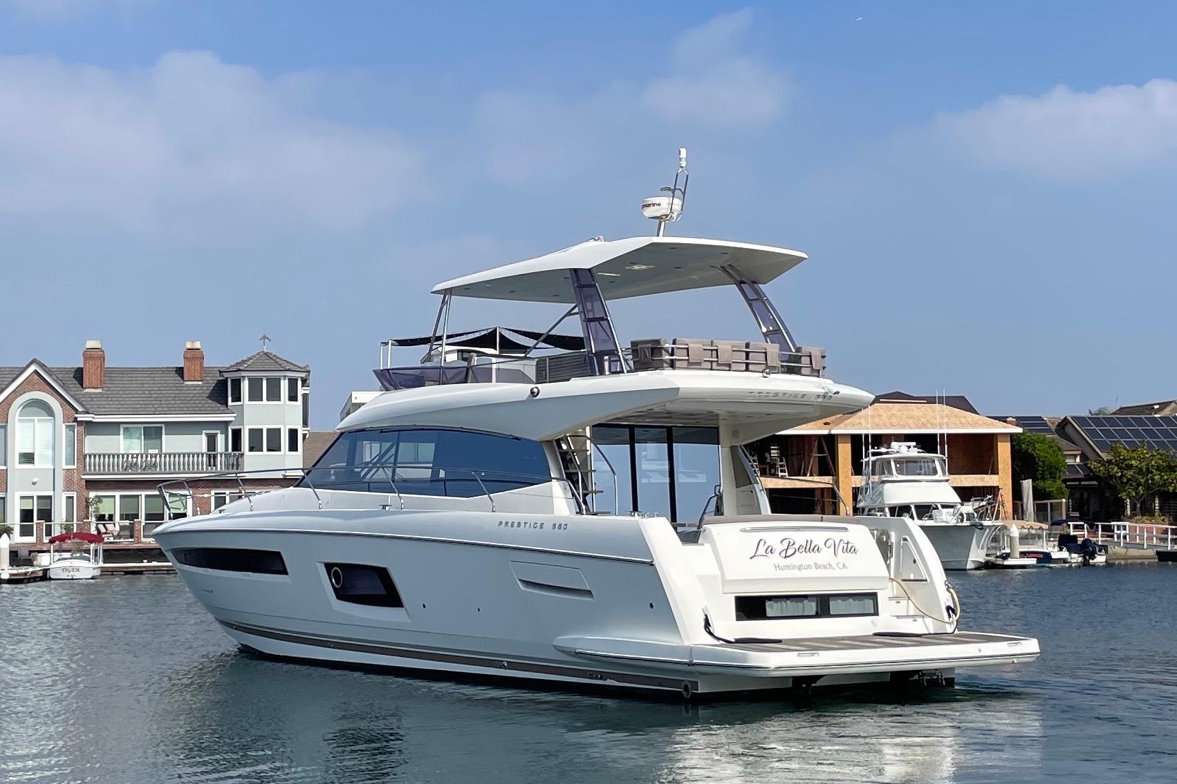 Introducing the stunning 2017 Prestige 560 Flybridge, a remarkable vessel that embodies luxury and performance. With an overall length of 56 feet, this flybridge yacht is crafted from durable fiberglass, featuring a modified vee hull shape that ensures smooth navigation and stability on the water. Powered by twin Cummins QSC 8.3 HO inboard engines, each delivering an impressive 600 horsepower, this yacht offers a cruising speed of 24 knots and a maximum hull speed of 30 knots, making it perfect for exhilarating adventures. With only 350 hours of use, these engines promise reliability and power. The accommodation is thoughtfully designed with four cabins and three heads, providing ample space for relaxation and comfort. Notable features include joystick control for effortless maneuvering, enhancing the overall boating experience. Experience the elegance and performance of "LA BELLA VITA," where every journey becomes a memorable escape.
