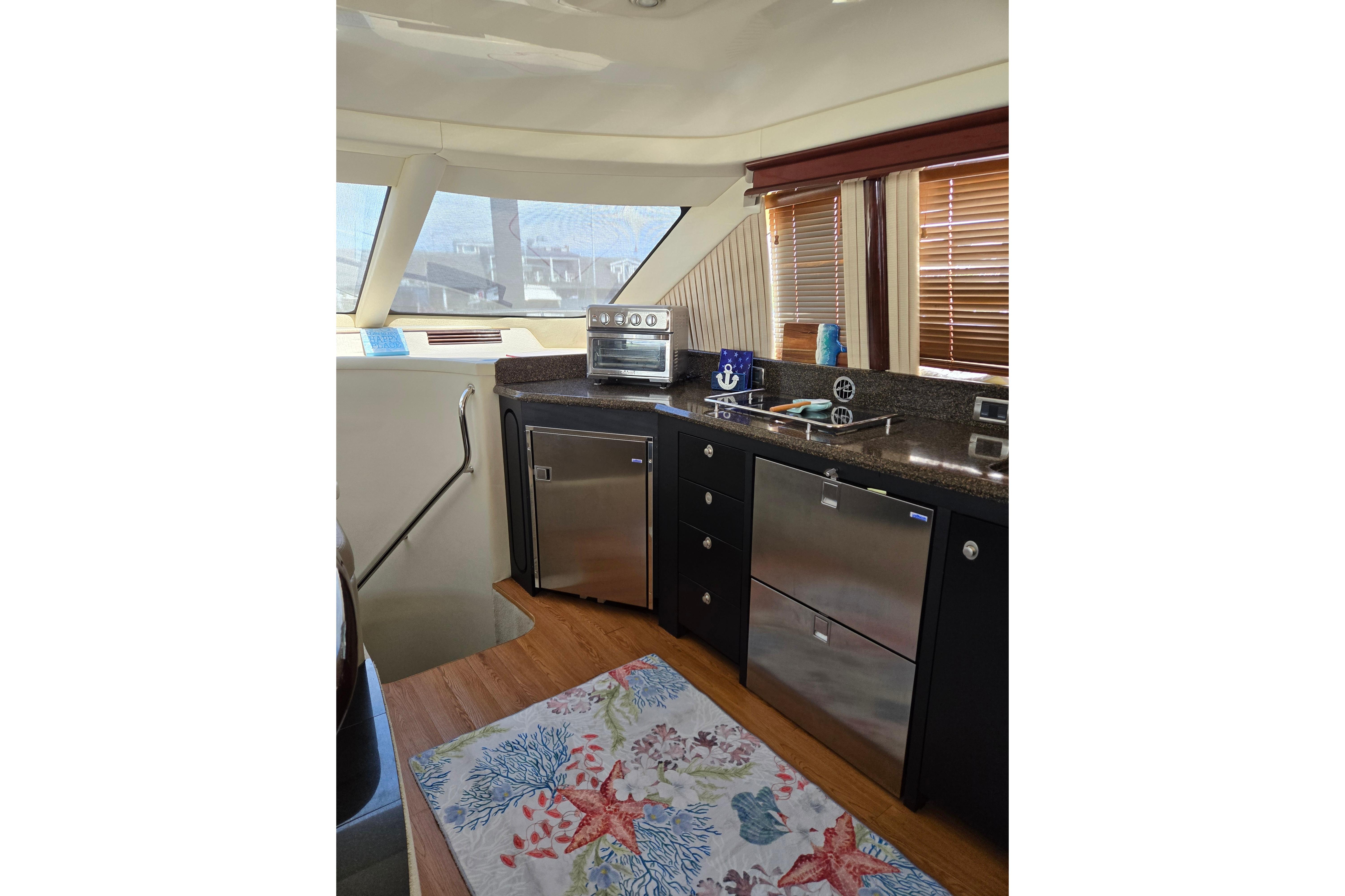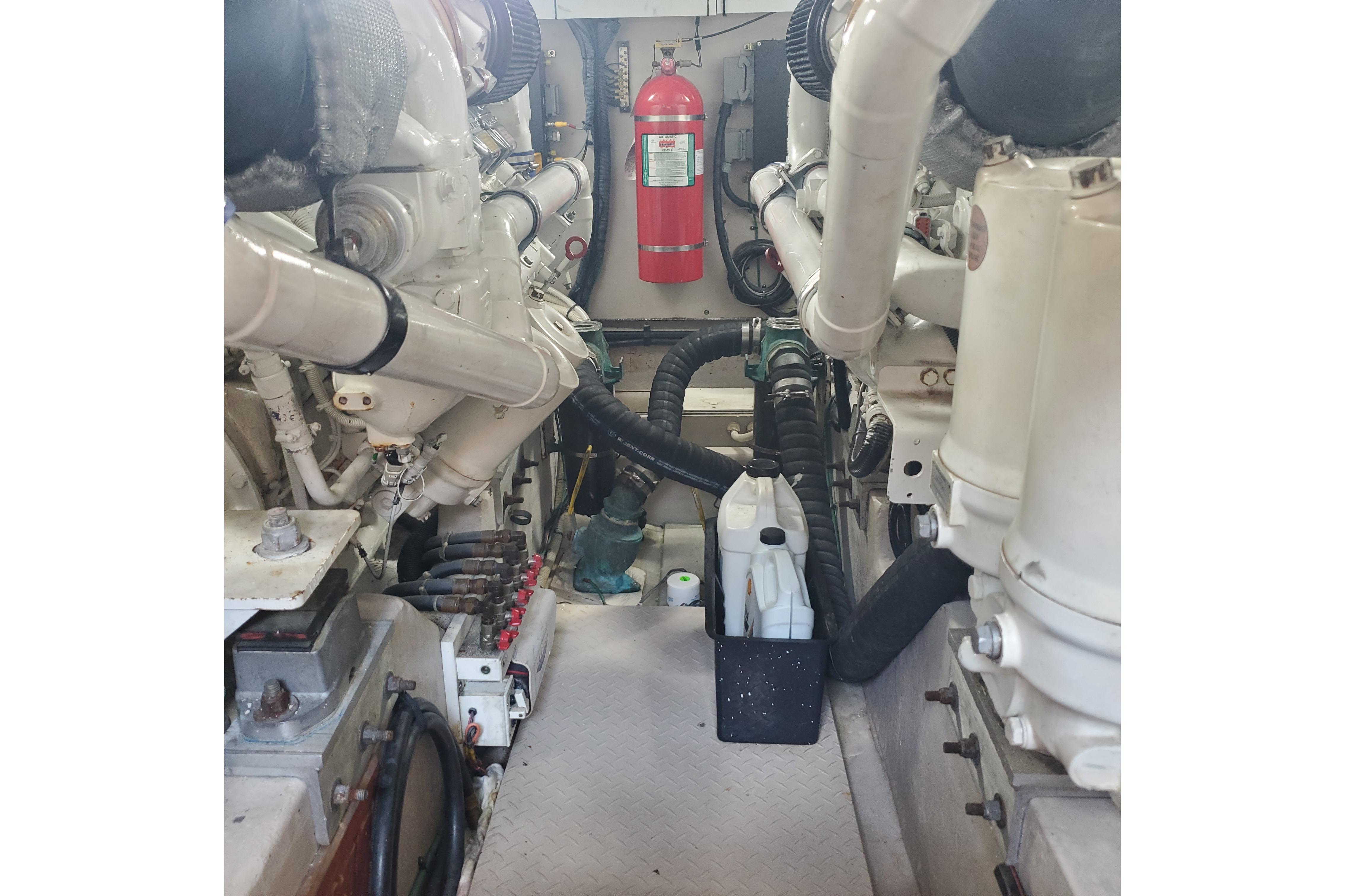 YARD MAINTAINED VESSEL. SPOTLESS1 900 HP MANNS. A1 &A2 SERVICE DONE. FROM HER HARD TOP WITH FULL STRATOGLASS(NEW ENCLOSURE) TO HER HYDRAULIC SWIM PLATFORM EVERYTHING WORKS, THE HUGE FLYBRIDGE HAS REFRIGERATOR, AIR CONDITIONING, A GREAT AMOUNT OF GUEST SEATIMG, LARGE WELL APPOINTED HELM STATION, WITH RADAR, COLOR CHART PLOTTER, AUTO PIOLET, ENGINE MONITERS, VHF, STANDARD ENGINE GUAGES, HELM CHAIRS, CARPETING, HELM COVER AND STAIRS TO THE BRIDGE. SHE HAS THREE STATEROOMS, 2 FULL HEADS WITH STALL SHOWERS, WASHER AND DEYER, FULL GALLEY WITH SS APPLIANCES, CUSTOM BLACK GALLEY CABNETRY(NO FADING) RAISED DINETTE, TWIN SALON SETTES, GA, SLIDING GLASS FOORS TO THE COCKPIT, FULLCOCKPIT CANVAS, TRANSOM DOOR, HYDRAULIC SWIM PLATFORM. BOW RAILS, WIDE ACCESS TO FORE DECK, ELECTRIC WINCH WITH ANCHOR AND RODE, FOOT PEDALS,AND BRIDGE CONTROLS. COAST GUARD PACKAGE. FENDERS AND LINES