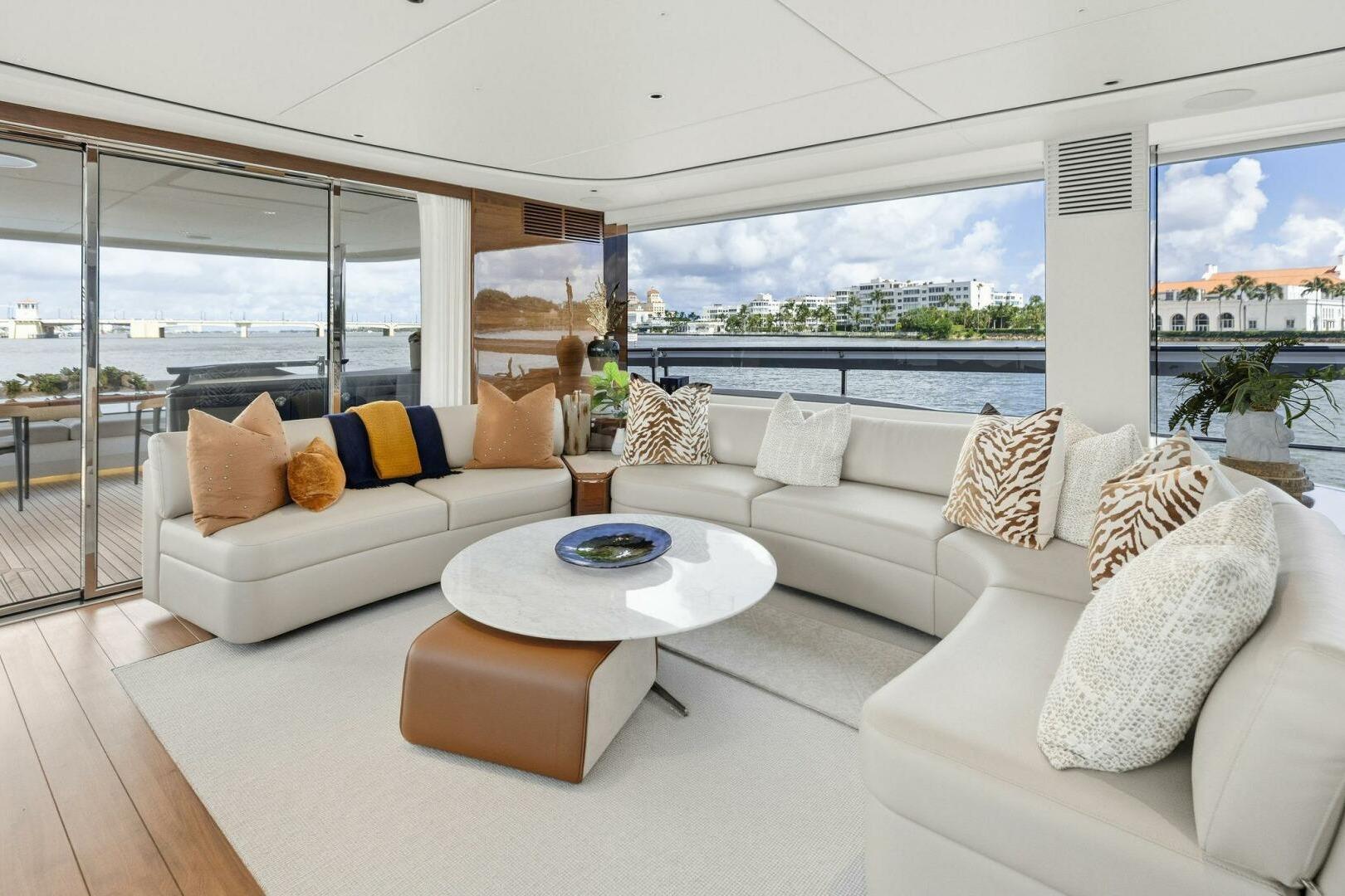 - Salon: circular sofa (port), 2-seater sofa (starboard), coffee table, bar with fridge, icemaker, sink, storage