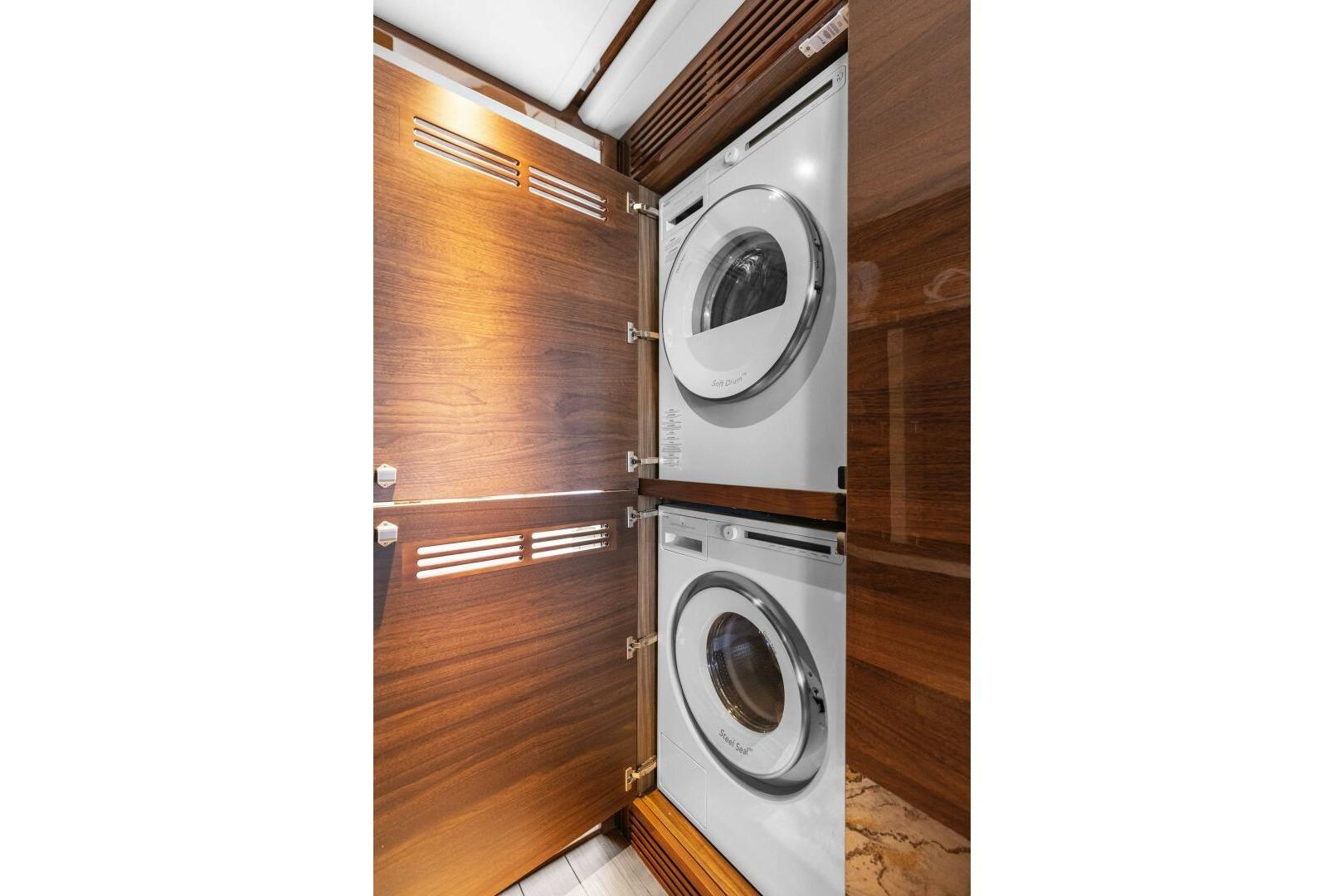 - Flybridge port bar: BBQ, induction hob, fridge, sink, waste bin