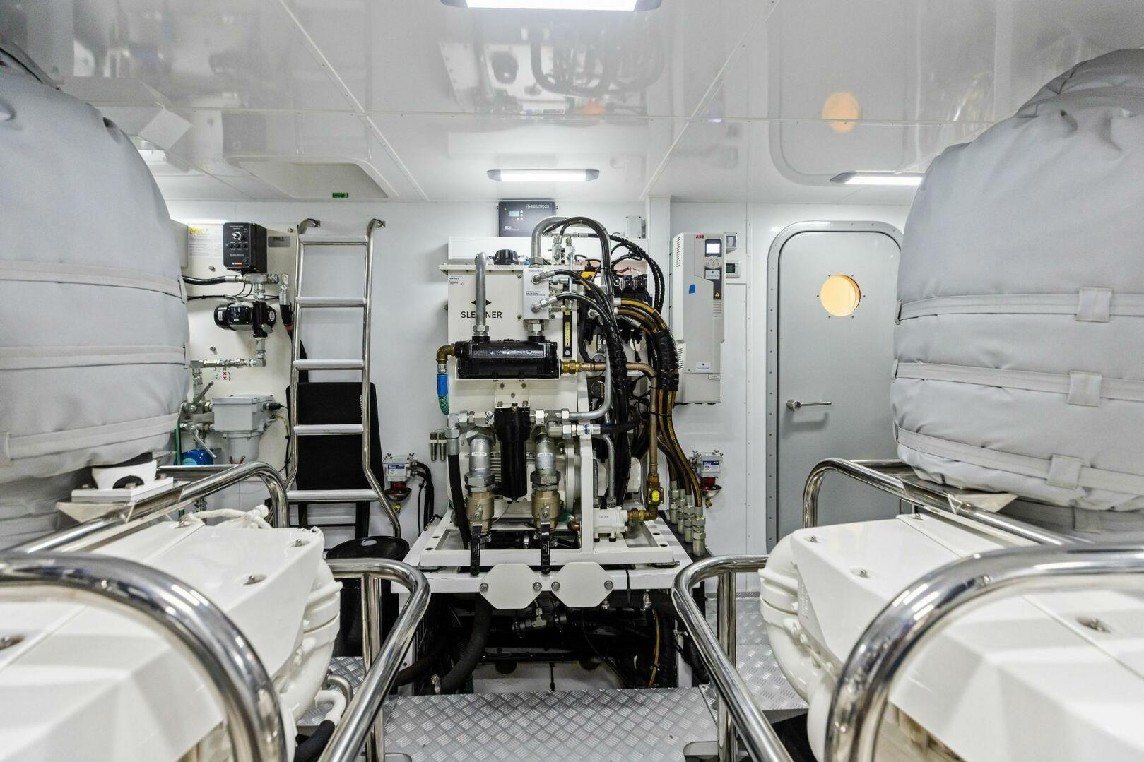- Wing station controls (engine, thruster, follow-on tiller, emergency stops) on starboard flybridge coaming