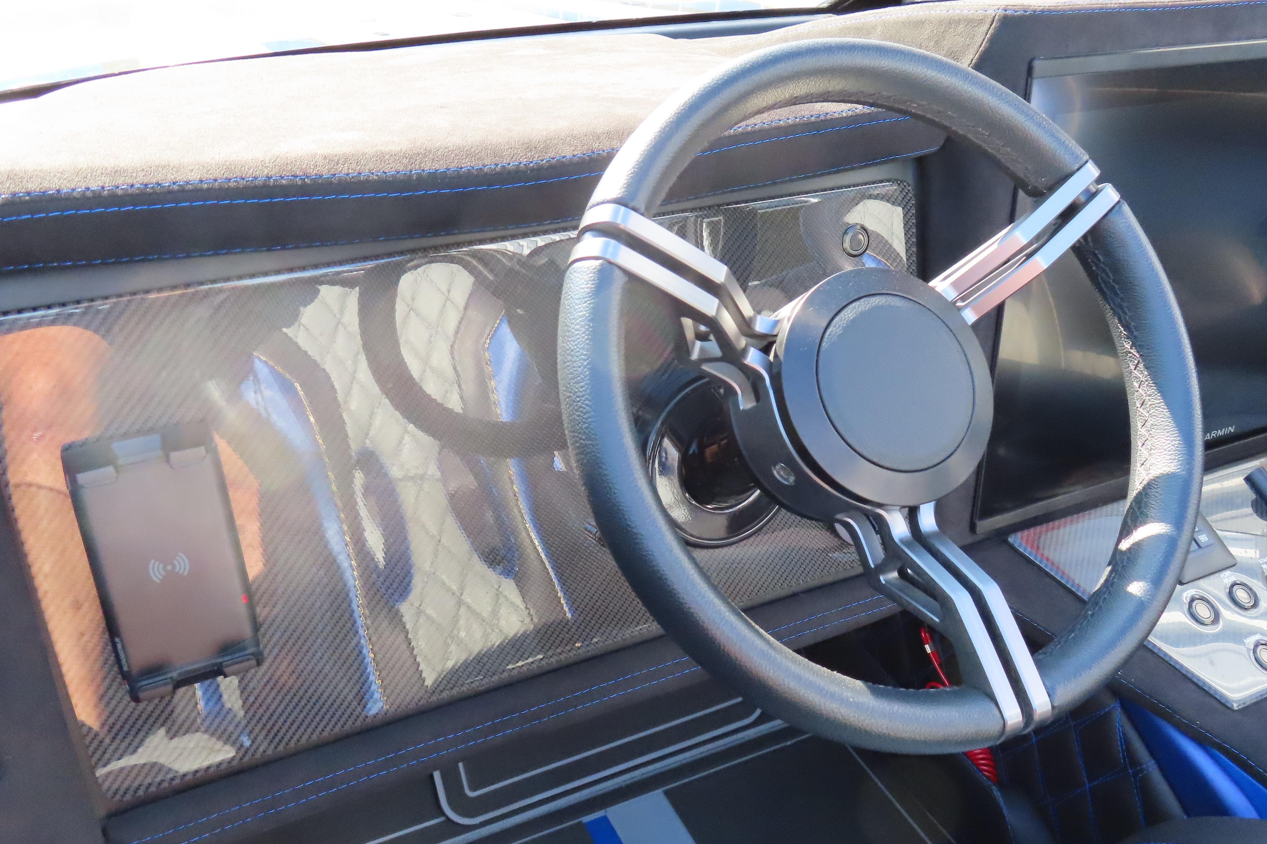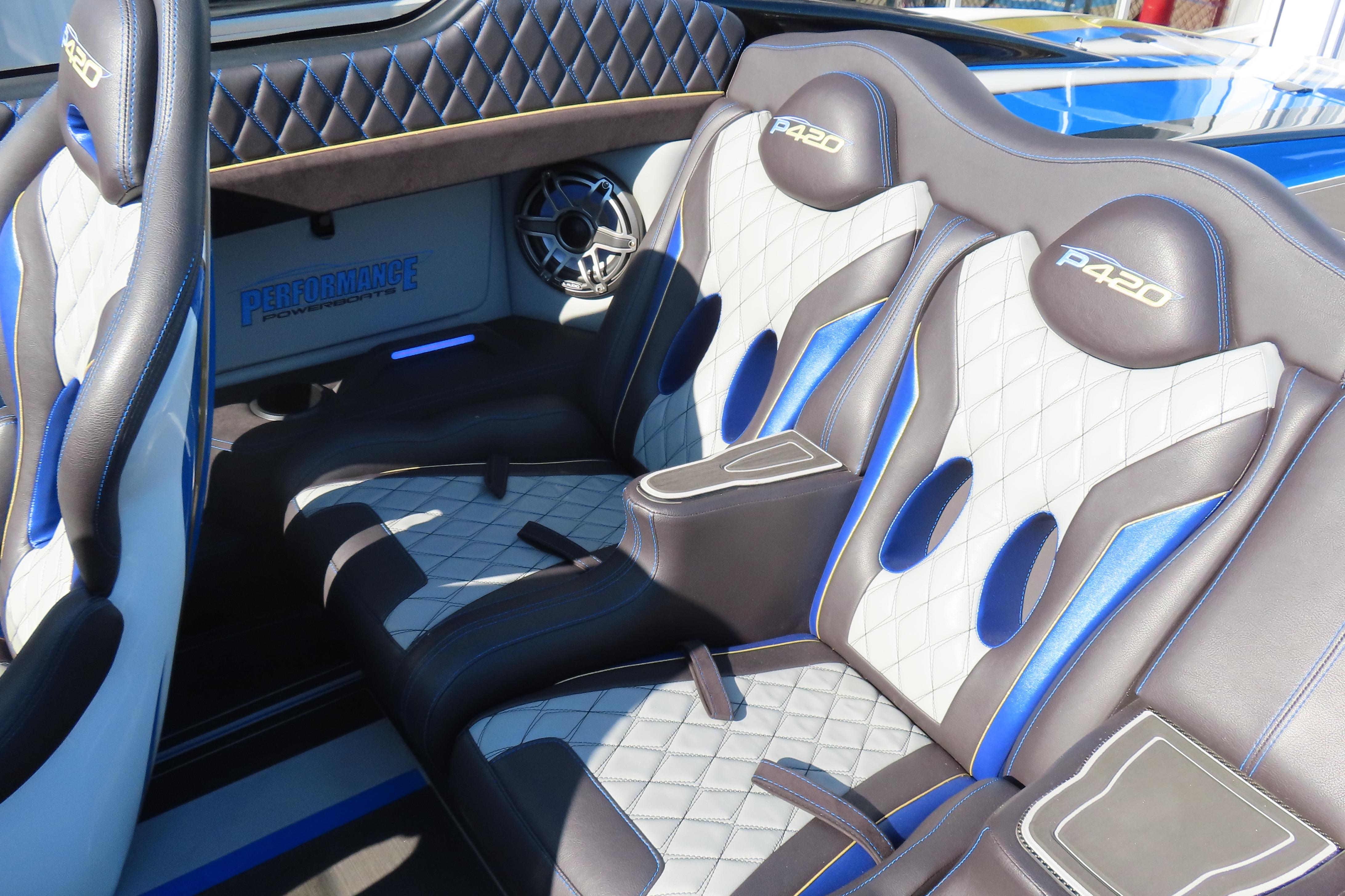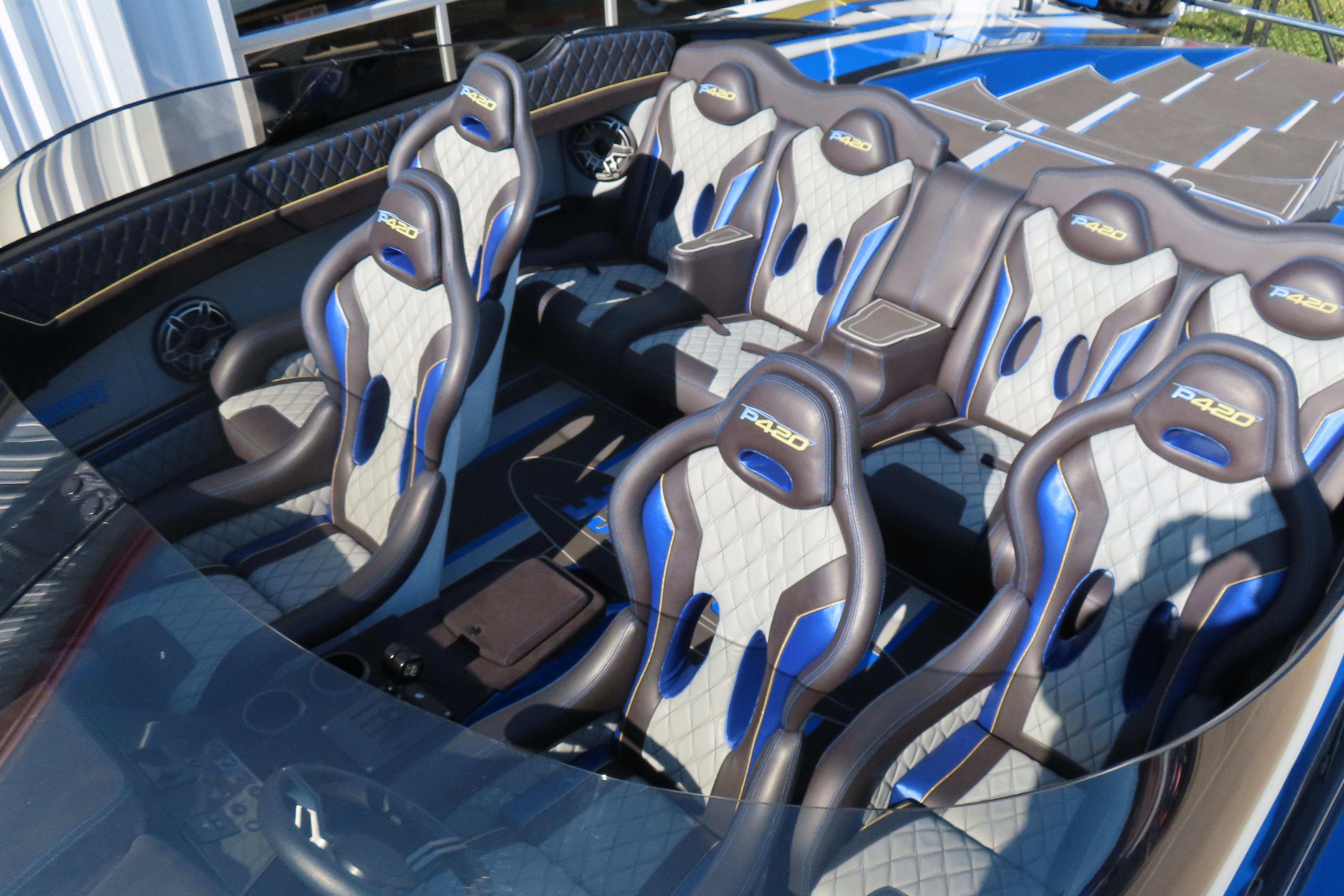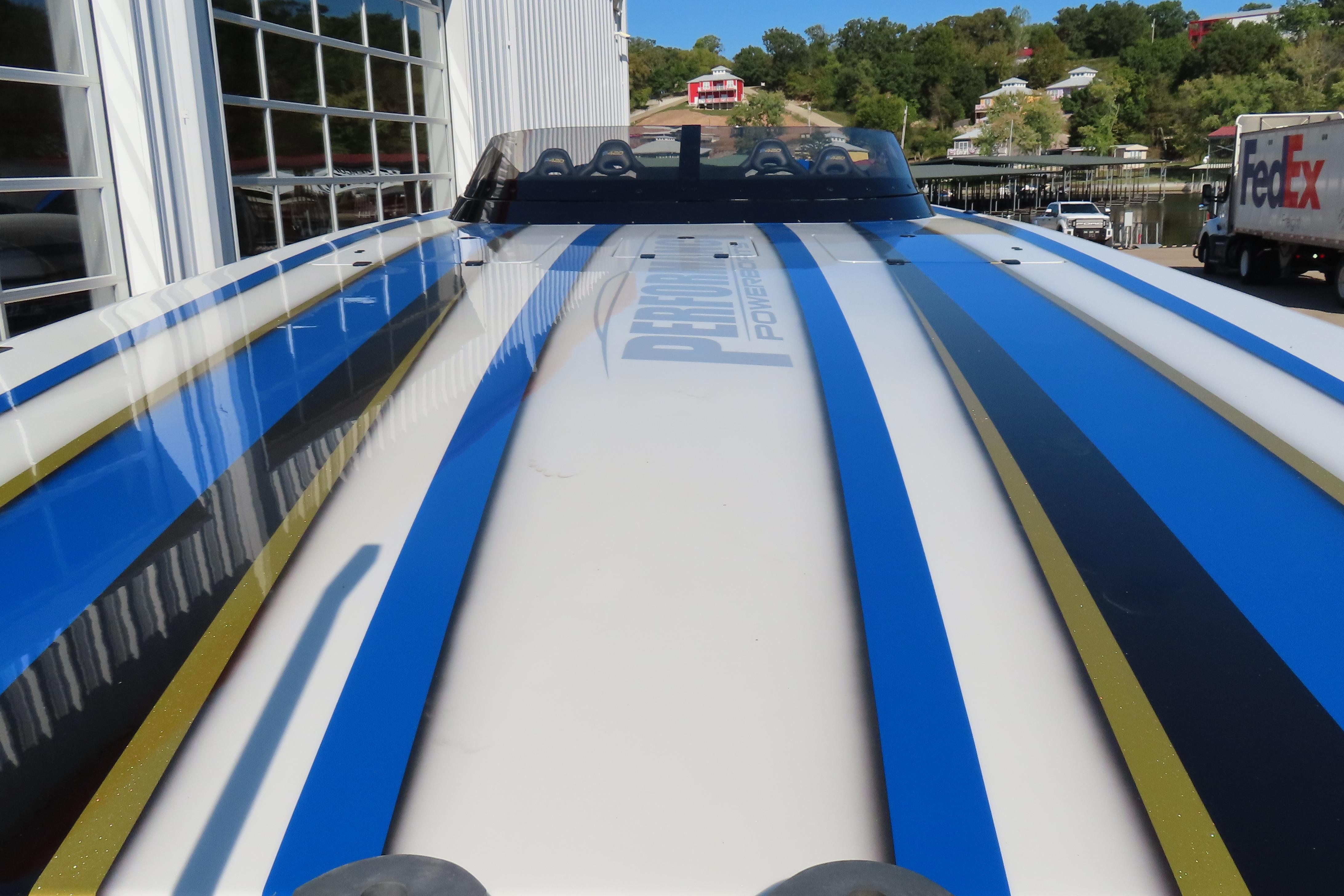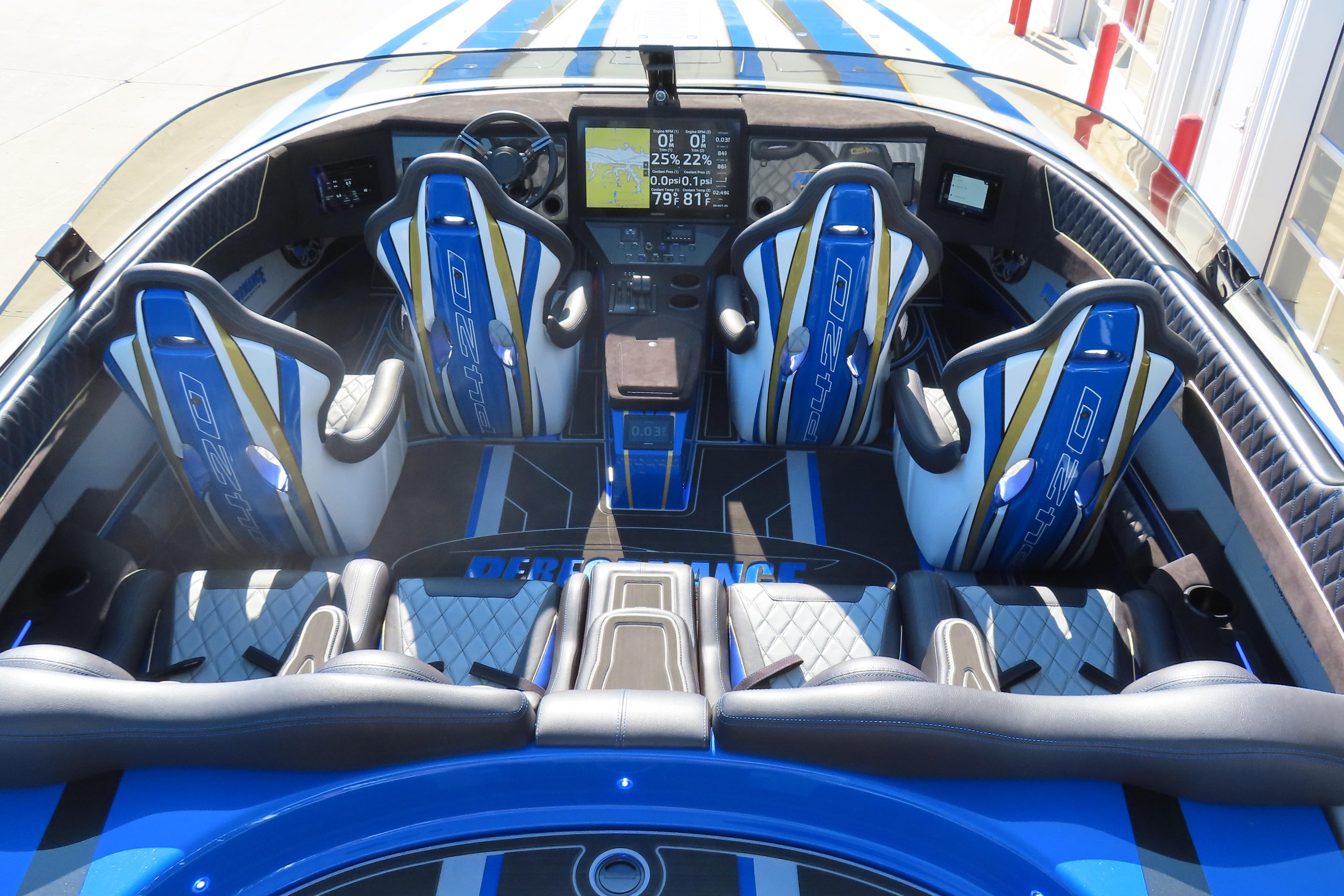 Carbon hull and deck lay-up, Vacuum-bagged e-Glass Epoxy/Carbon Fiber, Stringers & Bulkheads formed out of Foam Core/Carbon Fiber Reinforced, Faired Hull and Deck Joint, No Rub Rail, Wrap Around Windshield, Bocatech Switches, Lined Large Storage Locker Rear of Cockpit, Stainless Tie Bar, Billet Jack Plates, LED Nav and cockpit lighting, 3 AGM Batteries w/Remote Dash Switch, Bilge Pumps w/Automatic float Switches, 3 Bank Battery Charger, Cockpit blower vents, Illuminated Billet Cockpit handles, 8" Pop up cleats, QTY 6, Garmin 8622 22" Display Centered in Dash, Pull out Telescoping Ladder, Carbon Fiber dash panels, Cup Holders Qty 8, Mercury DTS Throttles and Shifters, Fire Extinguisher with Billet Mount, Sea Dek Flooring, Custom 8 person interior, Alcantara accents, Ultra Leather and Suede, Storage Compartments in cockpit with Performance logo, Fusion Head Unit, JL Multi Channel AMP, Speakers Sub and box, Shadow Caster Underwater lights, cockpit and Bilge lights, Tilt Steering, Isotta Steering wheel, Vessel View 903, 2 Garmin Rear facing cameras, Dash Blowers, Power Footrest, Mercury CNC 5 Blade Cleaver Props, Wireless Phone Chargers, Cockpit cover, Myco Aluminum Trailer Included!
