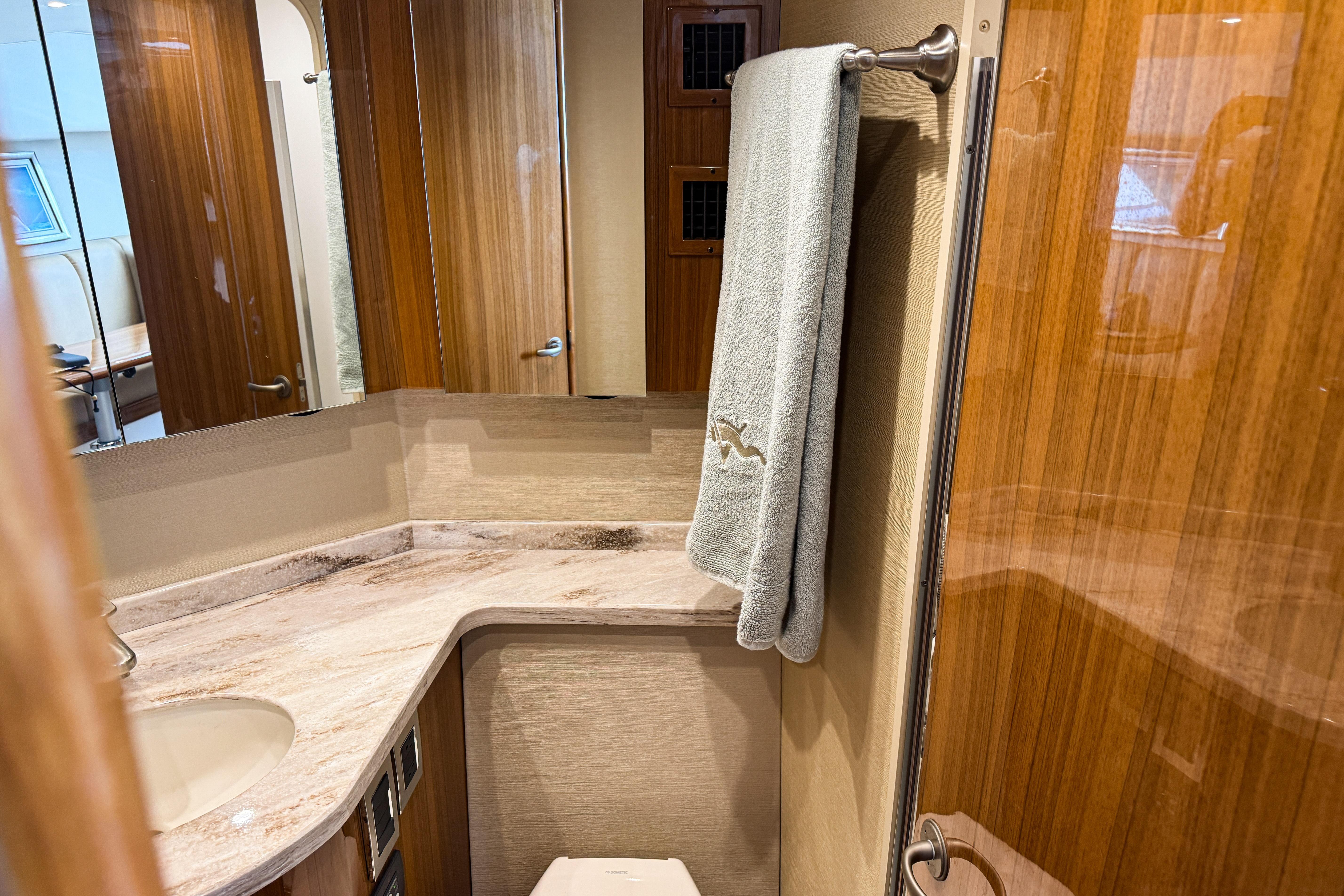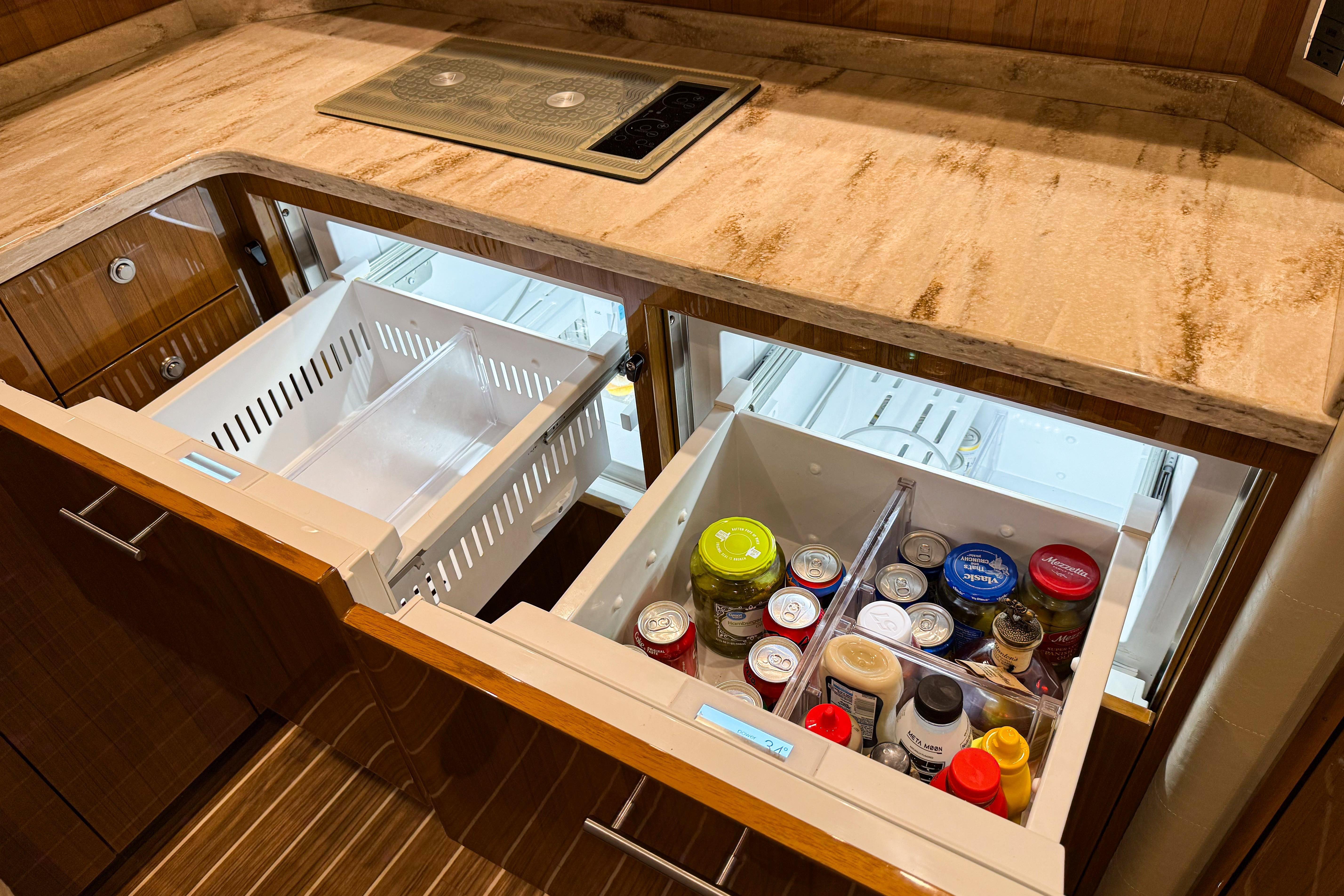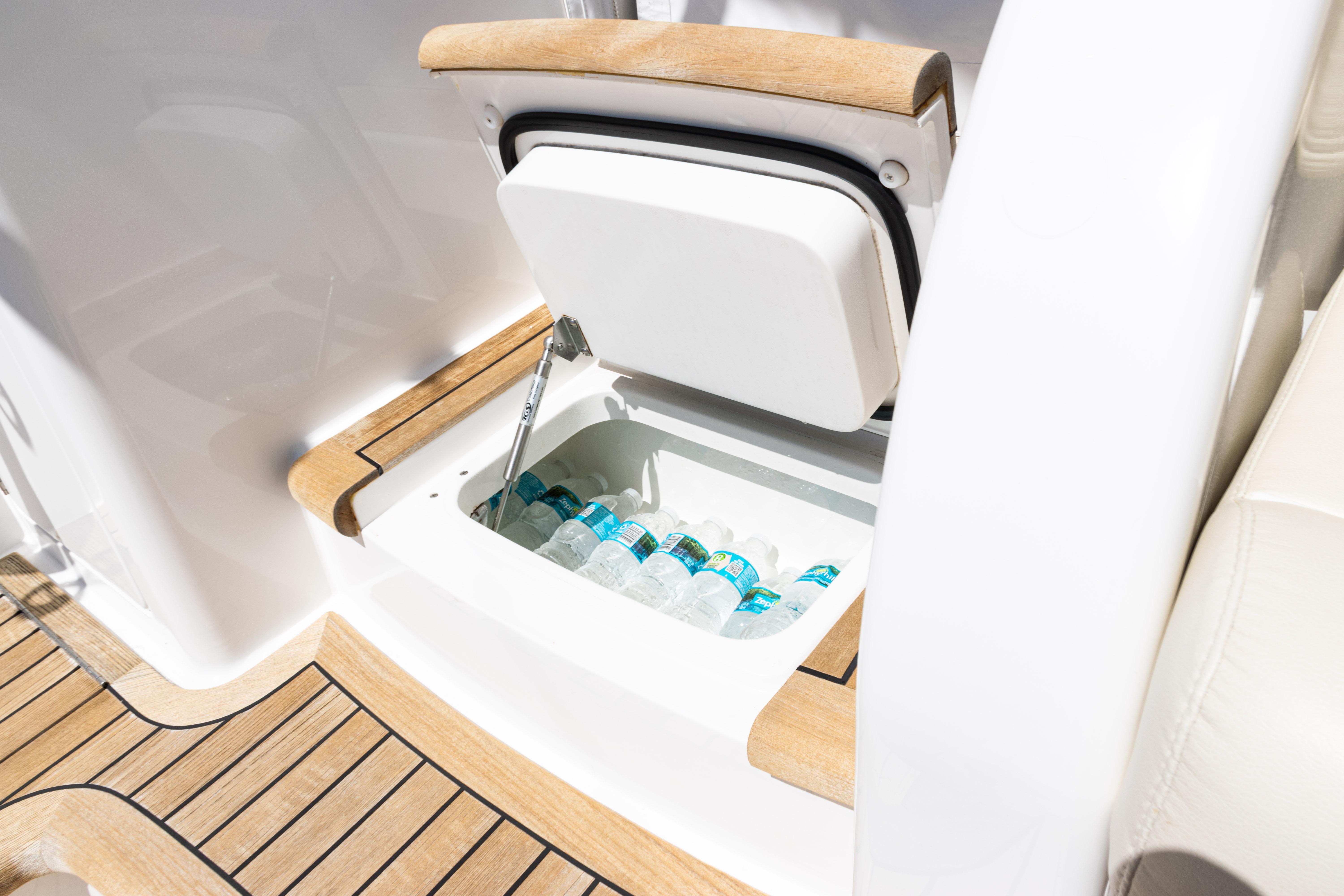 With a 16'4" beam—the widest in its class—the salon offers an inviting, open layout ideal for relaxing and entertaining. A 28-inch flat-screen TV and multi-directional stereo system enhance onboard comfort.