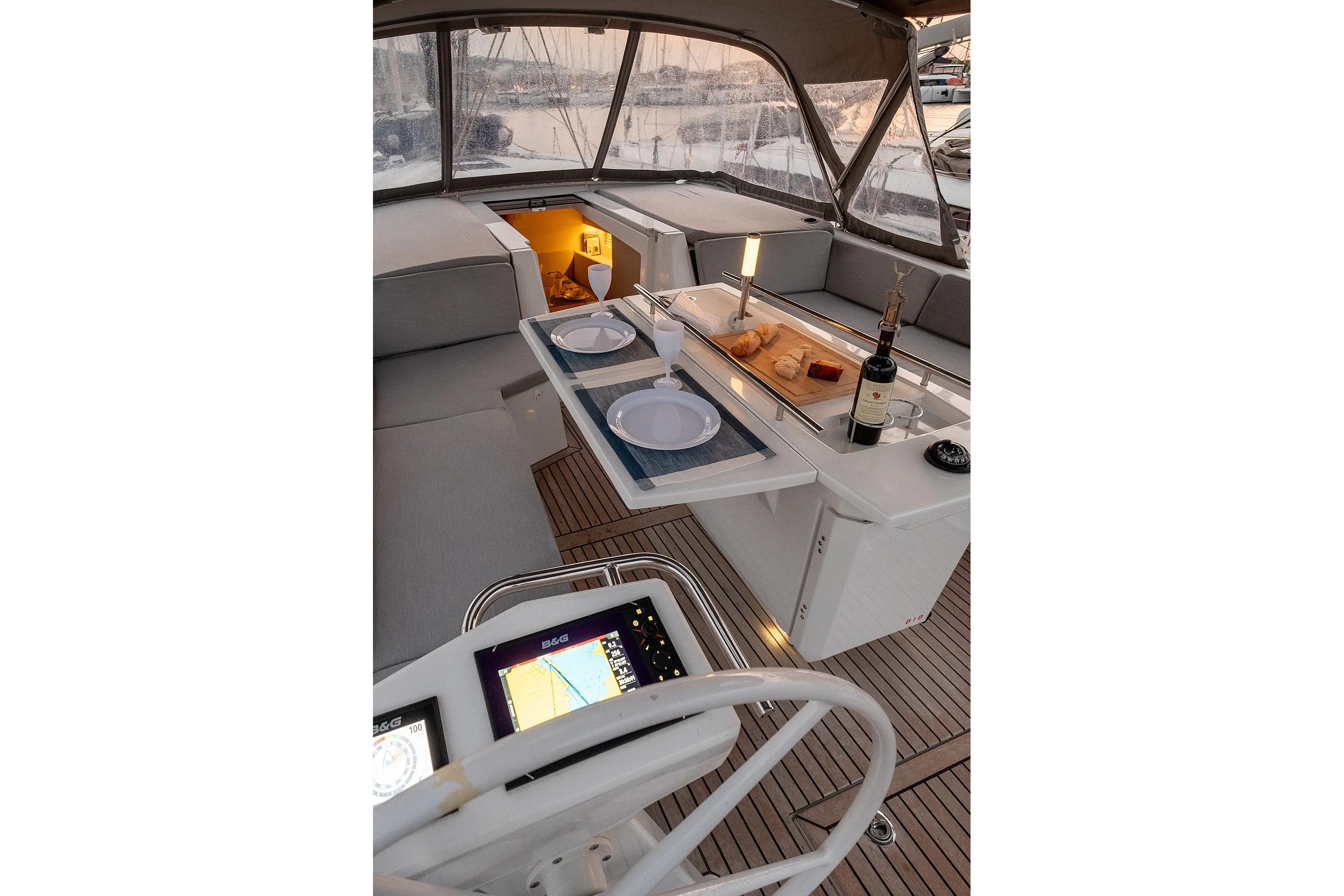 Cockpit: Teak slatted solid wood floor, Luxe cockpit table with storage, cockpit cushions
