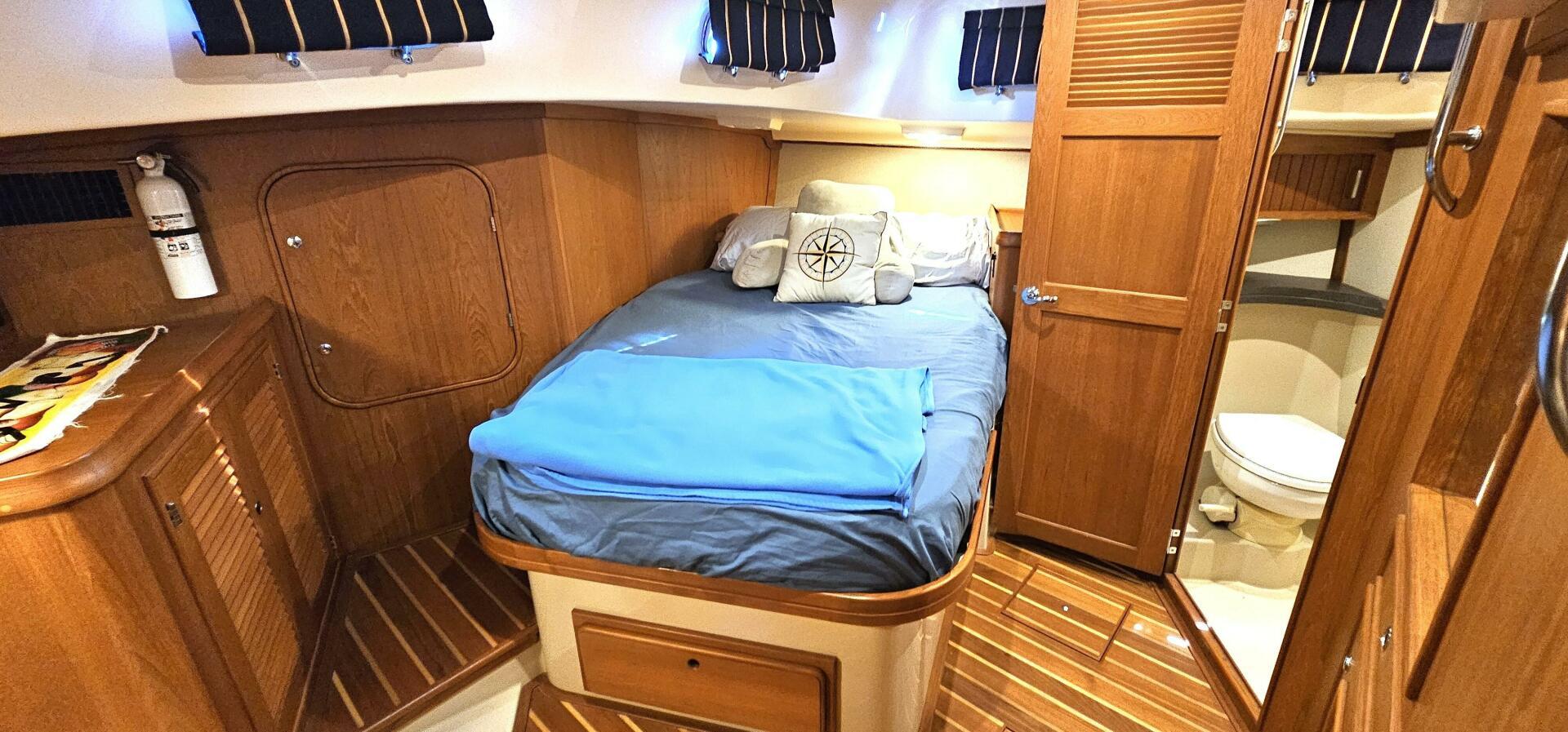 - Forward stateroom with island berth, top of the line Handcraft System #5 folding mattress, privacy doors to forward passageway and head compartment. Cedar-lined hanging locker and bureaus. Adjustable, dimable LED reading lights with USB ports throughout.