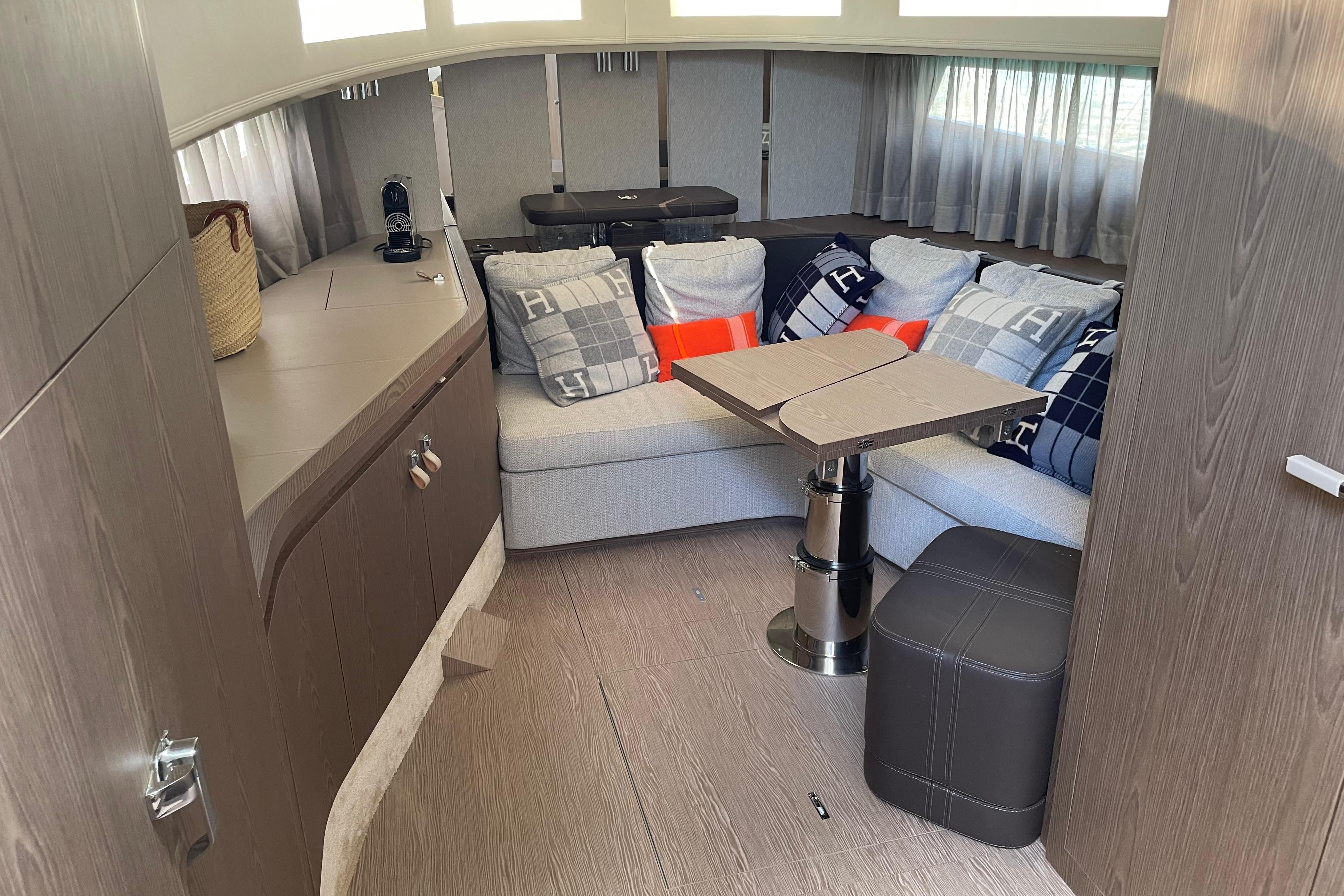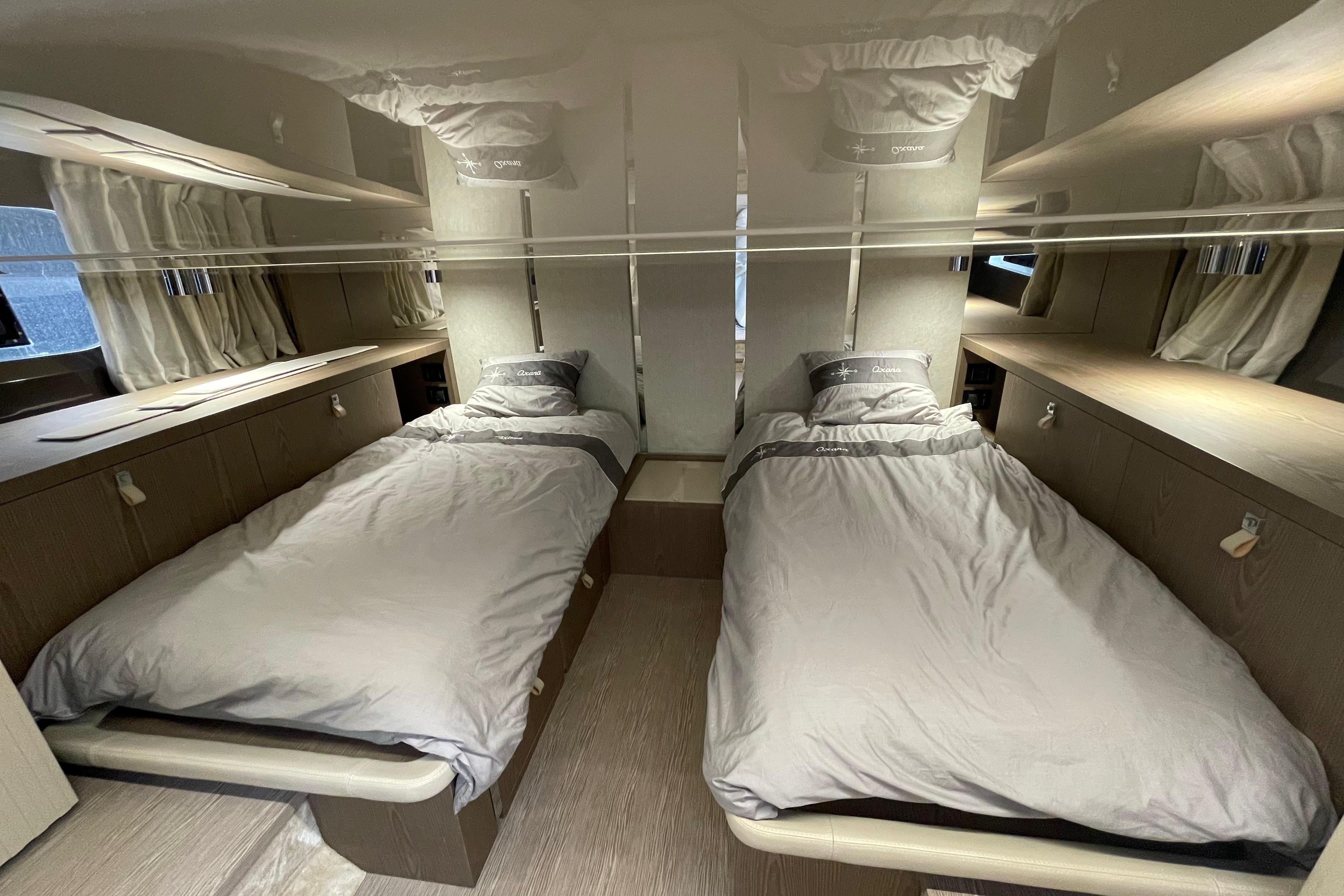 Embarcación con equipamiento standard, en versión cabina a popa con dos literas individuales y salón convertible a proa.