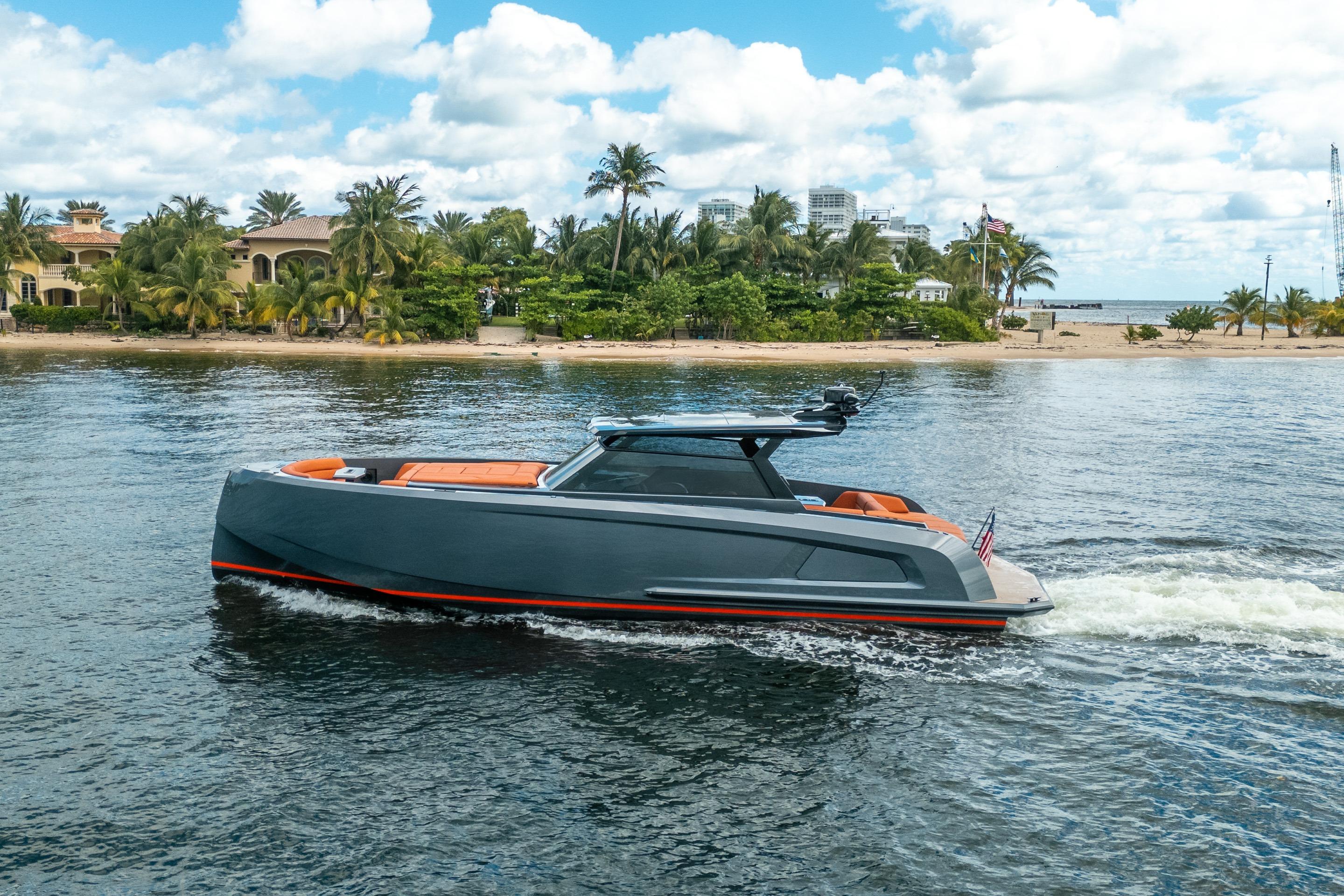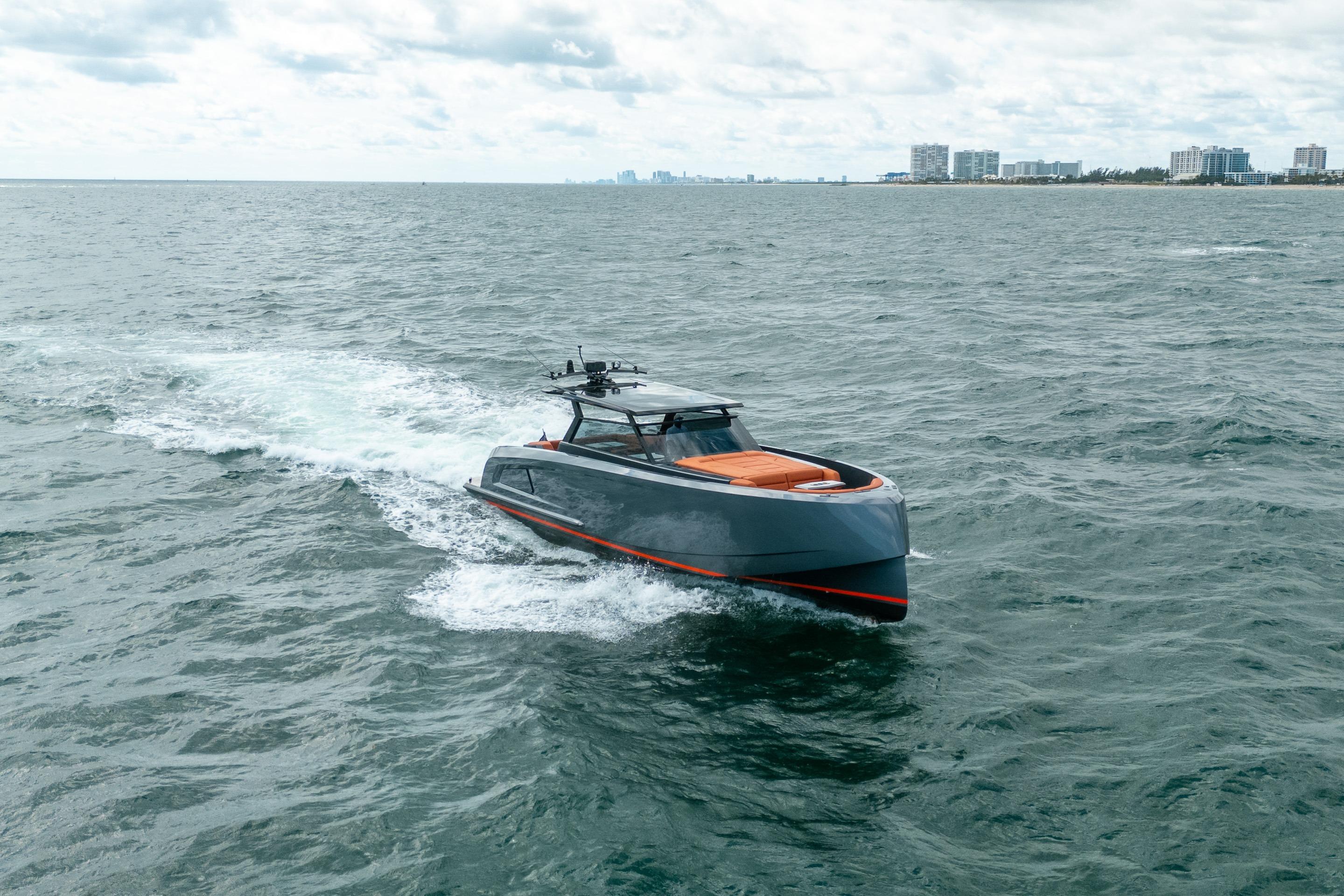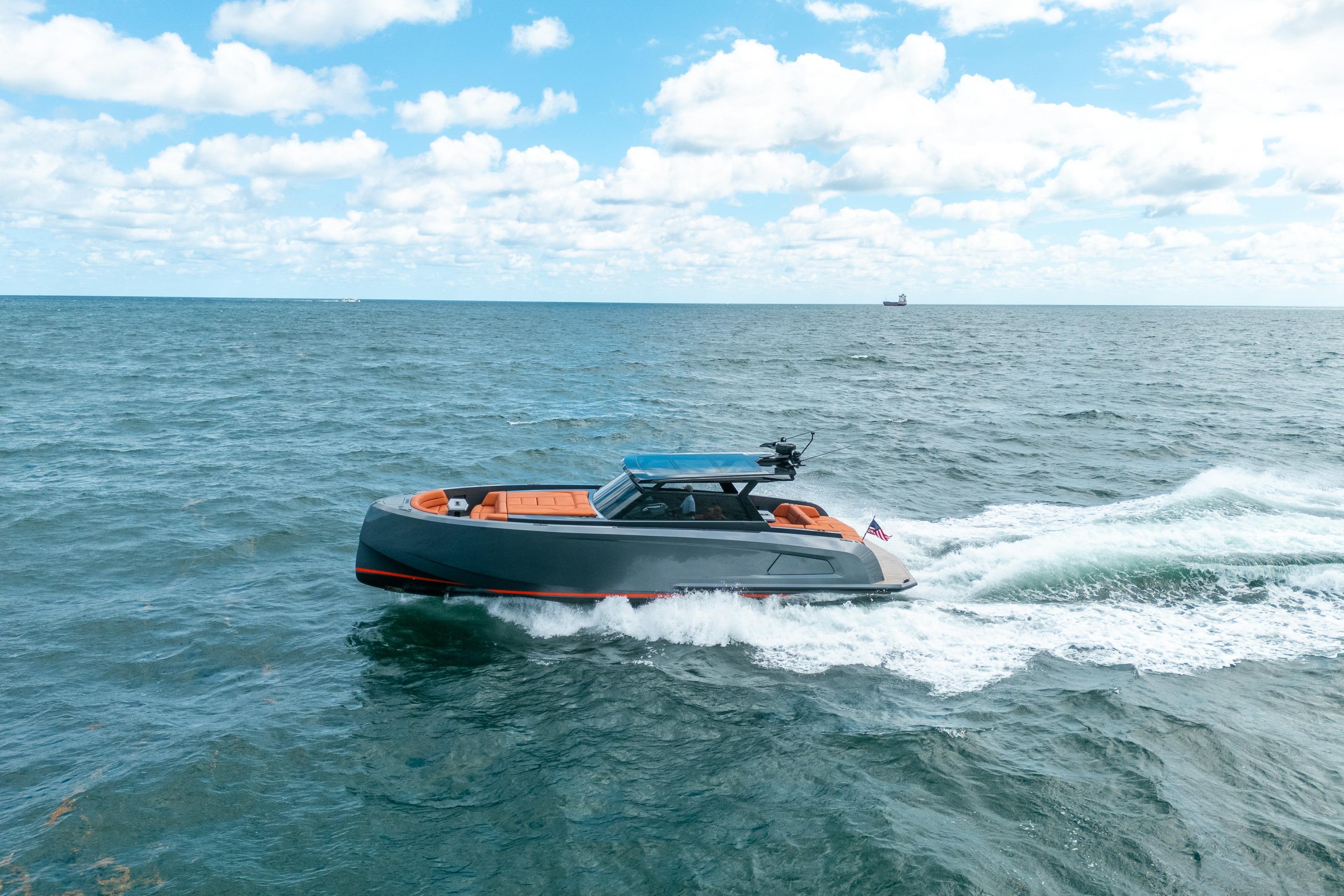 Turn heads everywhere you go with this stunning 2022 Vanquish VQ45, featuring a sleek metallic grey hull paired with vibrant orange upholstery. Blended with carbon fiber accents and the iconic embossed Vanquish emblems, this luxury day boat perfectly embodies the modern, high-performance spirit for Vanquish Yachts.