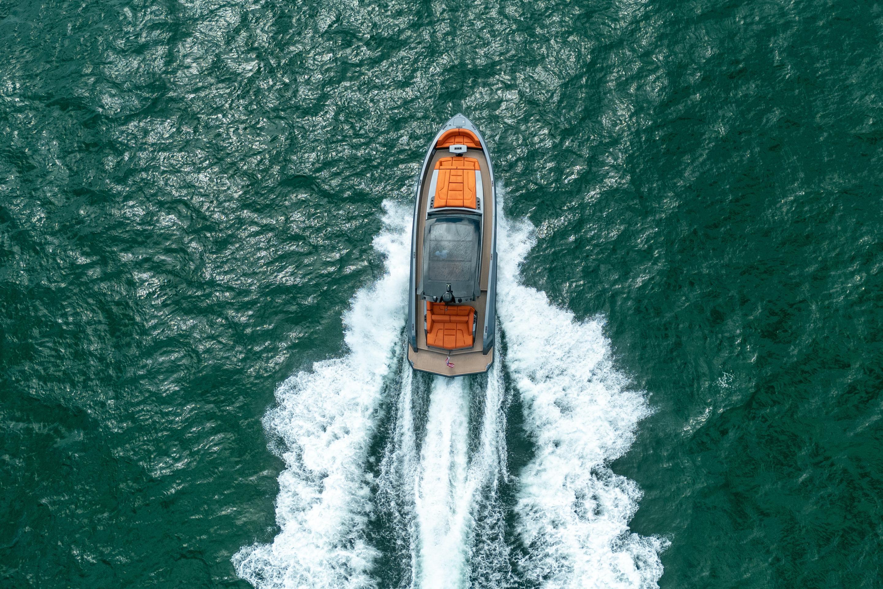 Custom grey metallic hull with vibrant orange cushions for a truly standout look